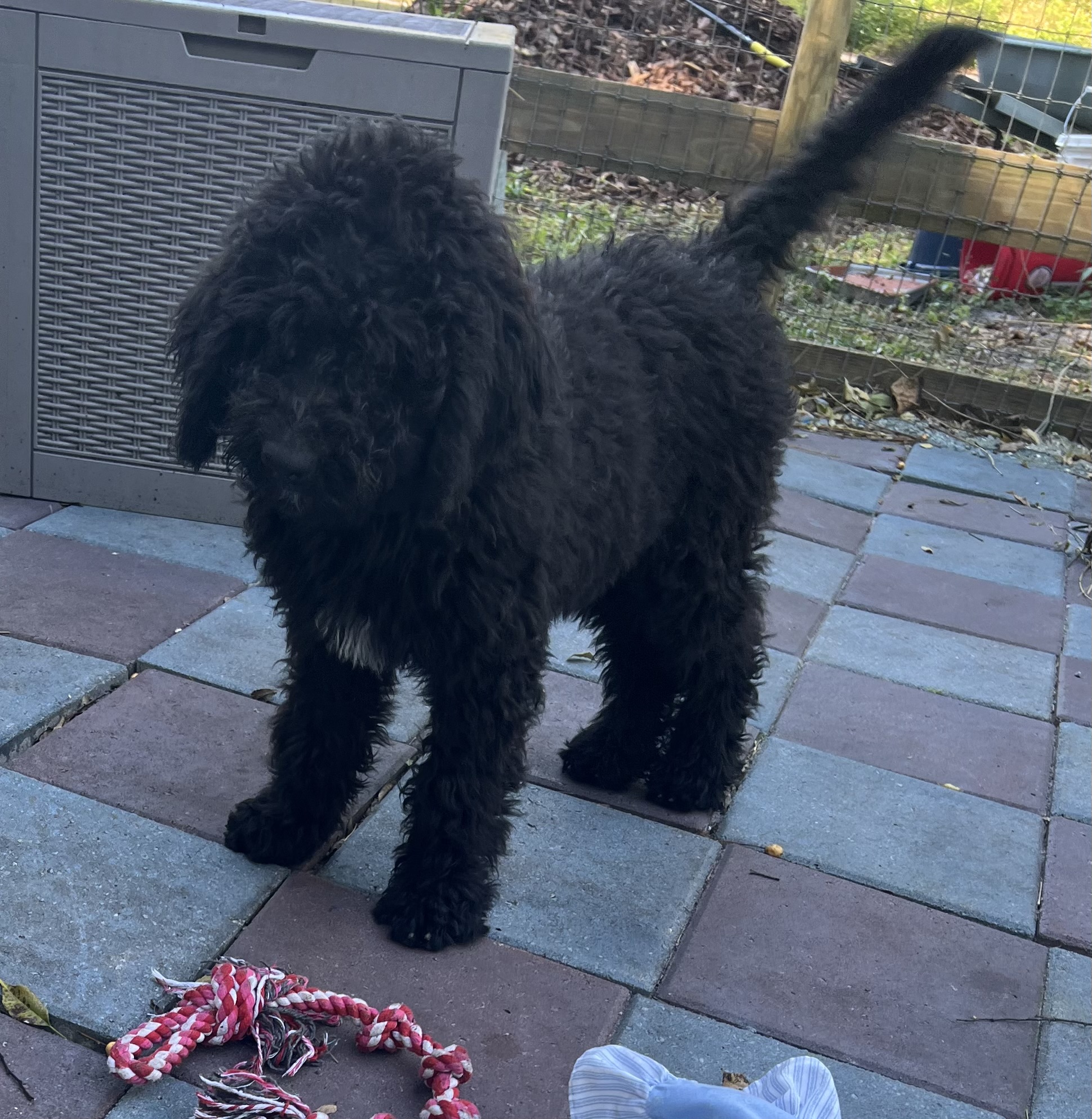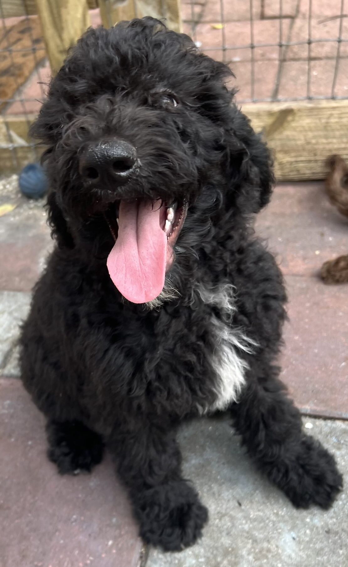 Aussie Green/White collar Girl: Multi Generation Standard Black Labradoodle