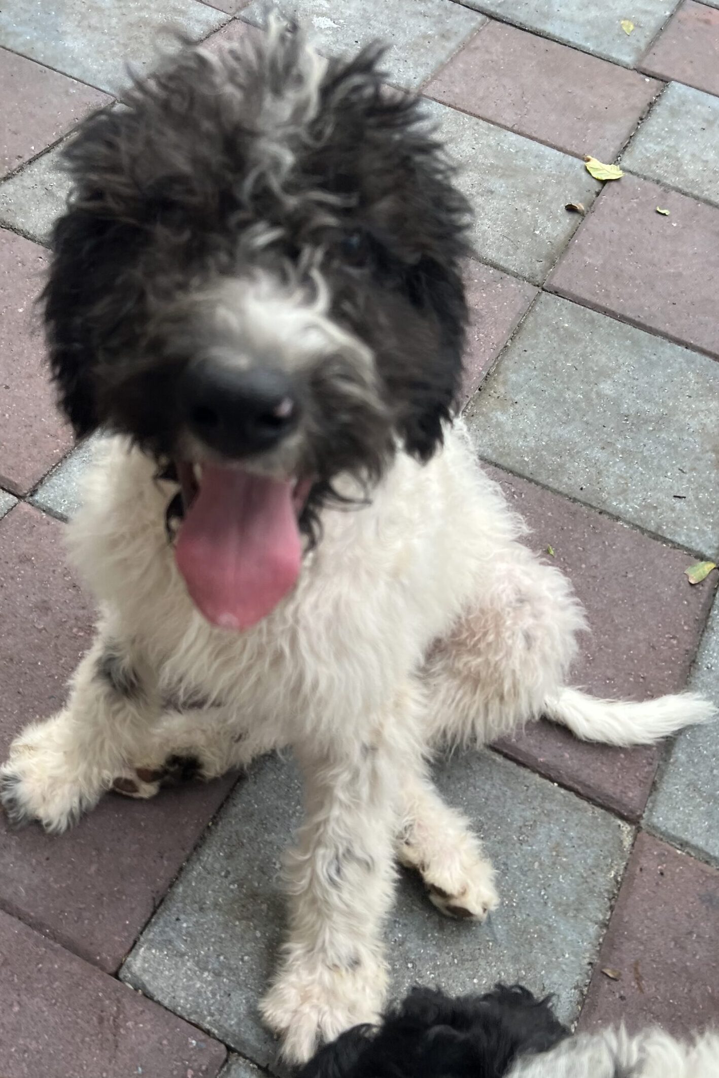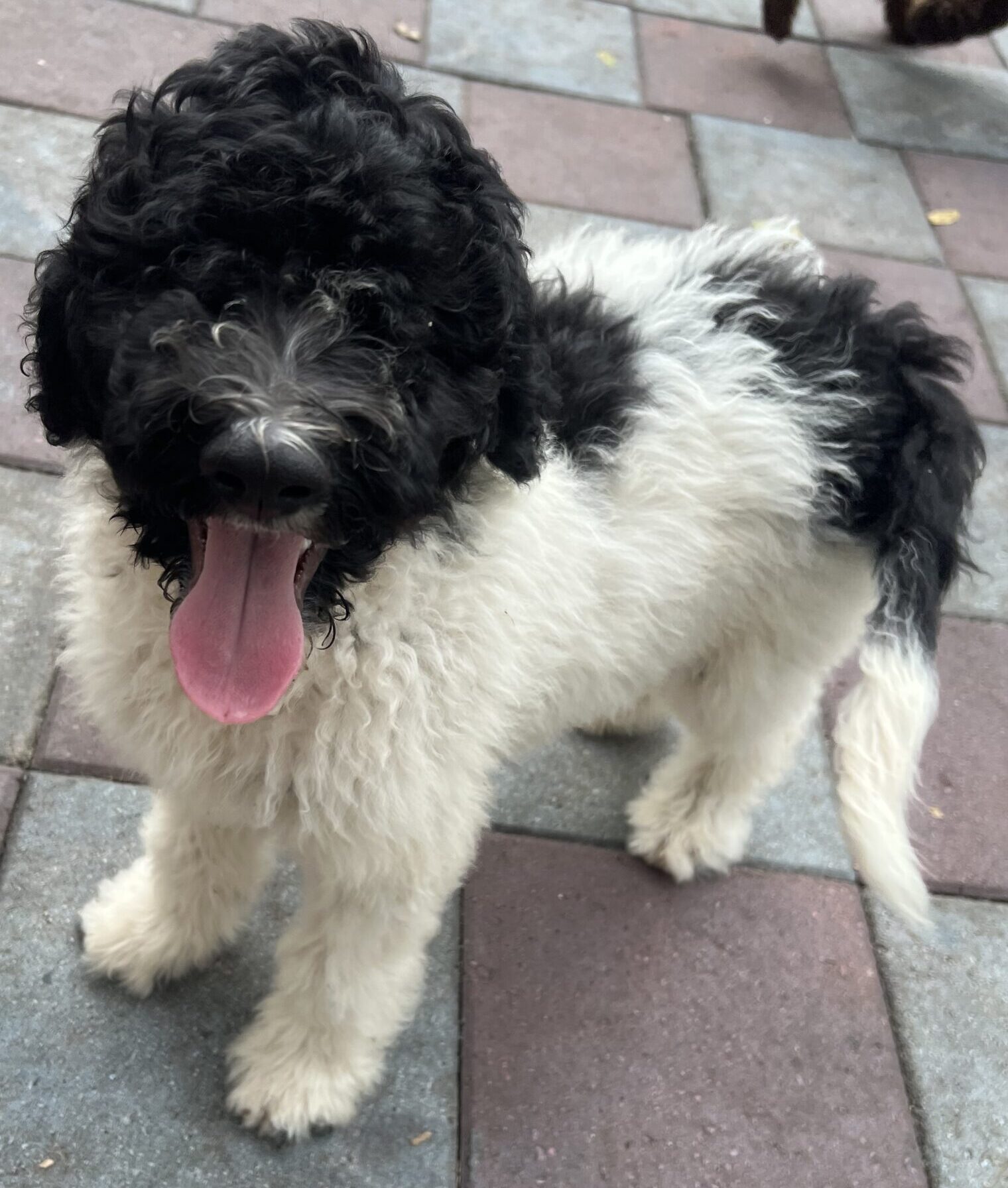 Xena Red collar girl: Multi Generation Labradoodle: Black with white chest some waves