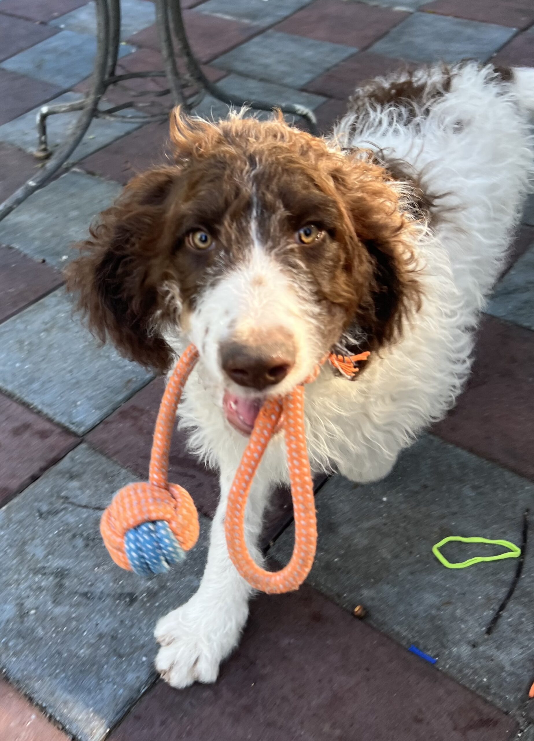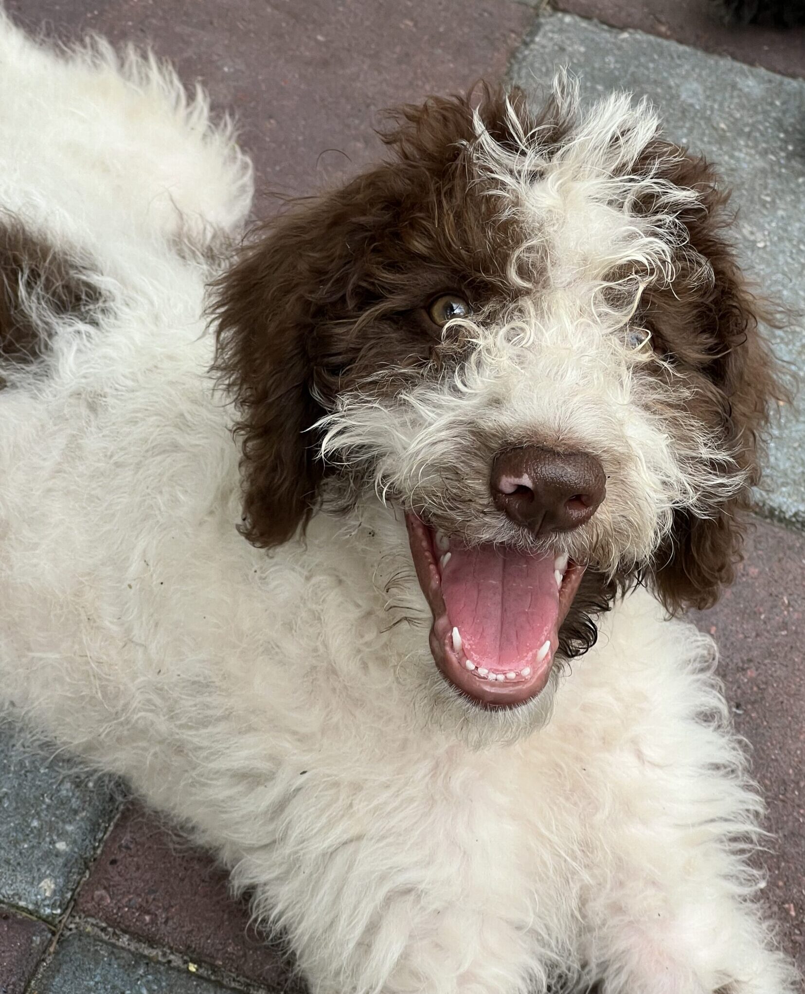 Xena Yellow/ Orange collar Boy: Multi Generation Labradoodle: Chocolate Parti few waves