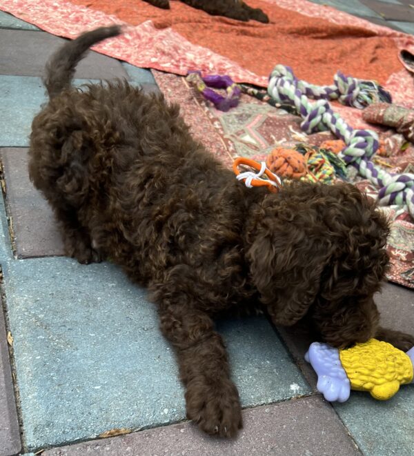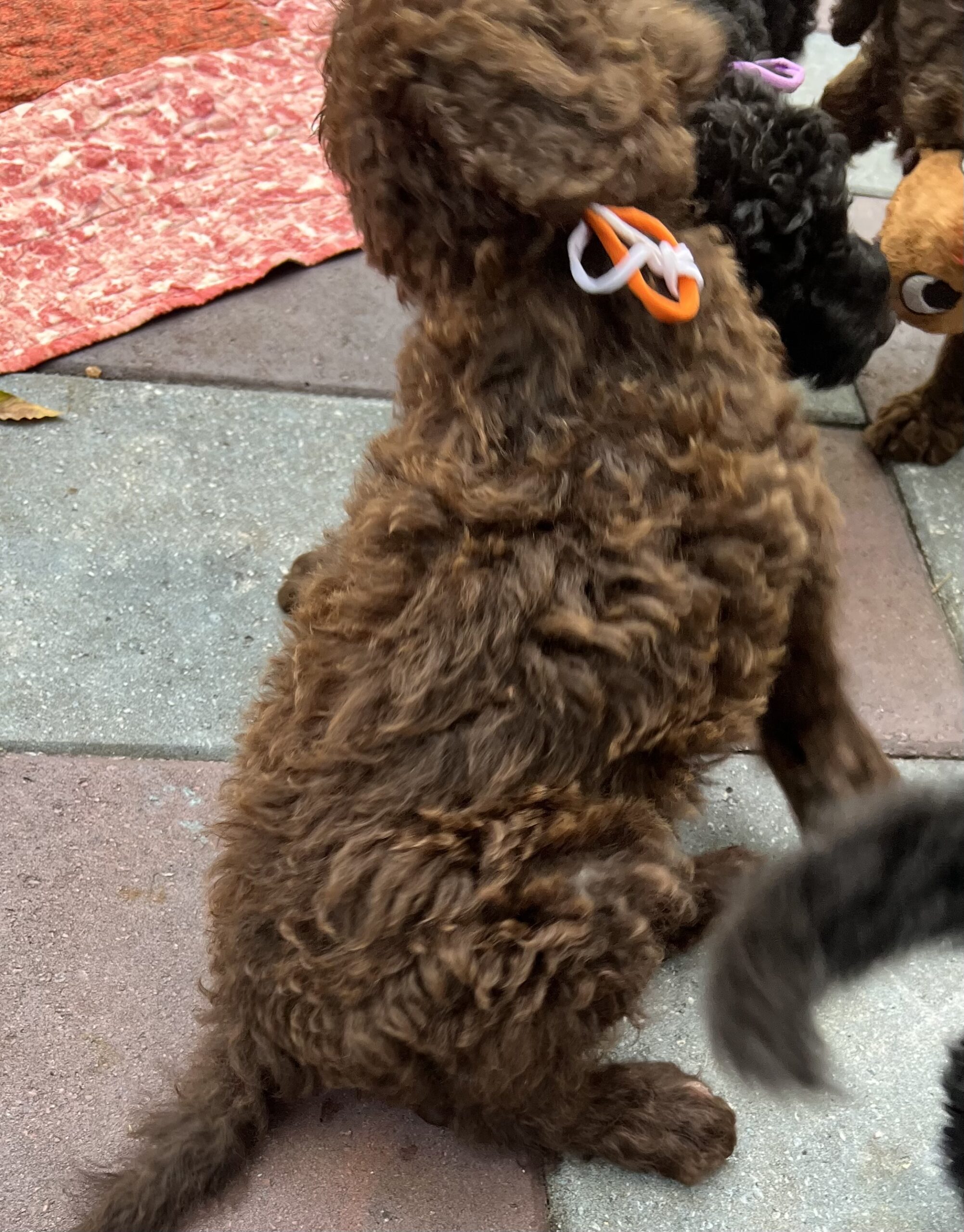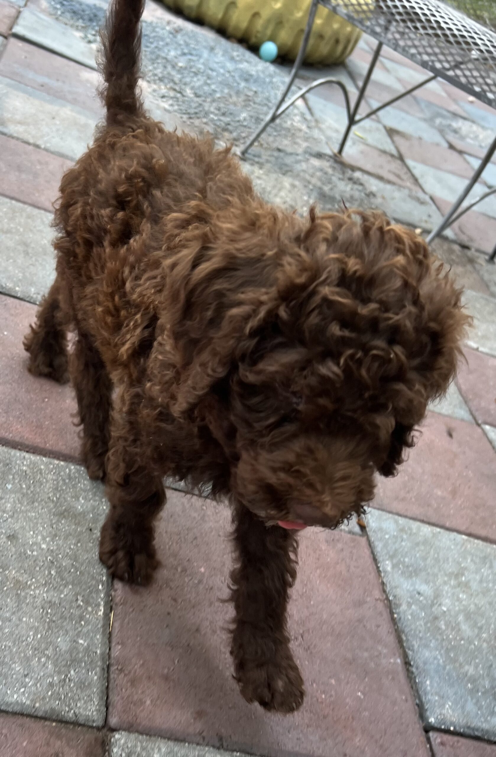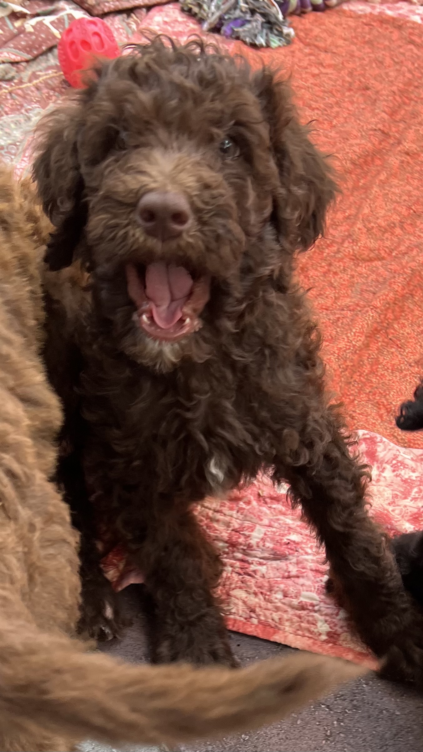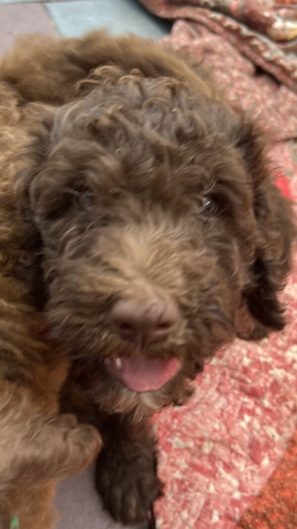 Gorgeous little chocolate boy with a curly non shedding coat and hazel green eyes