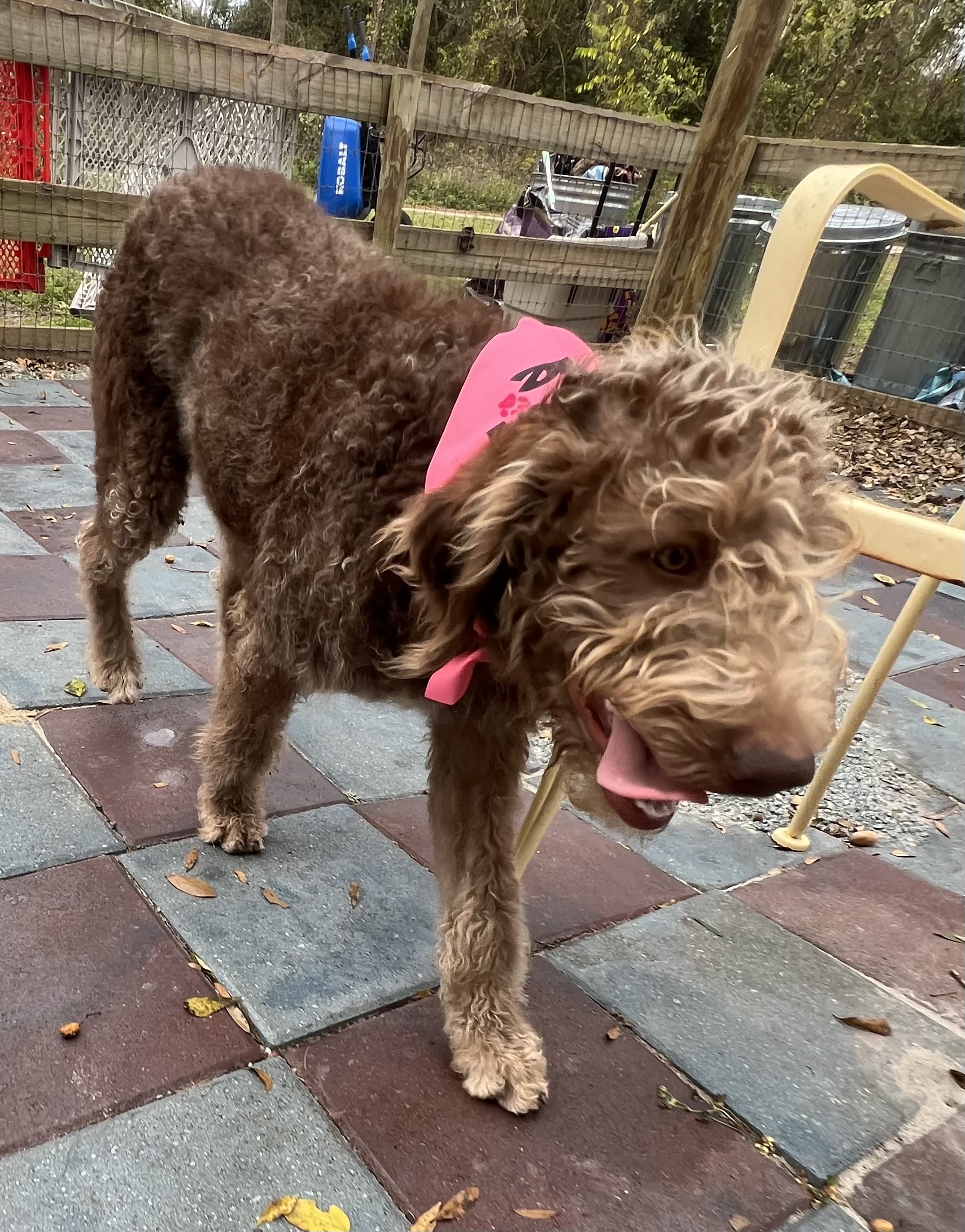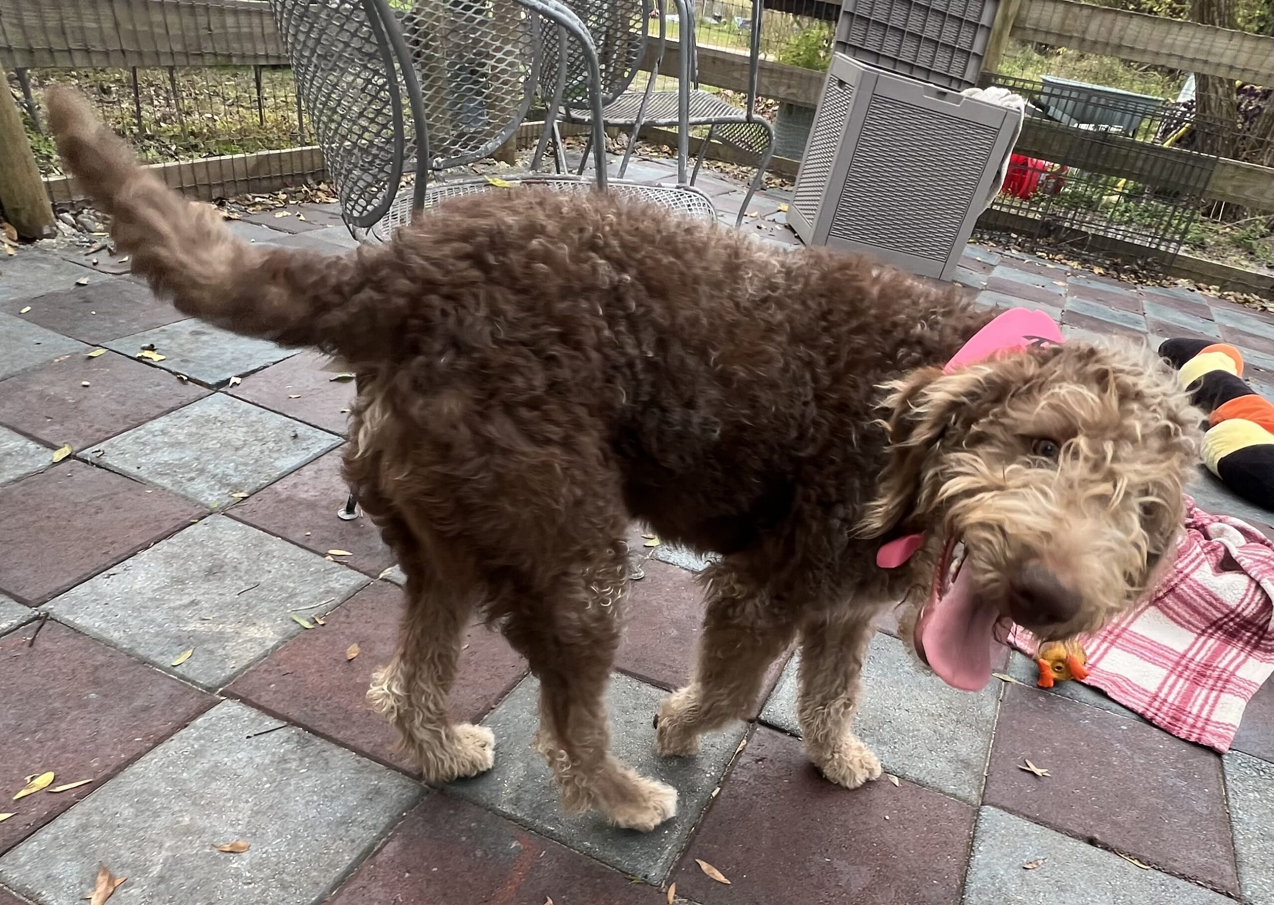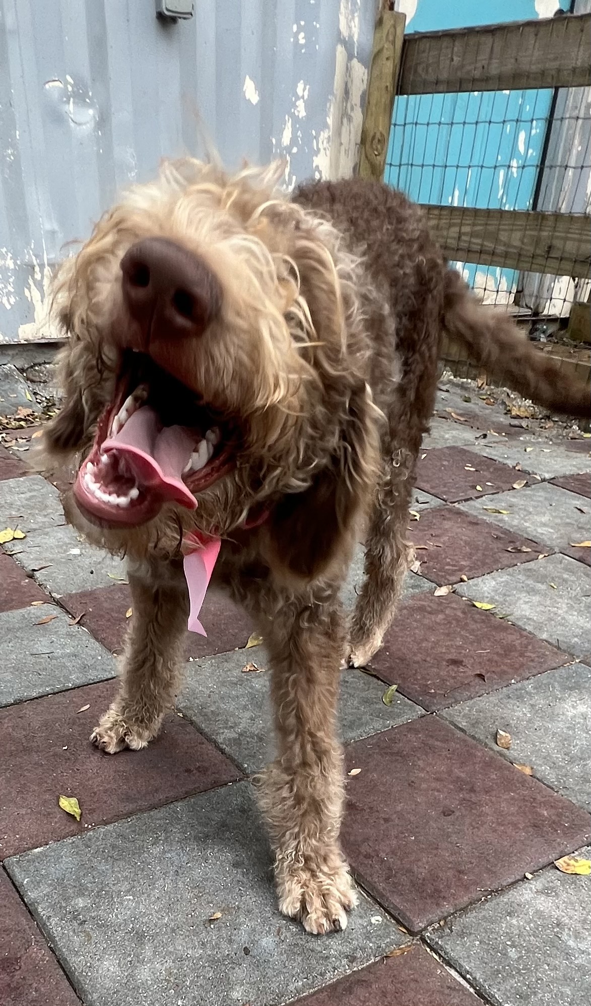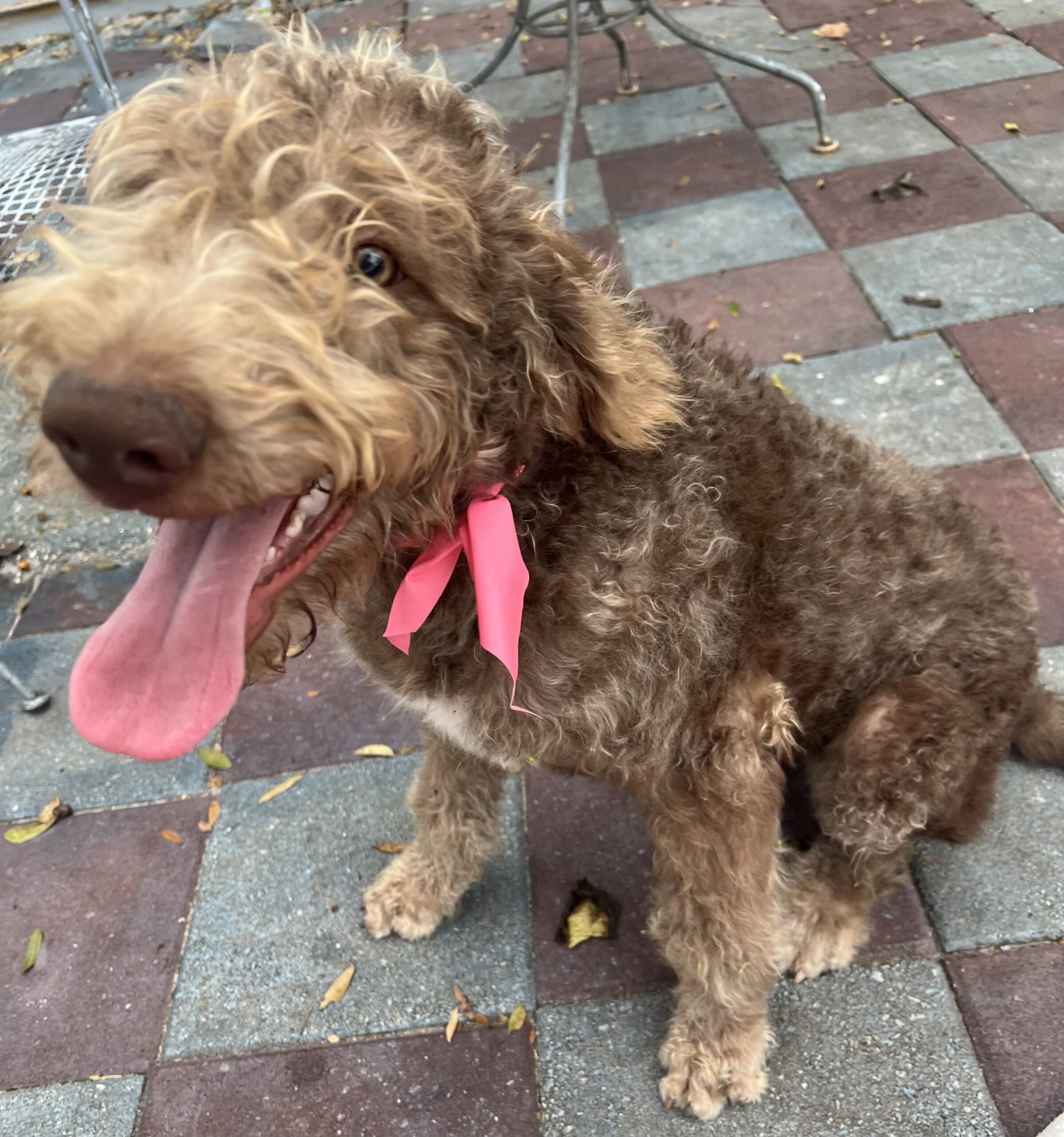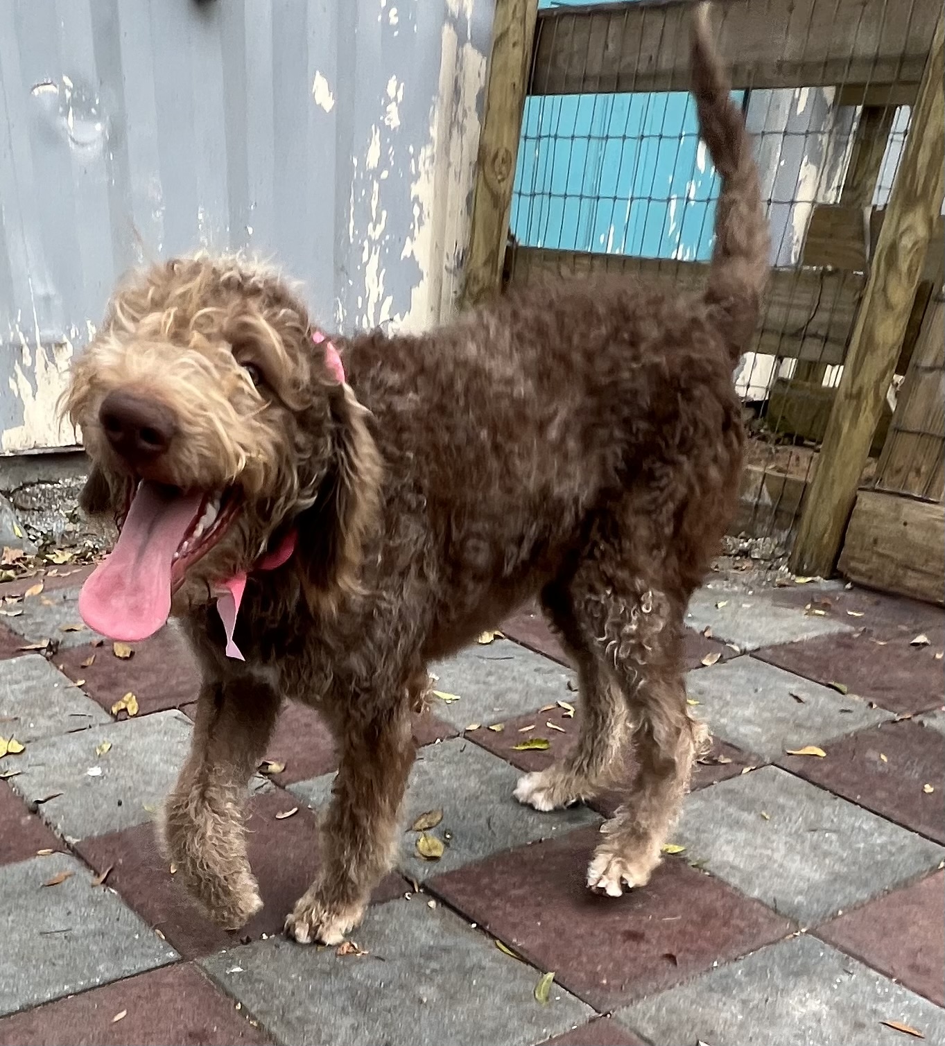Gorgeous chocolate girl with a wavy/curly very low to mainly non shedding coat and hazel green eyes!