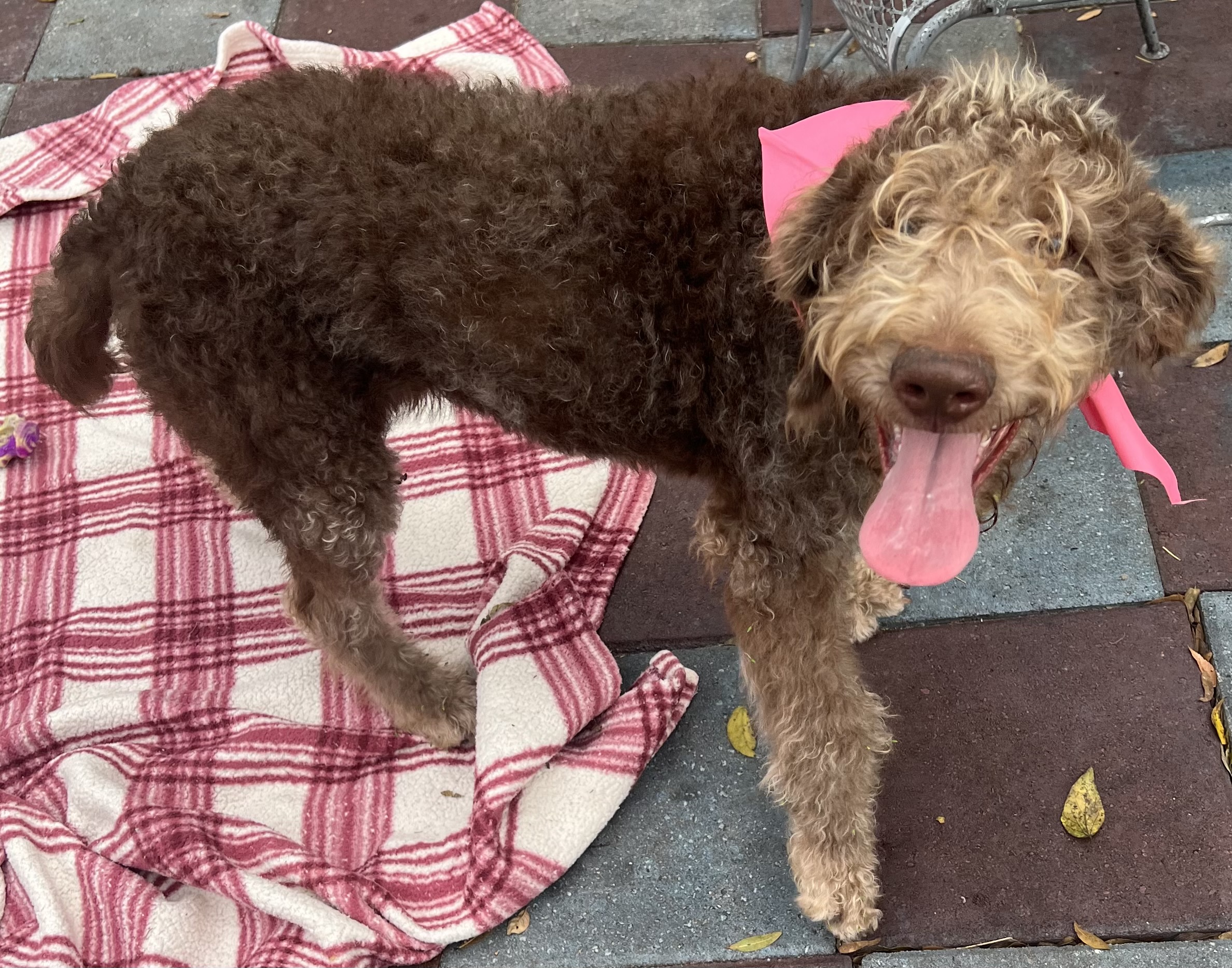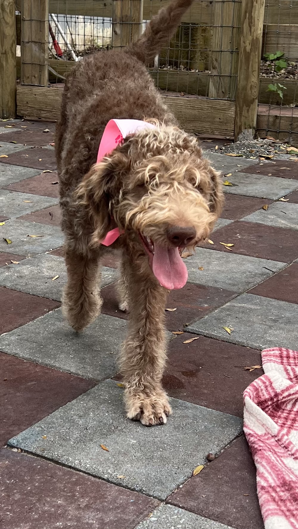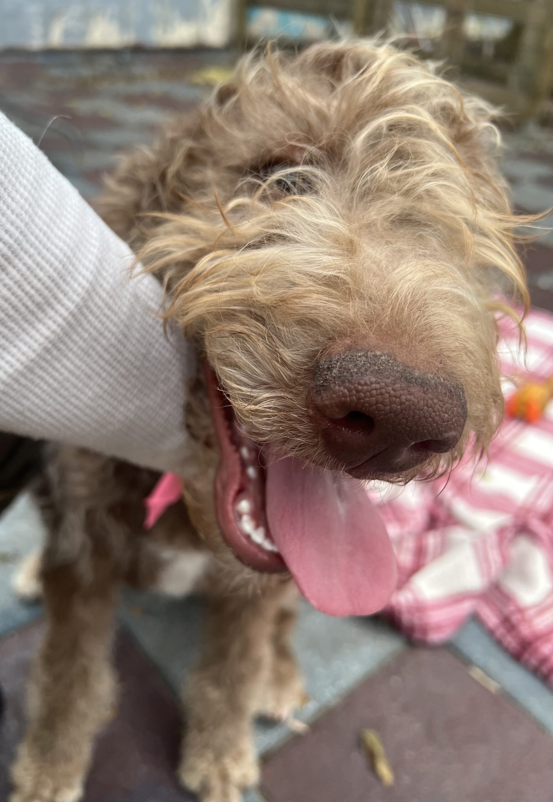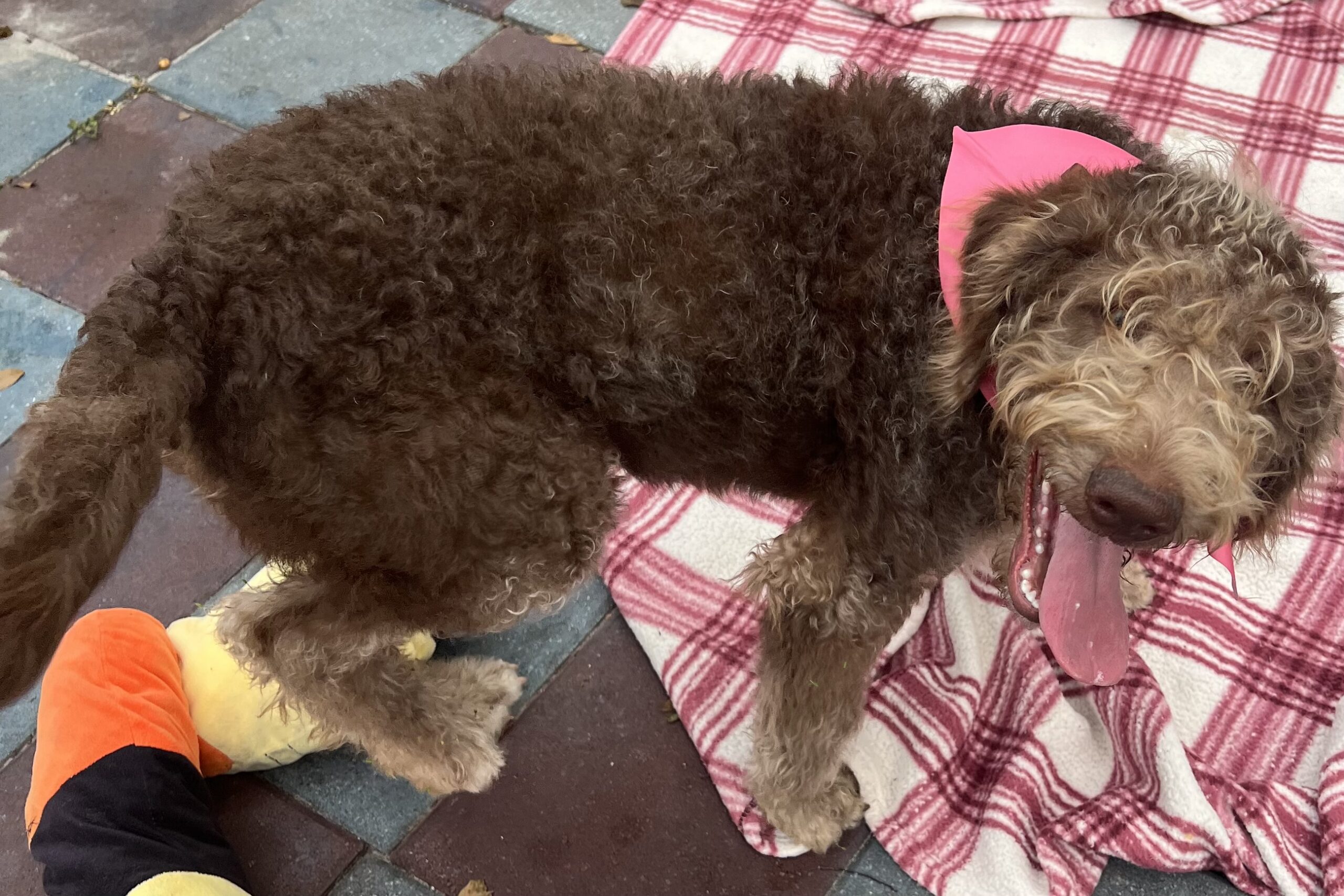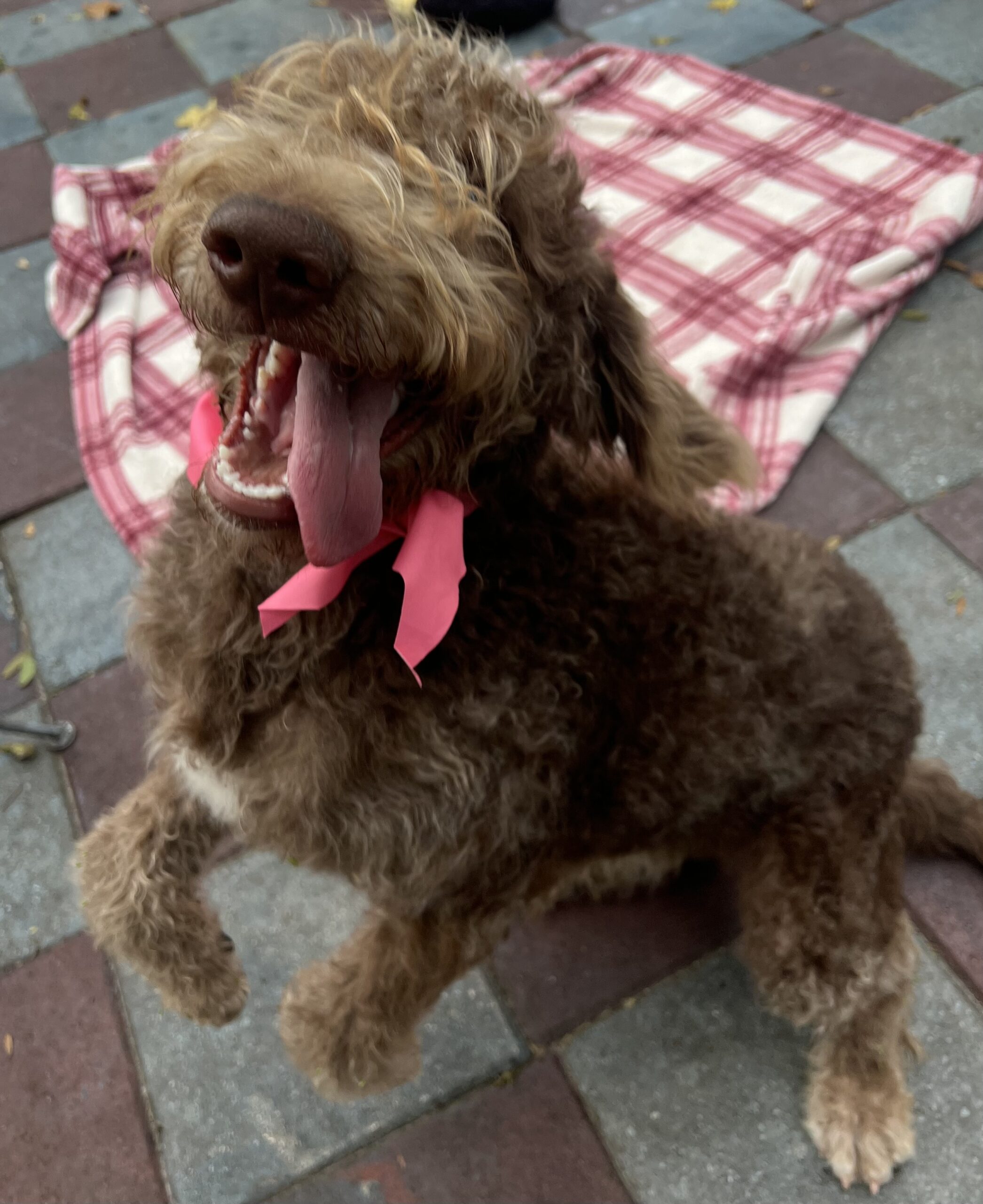 Gorgeous chocolate girl with a wavy/curly very low to mainly non shedding coat and hazel green eyes!