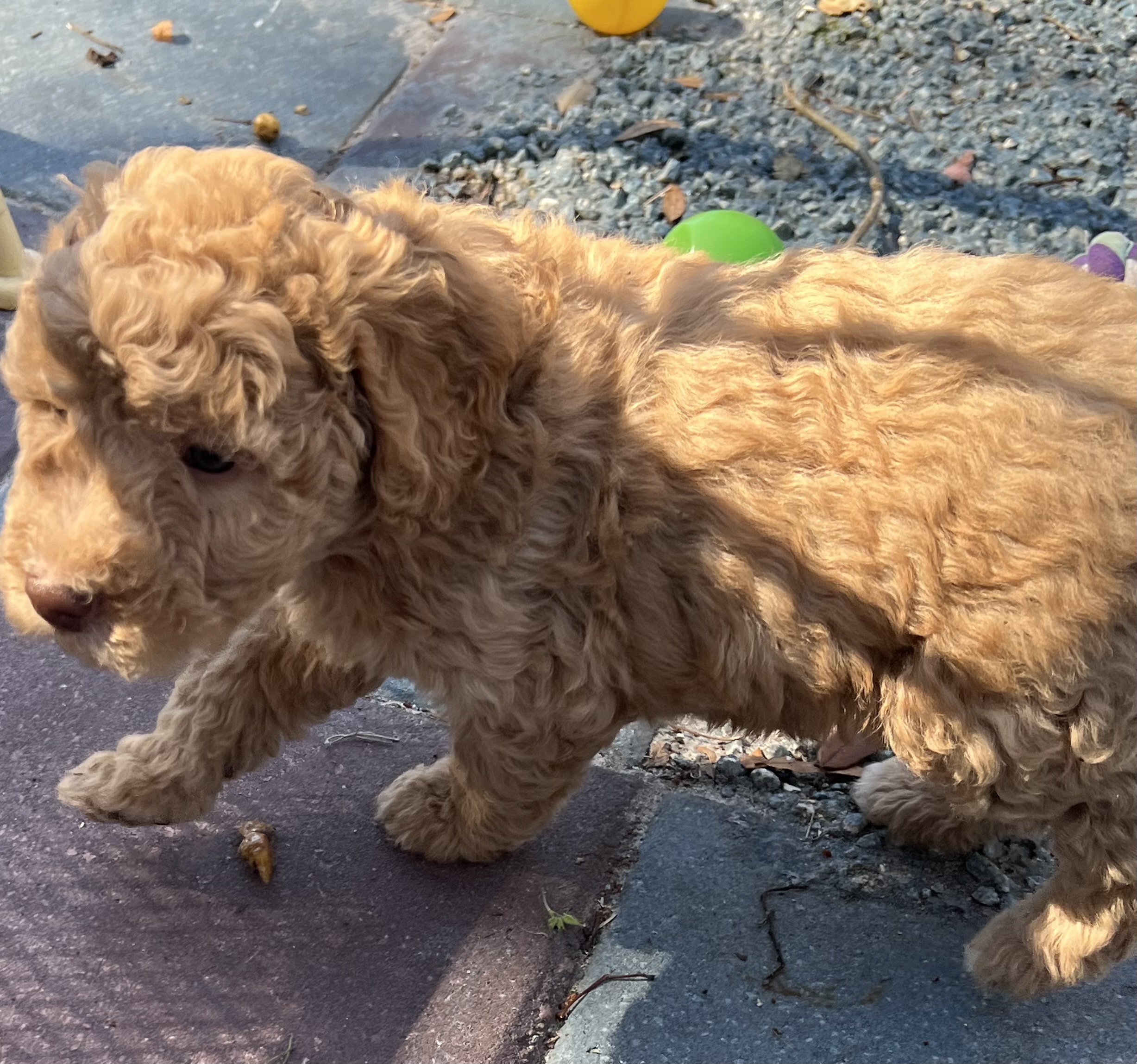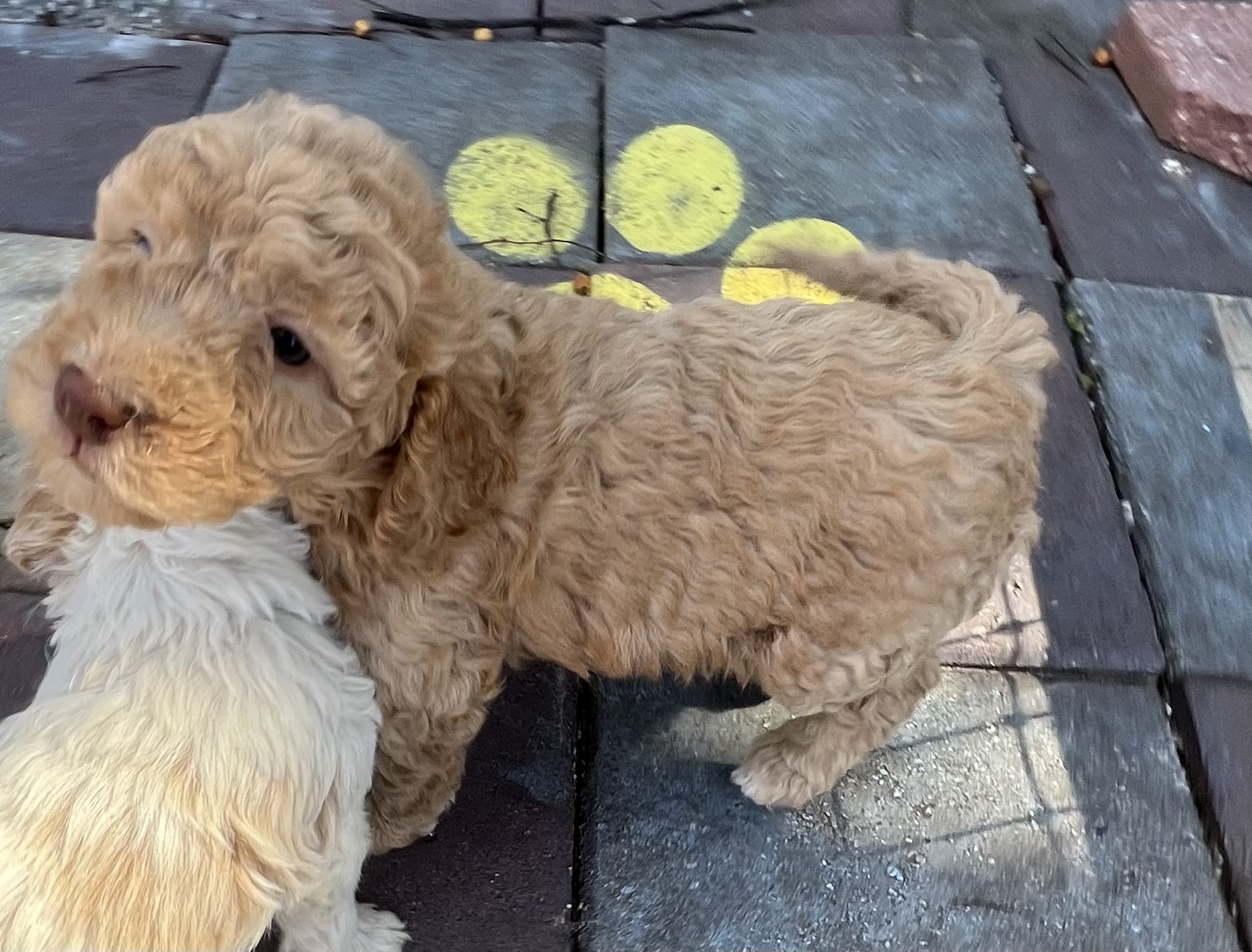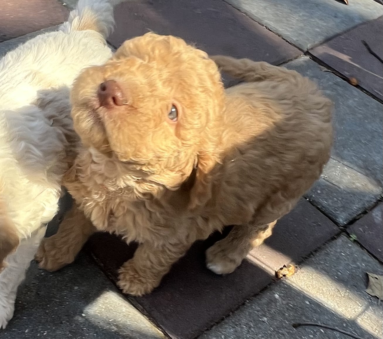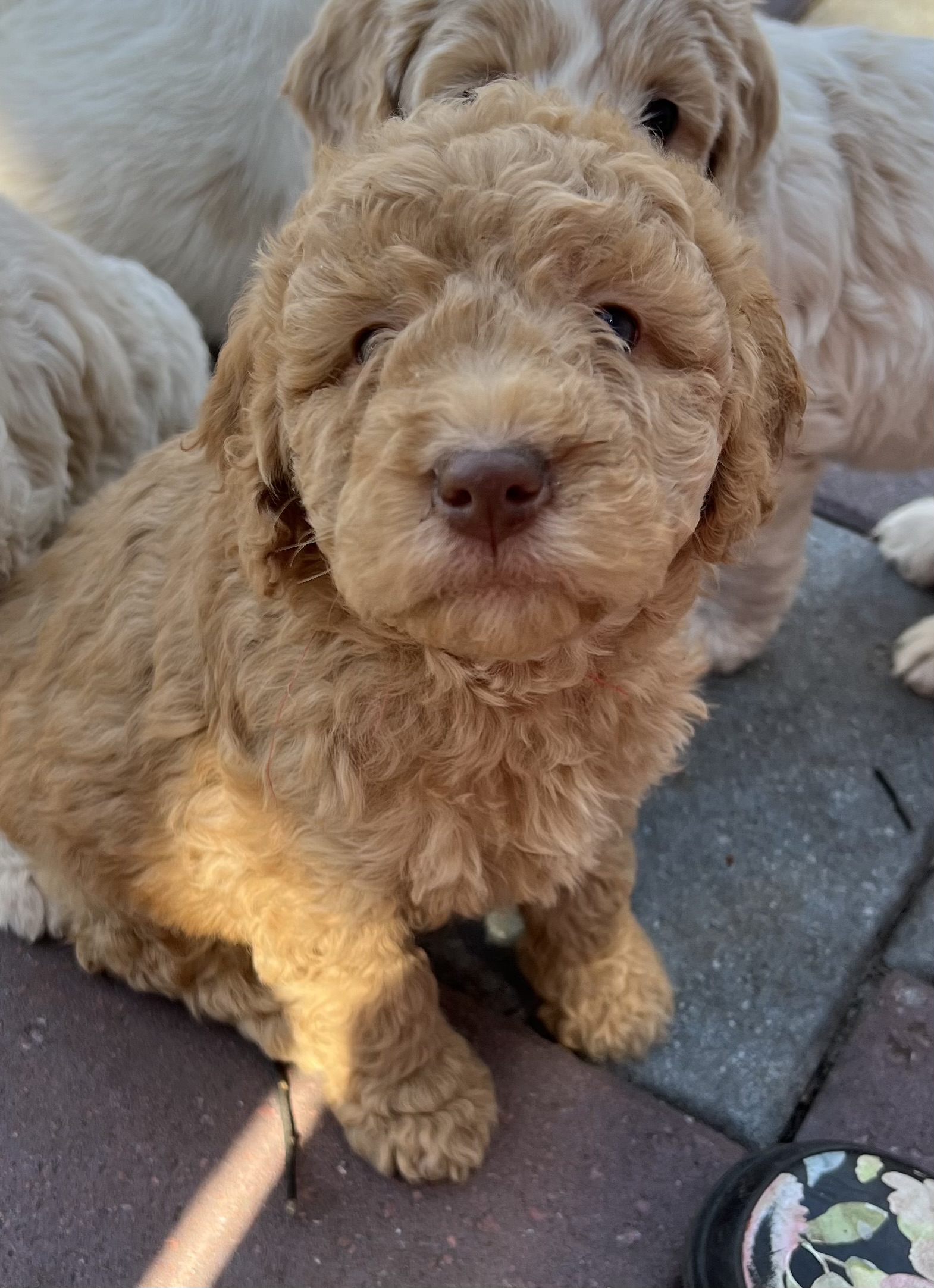 Congratulations to Lynette Roff! Gorgeous little mini/medium Goldendoodle Girl with a Creamy Tan color non shedding curly coat! Will average 30 to 45 pounds full grown!