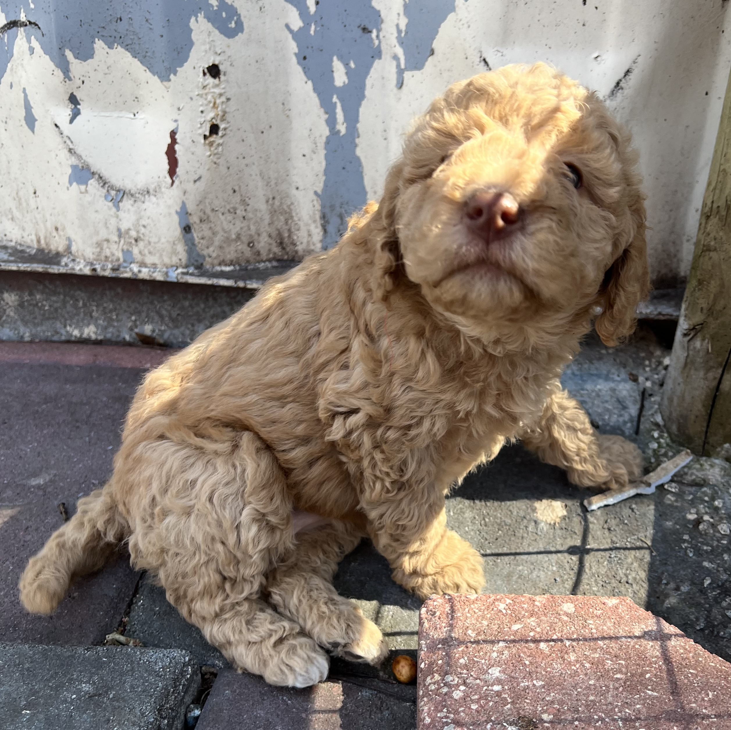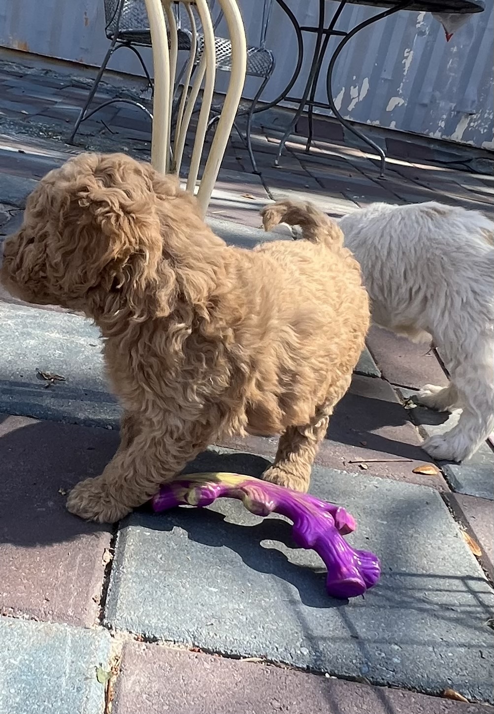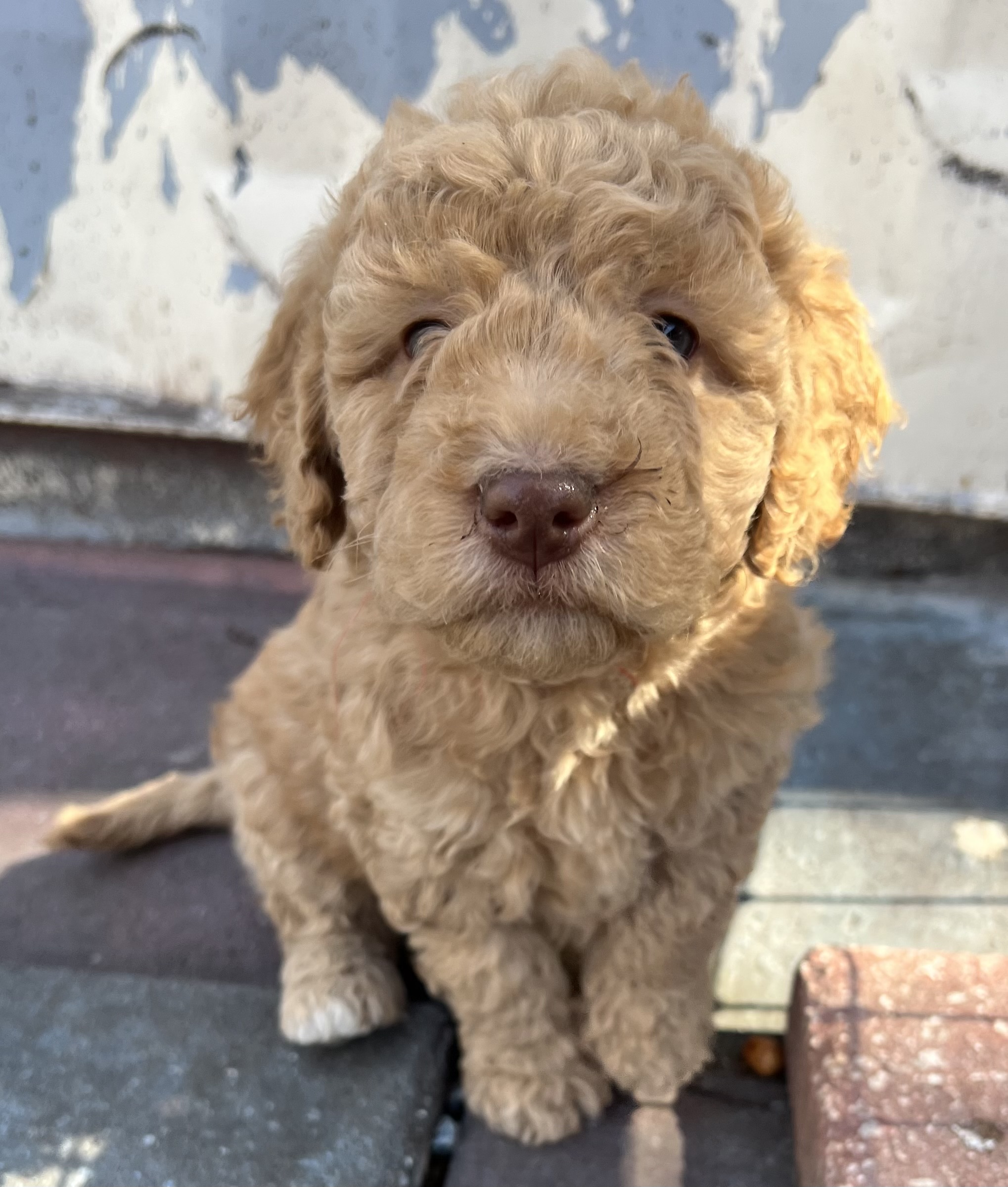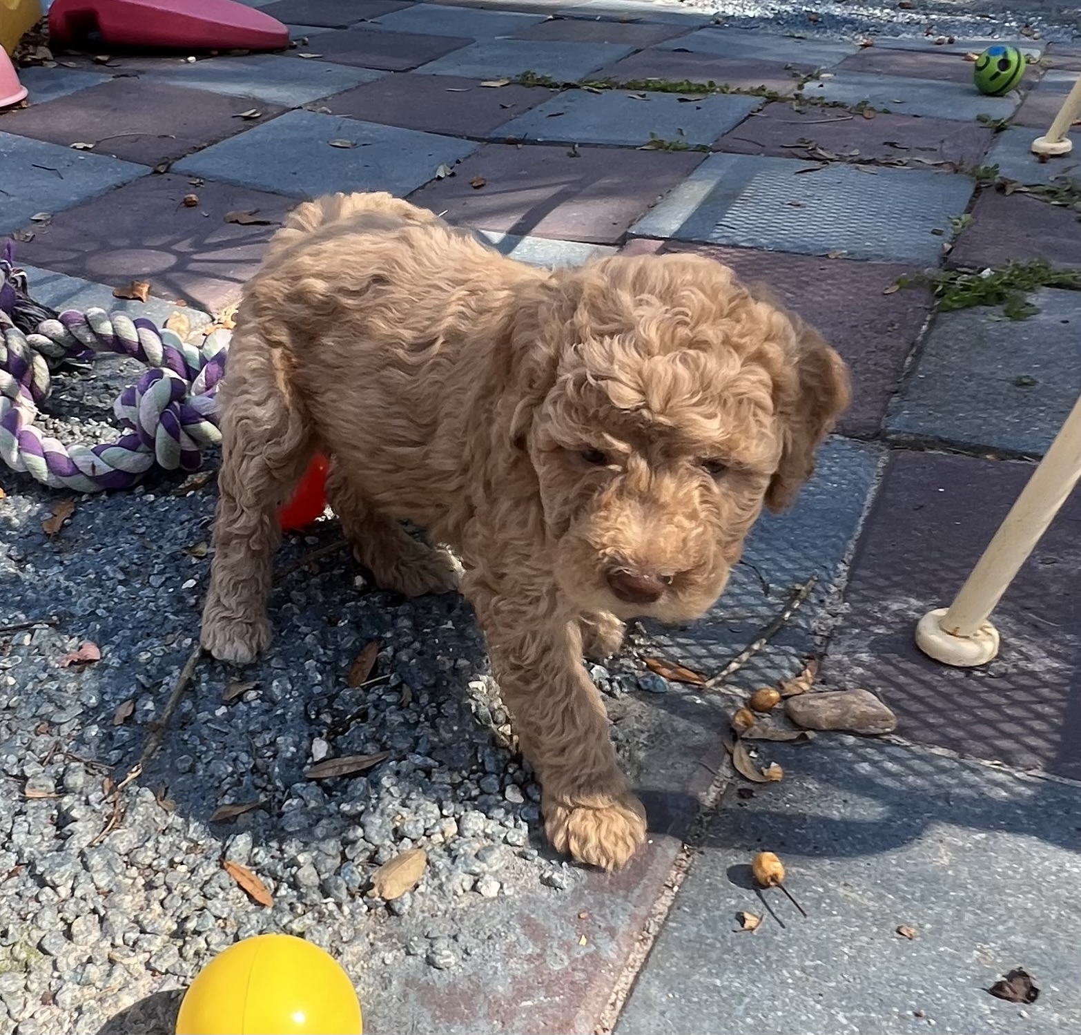 Congratulations to Lynette Roff! Gorgeous little mini/medium Goldendoodle Girl with a Creamy Tan color non shedding curly coat! Will average 30 to 45 pounds full grown!