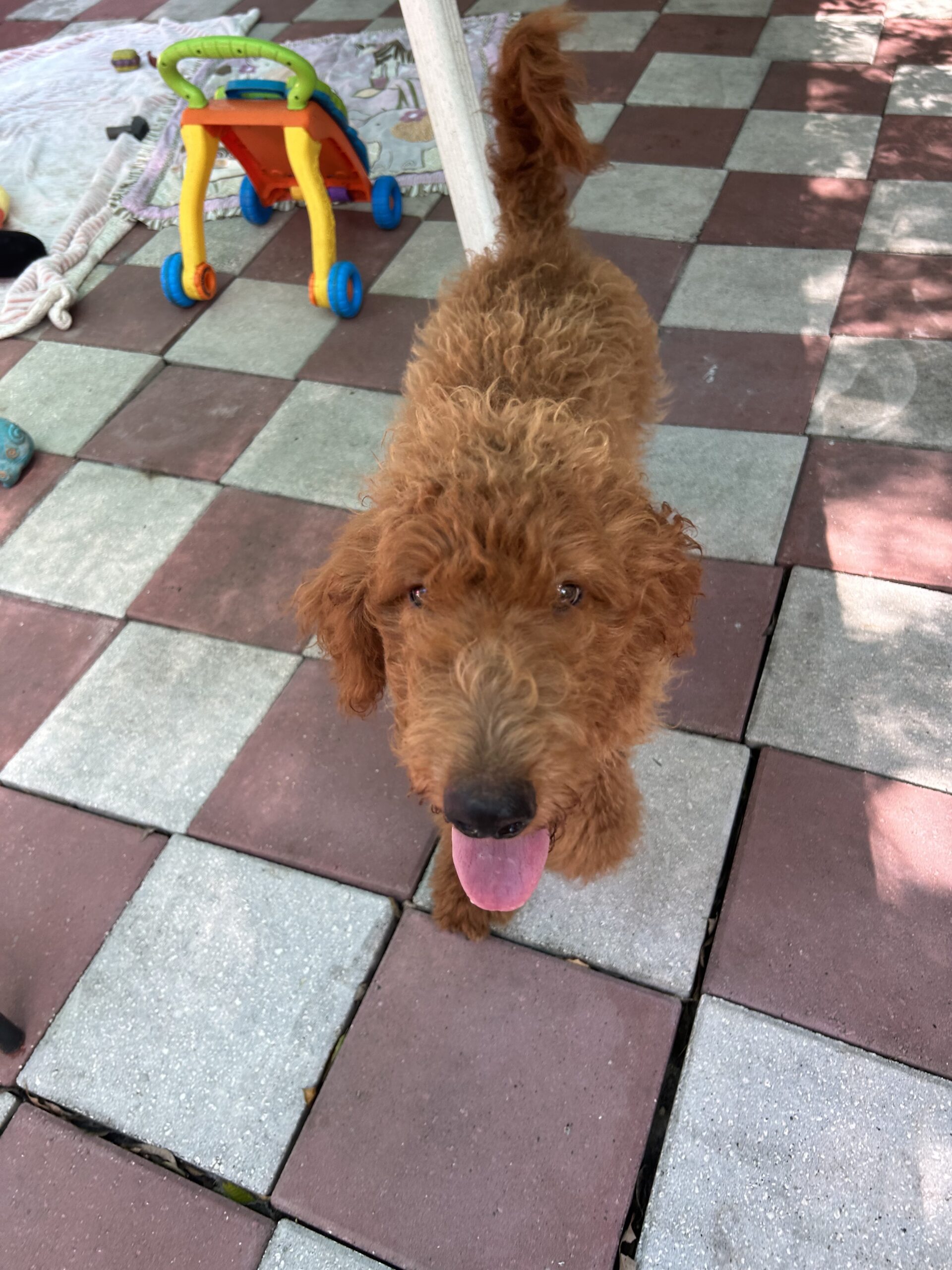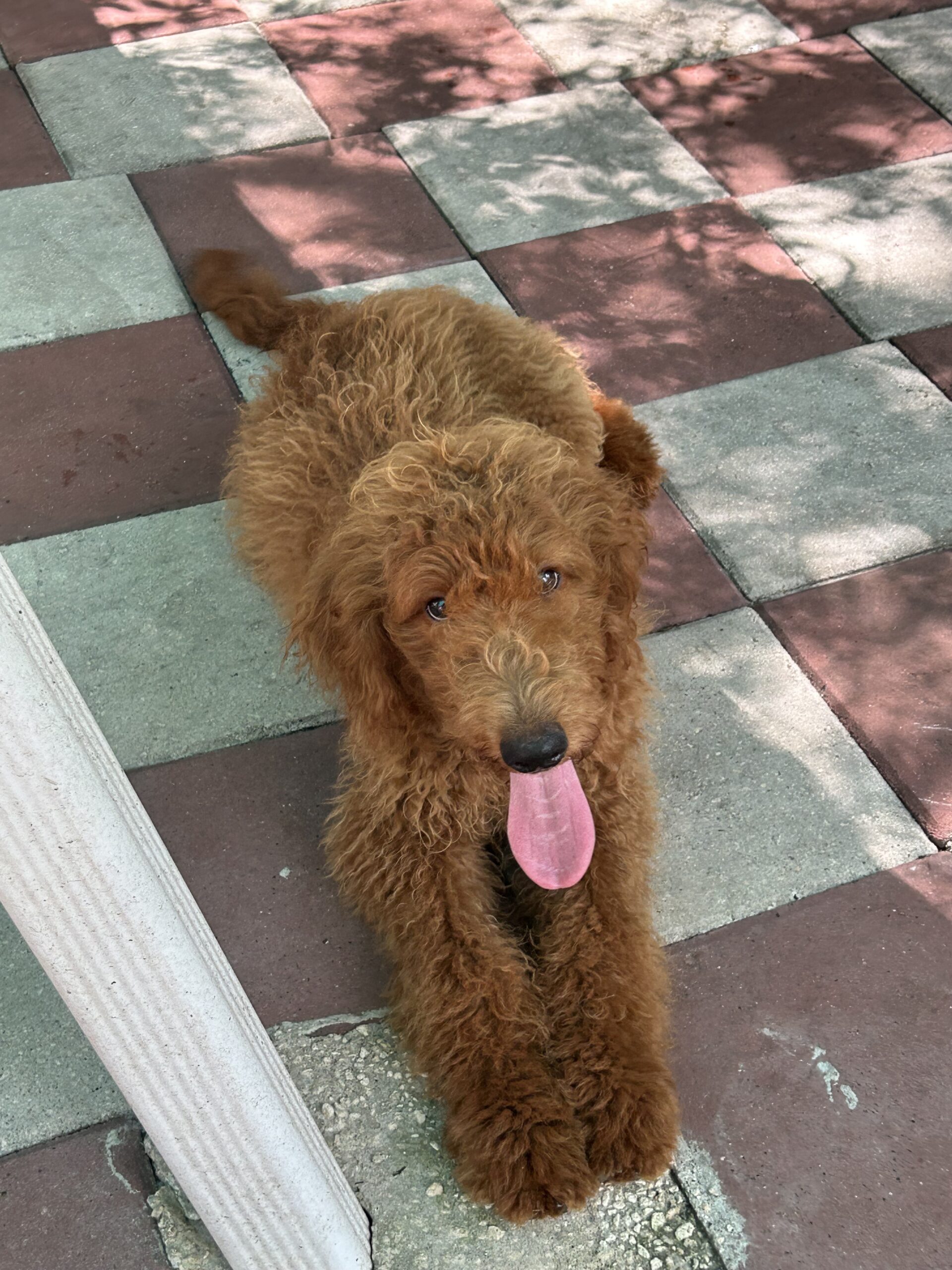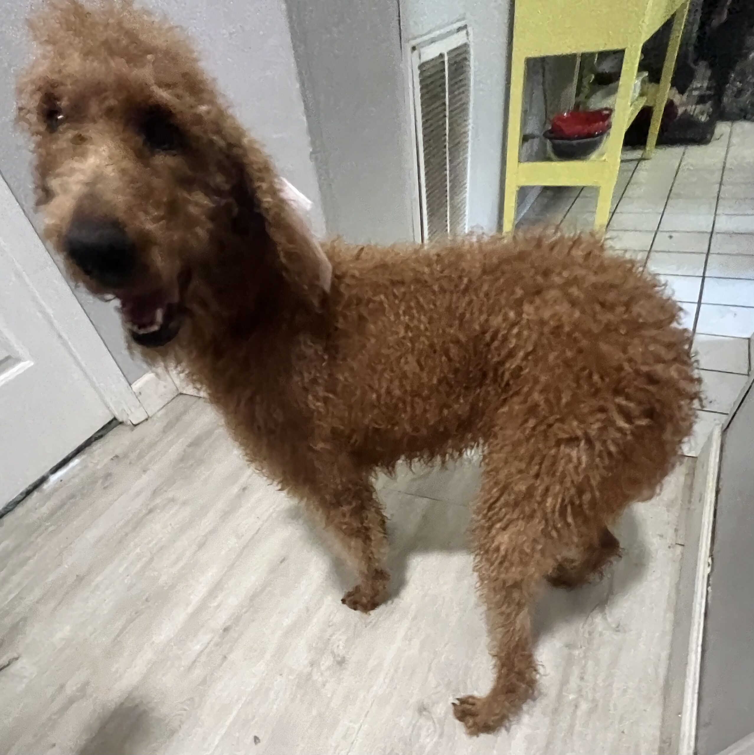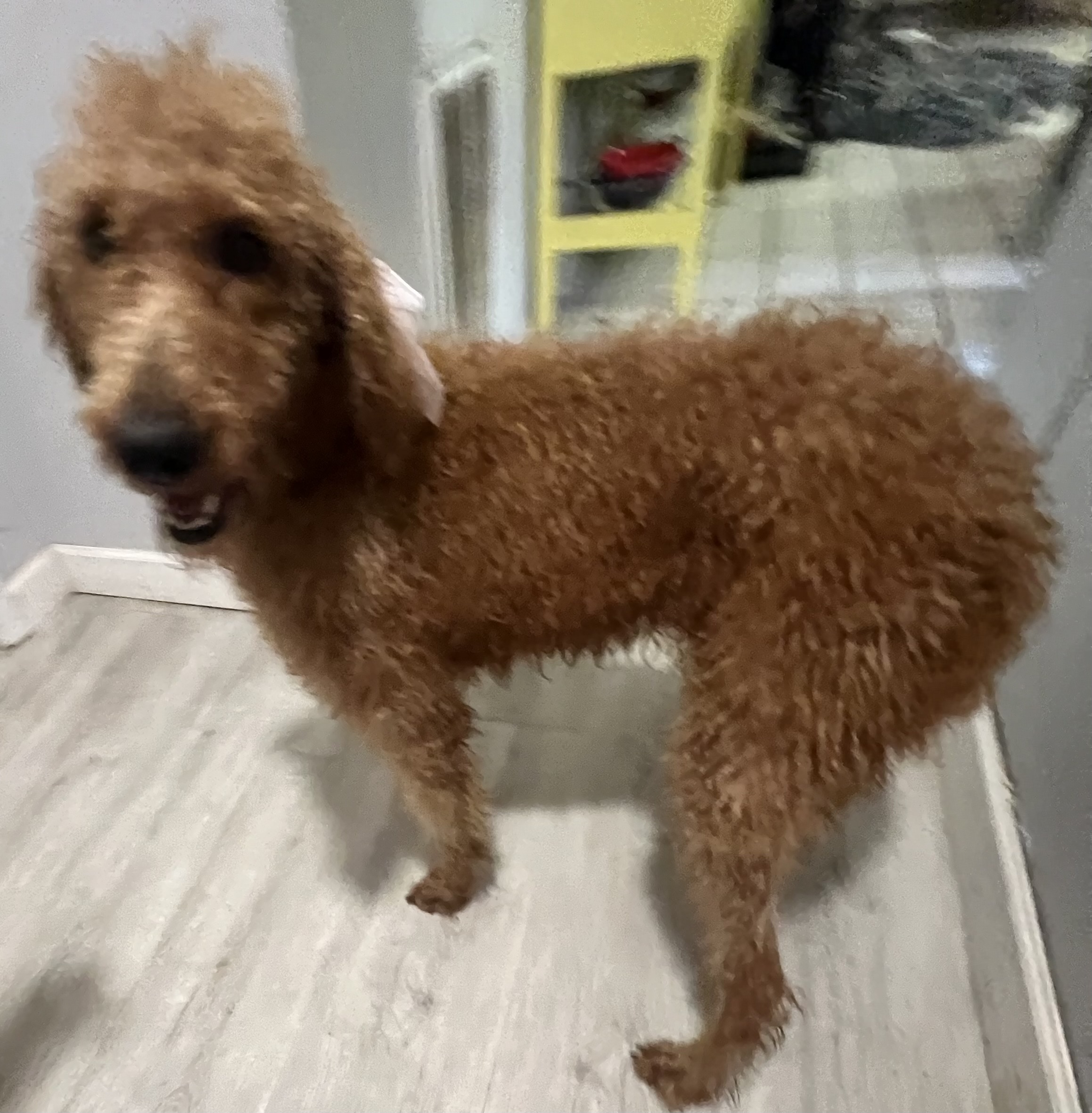 Foxy is a very sweet Apricot/ Red Goldendoodle, she has a wavey/curly very low shedding coat. She is microchipped and up to date on everything age appropriate, she needs to be trained and fixed.