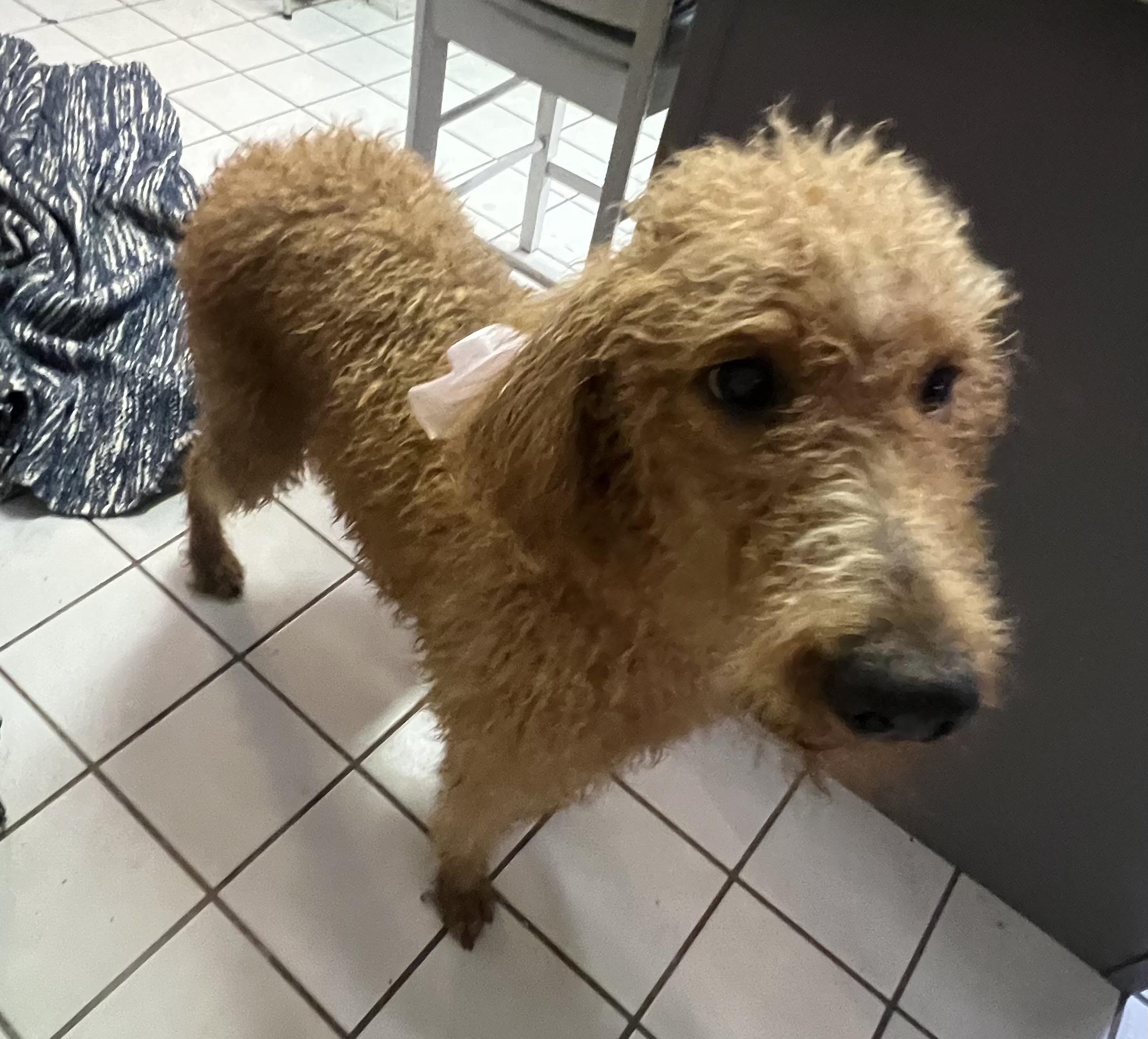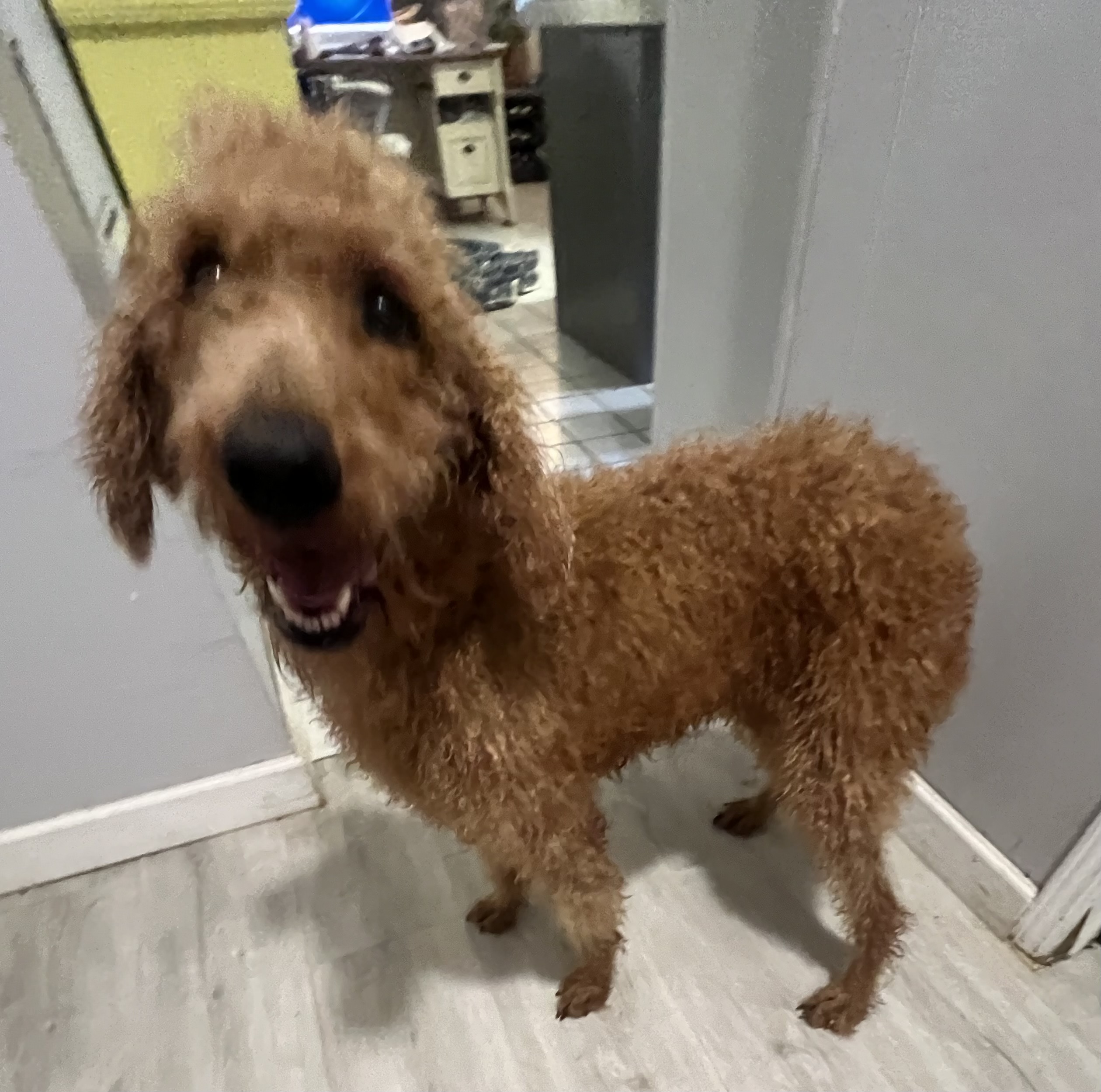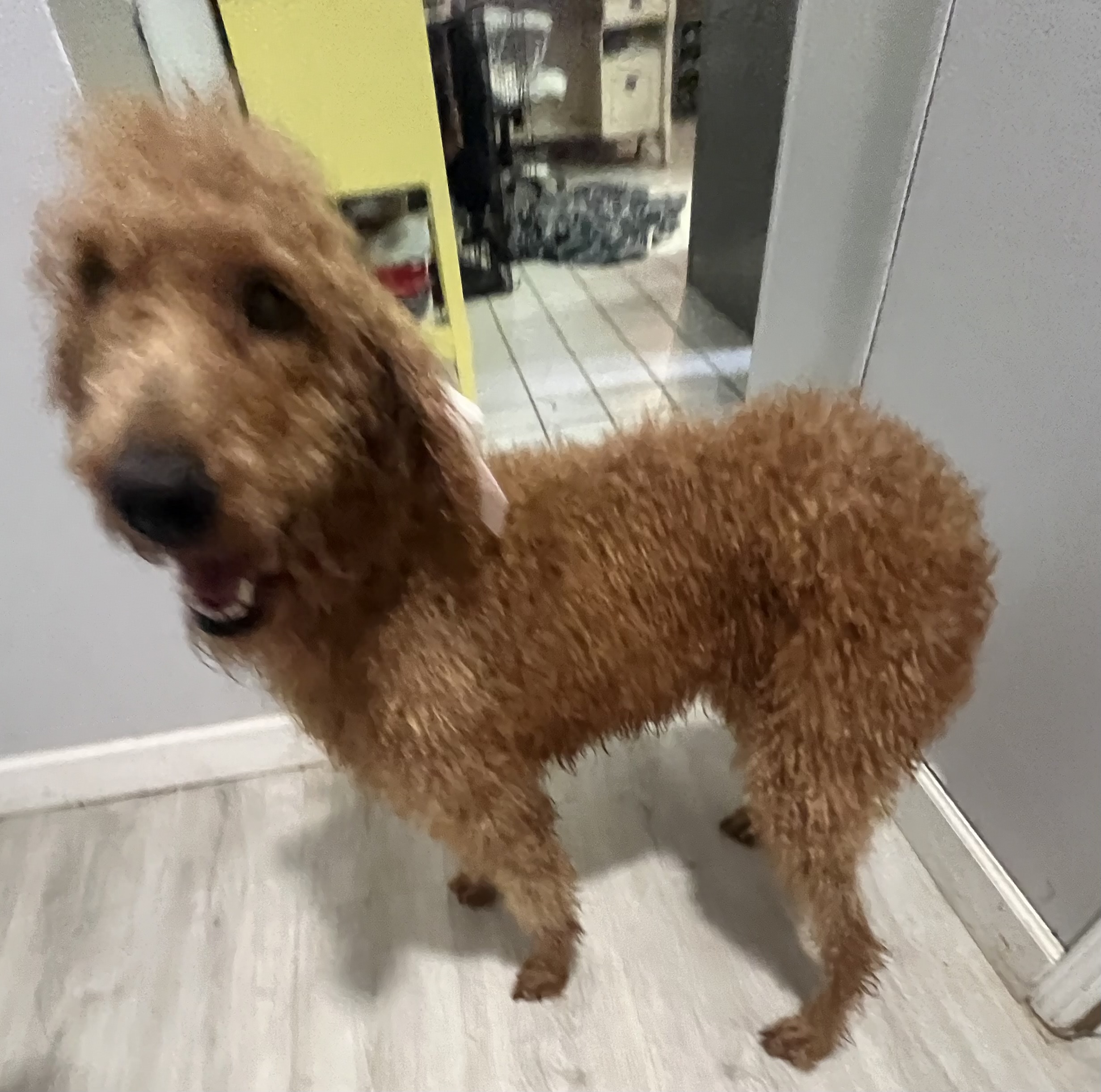 Foxy is a very sweet Apricot/ Red Goldendoodle, she has a wavey/curly very low shedding coat. She is microchipped and up to date on everything age appropriate, she needs to be trained and fixed.