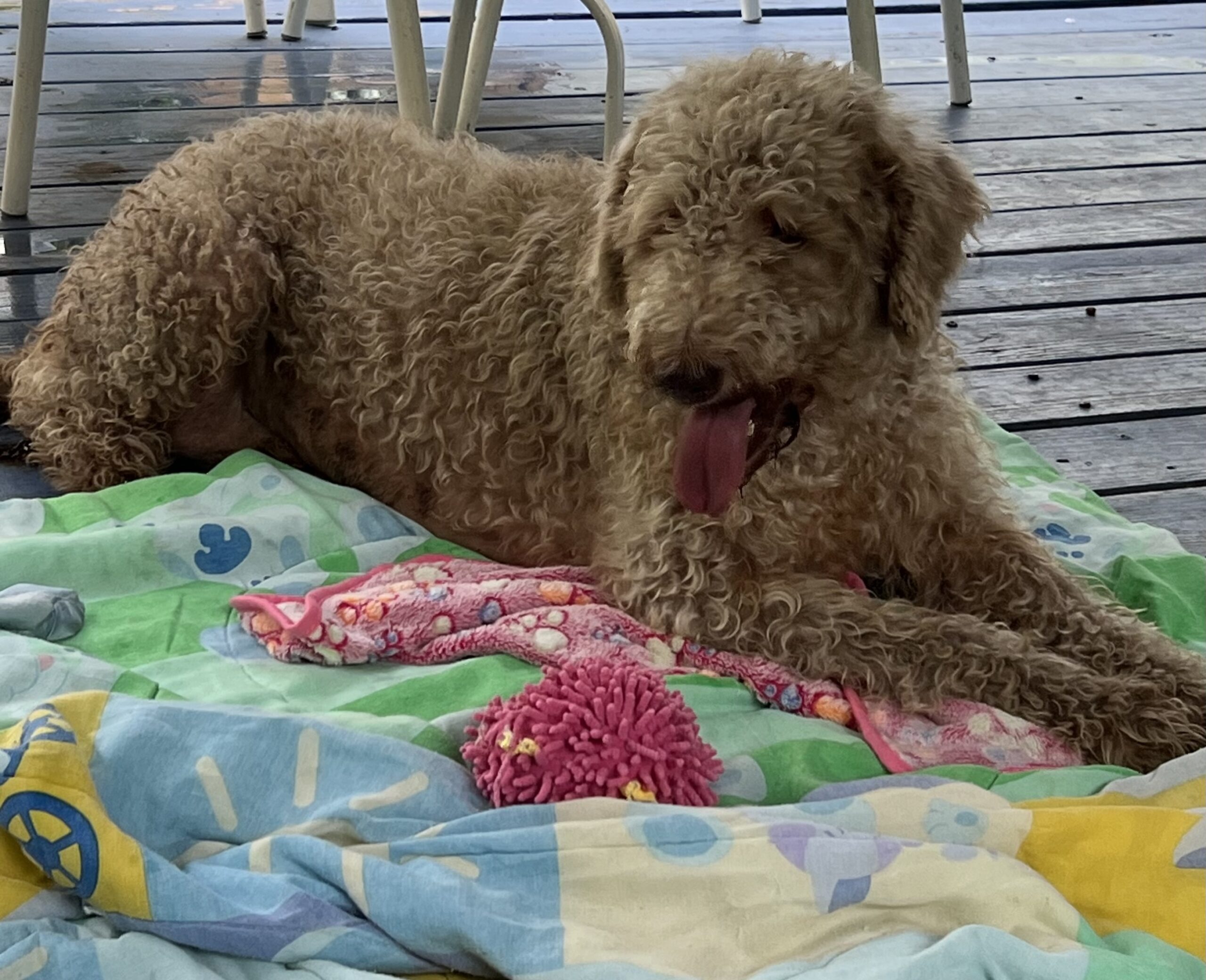 Congratulations to Angel andf family! Miss Kitty is a very sweet f1b Light Chocolate/ Silver Very low shedding Labradoodle girl looking for her FUREVER home where she can spend the rest of her life being a very loved couch potato.