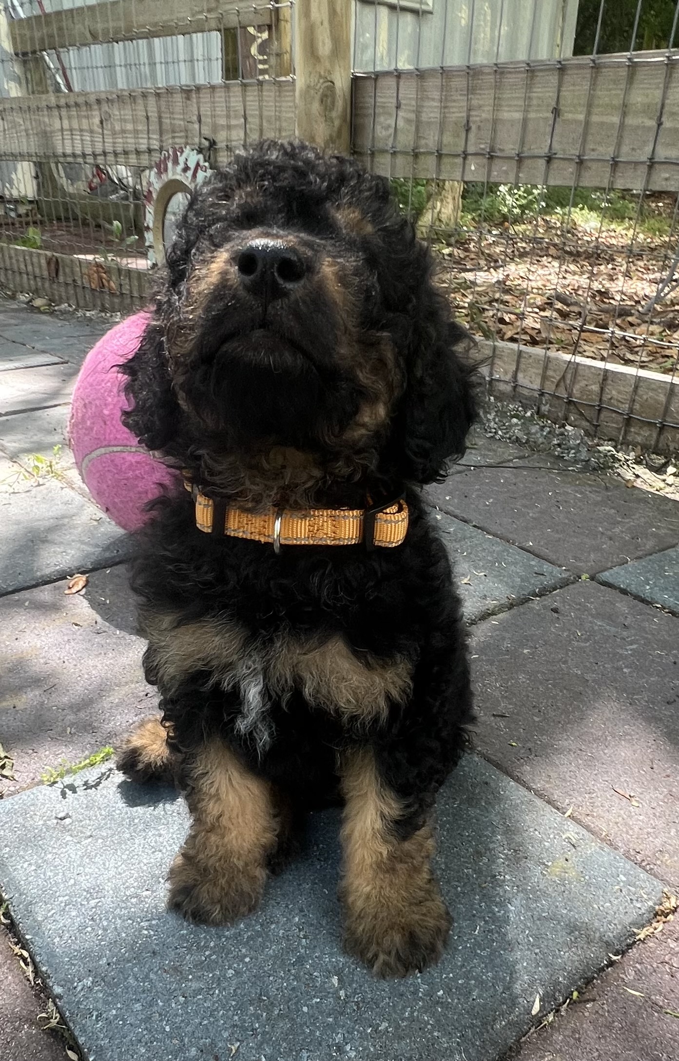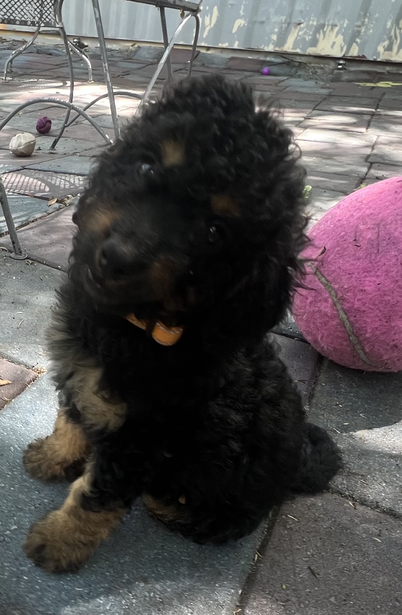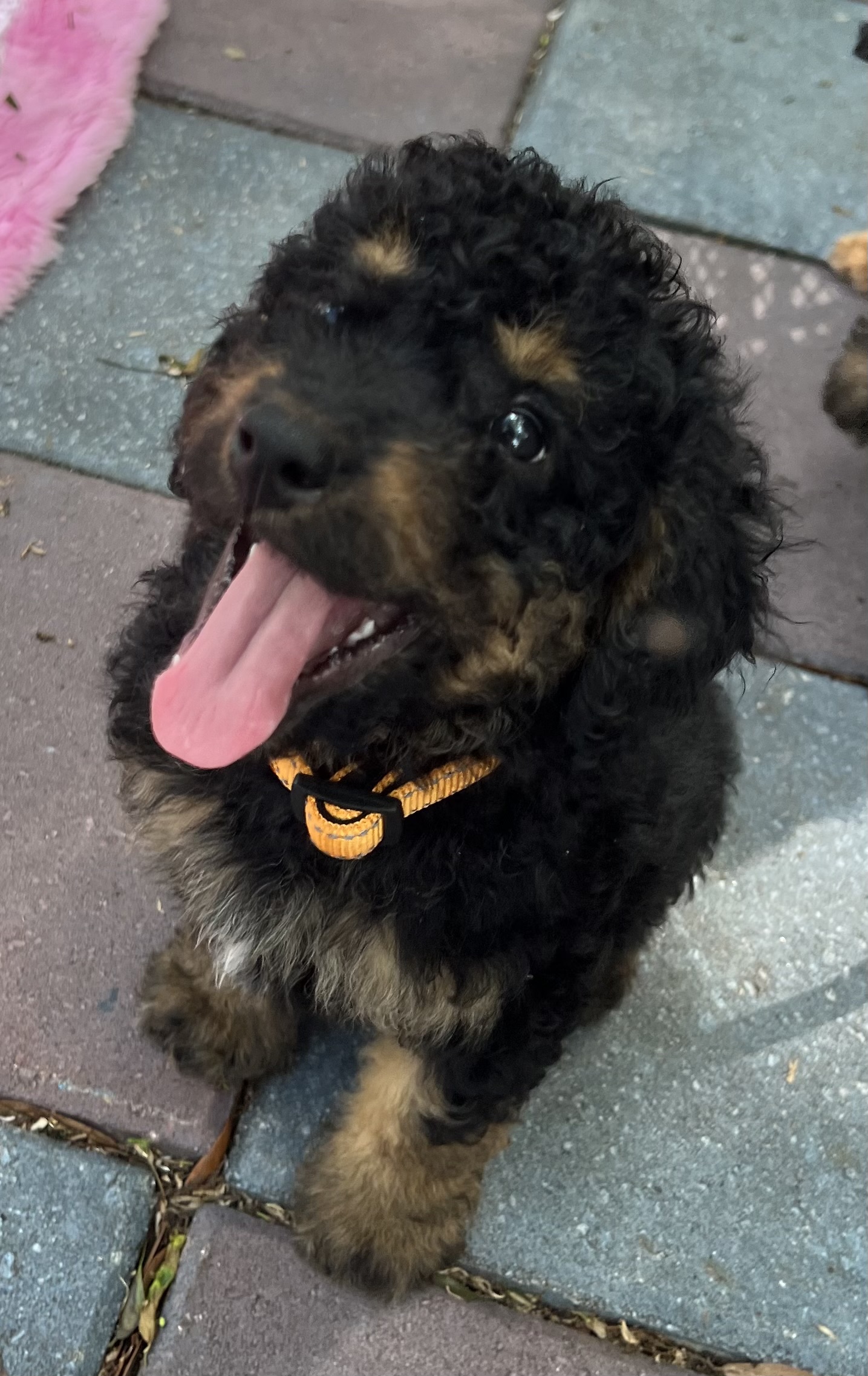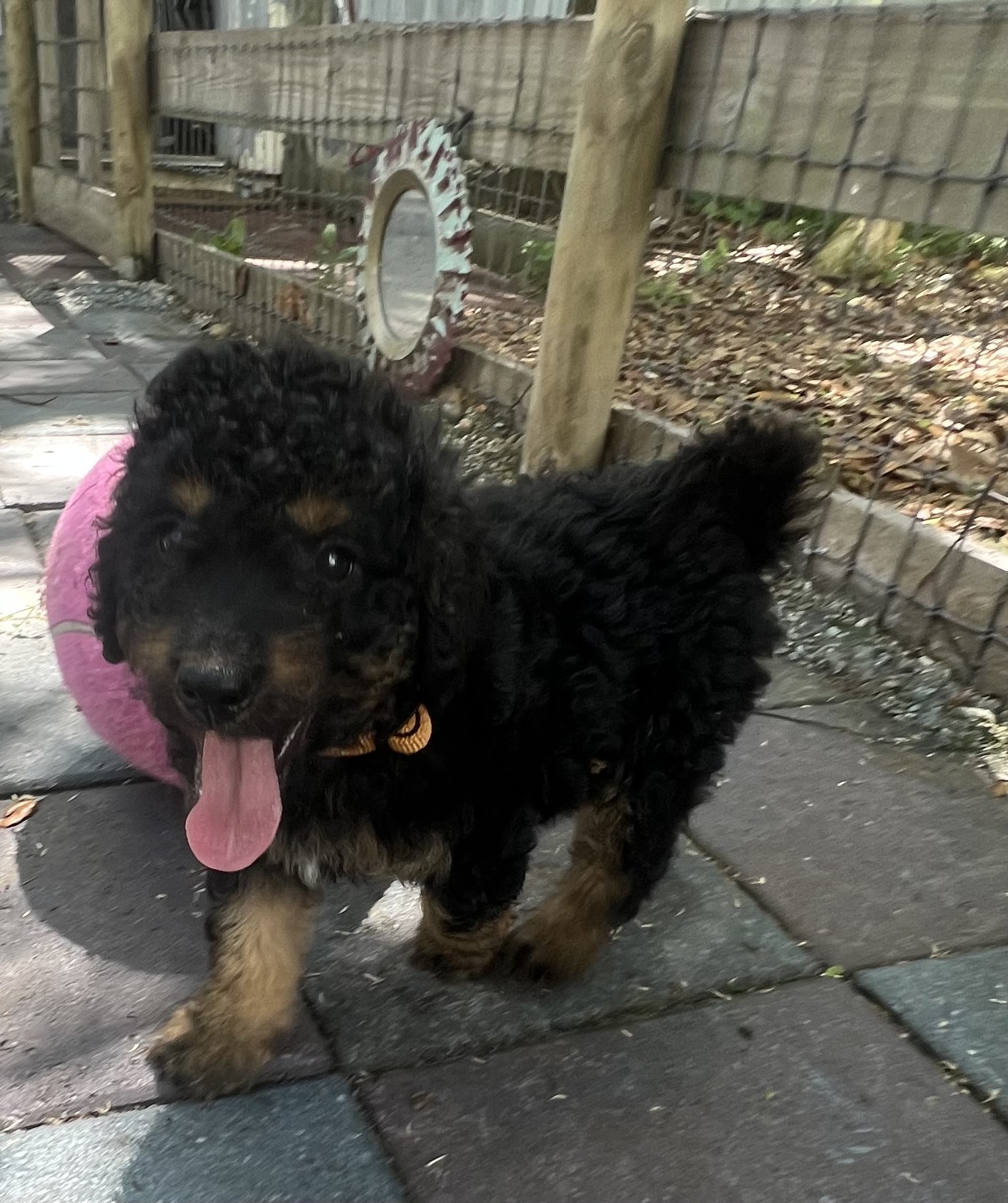 Gorgeous Black Phantom min/medium (28 to 30 pounds full grown) Goldendoodle with a wavy/curly non shedding coat.