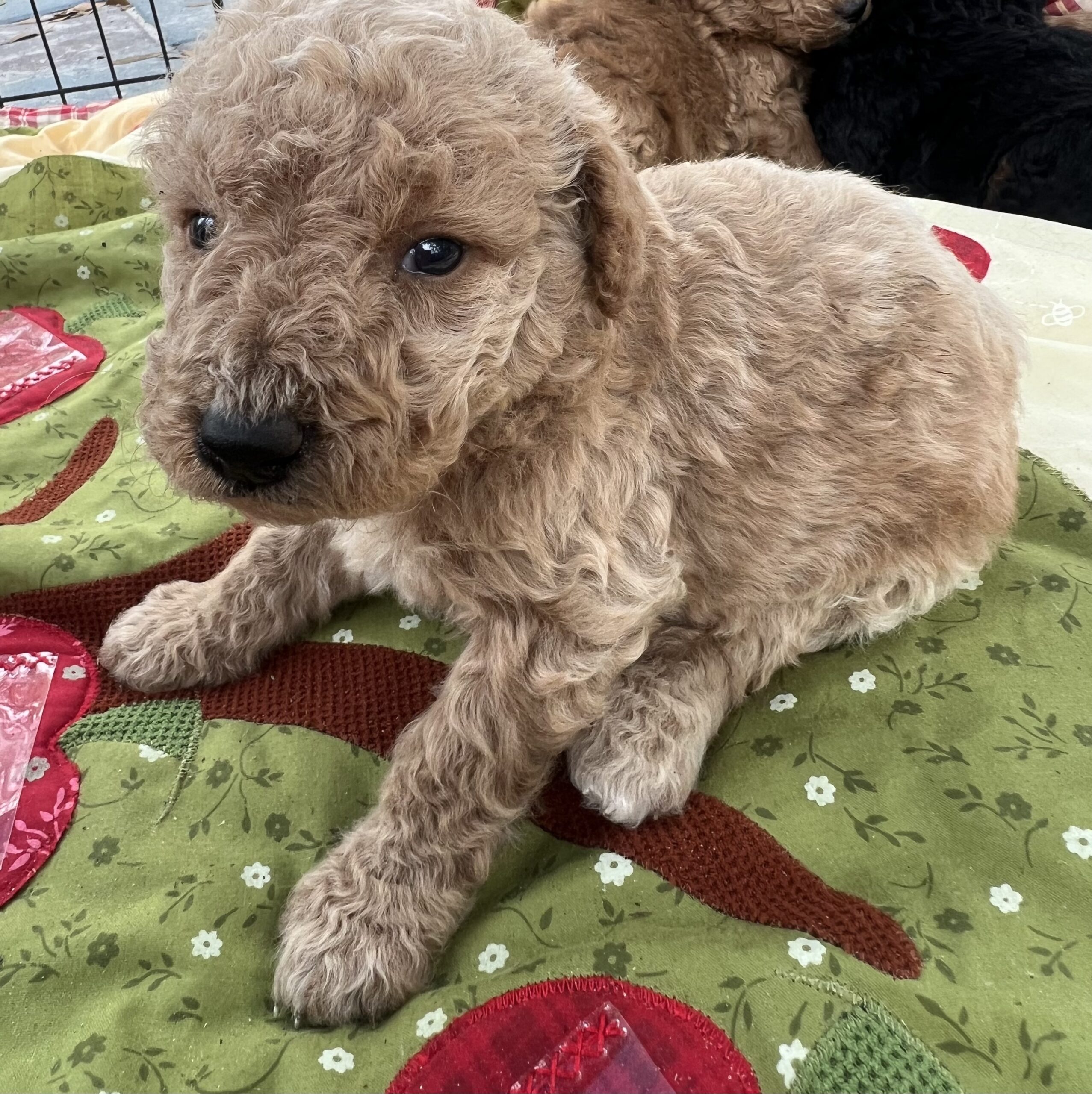 Gorgeous Golden colored min/medium (28 to 30 pounds full grown) Goldendoodle with a wavy/curly non shedding coat.