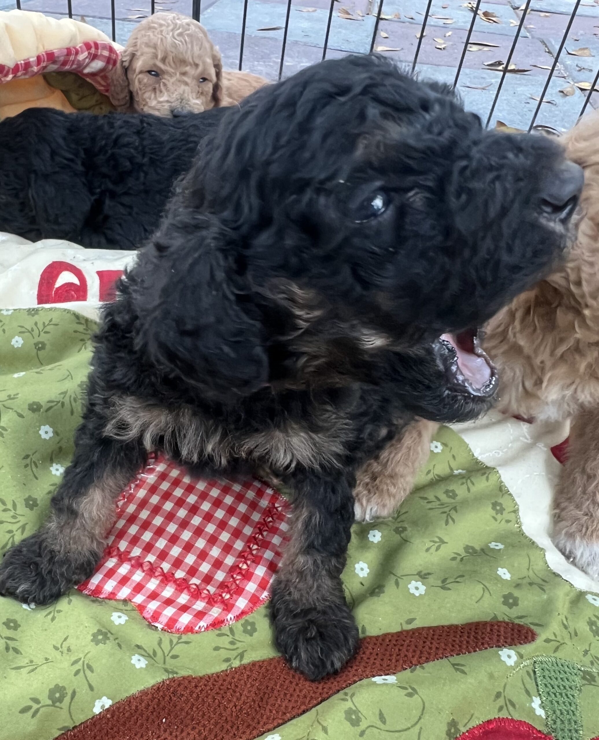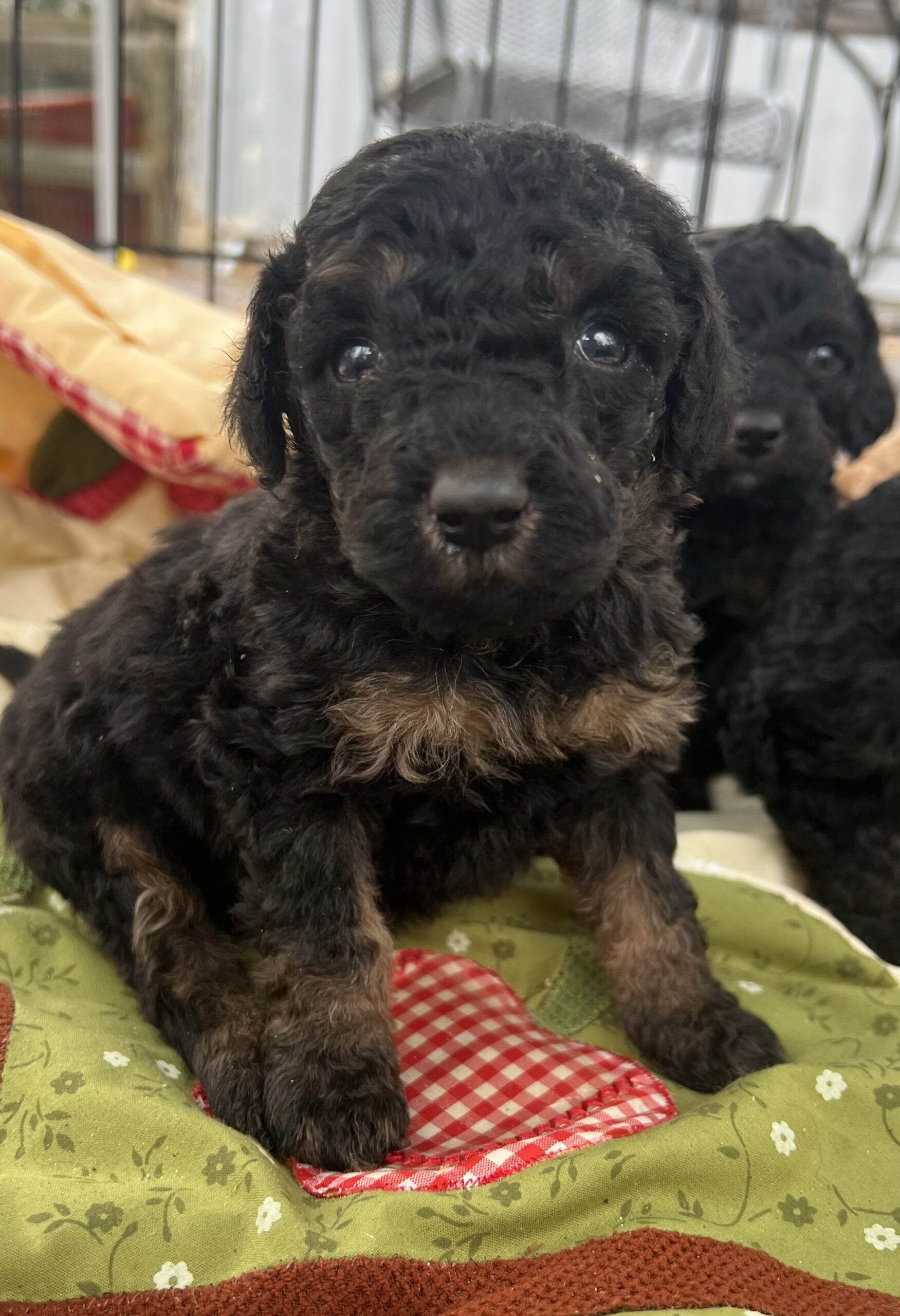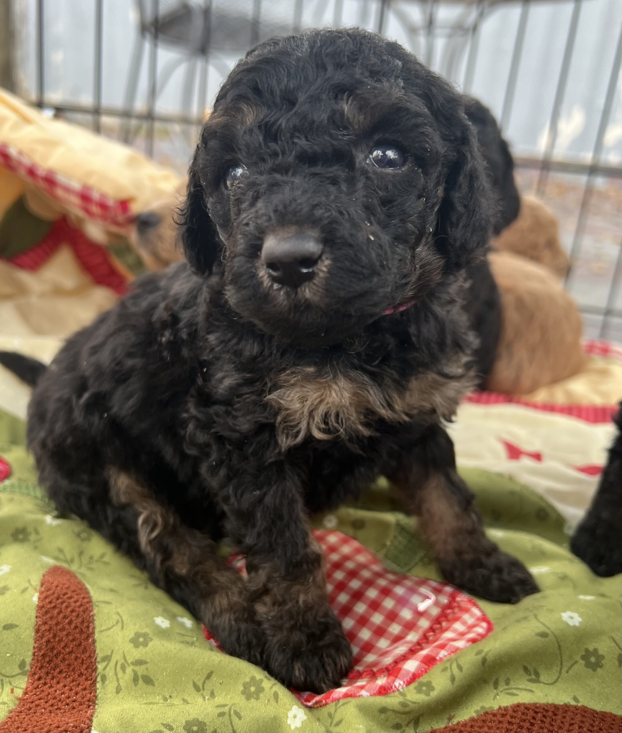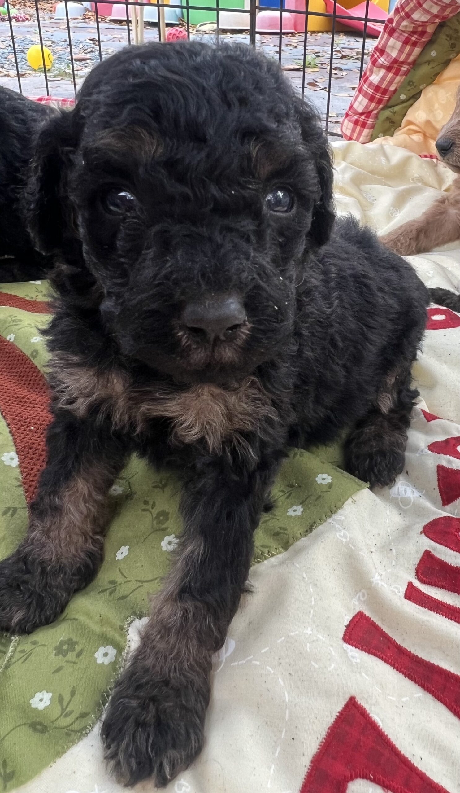 Gorgeous Black Phantom min/medium (28 to 30 pounds full grown) Goldendoodle with a wavy/curly non shedding coat.
