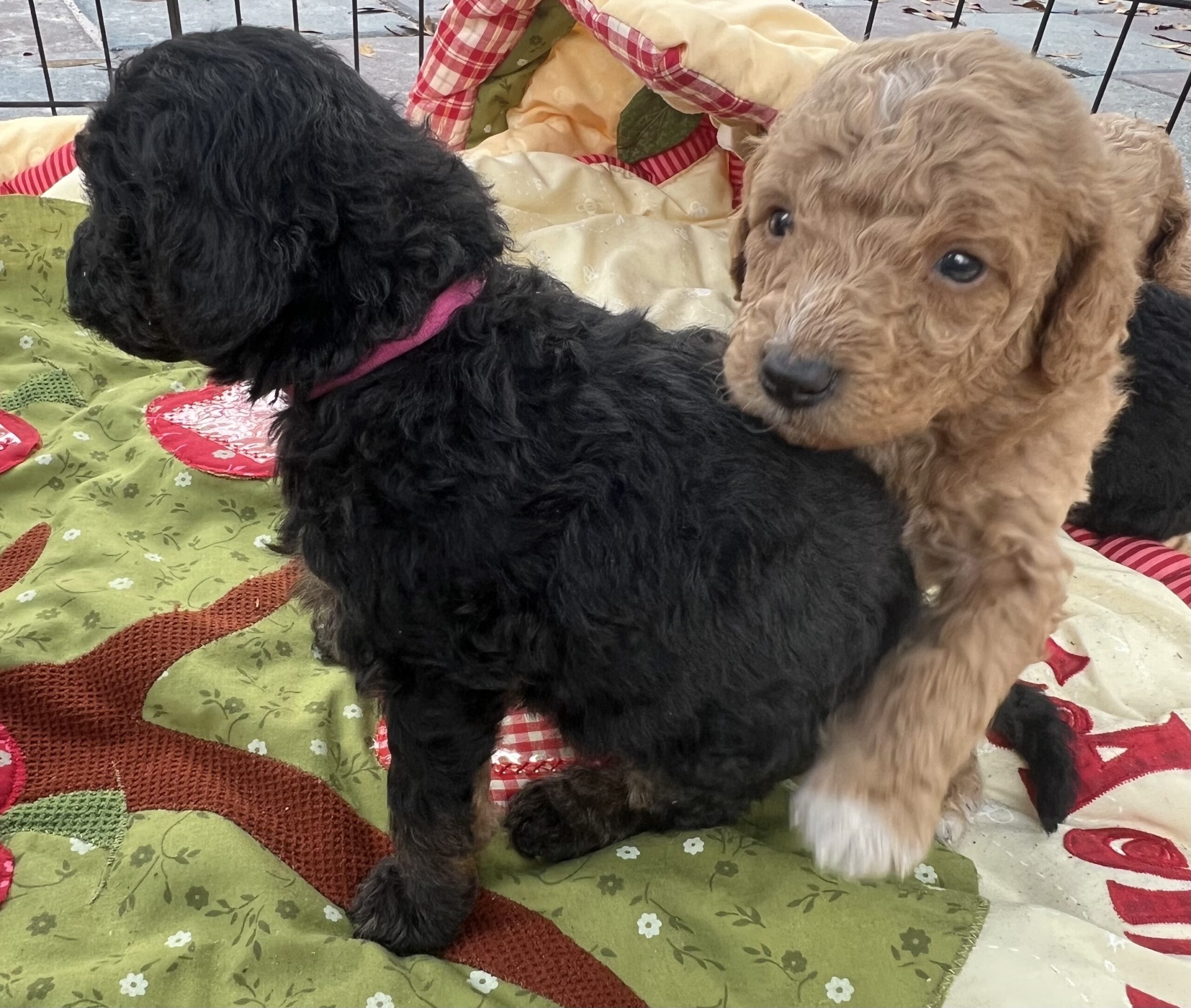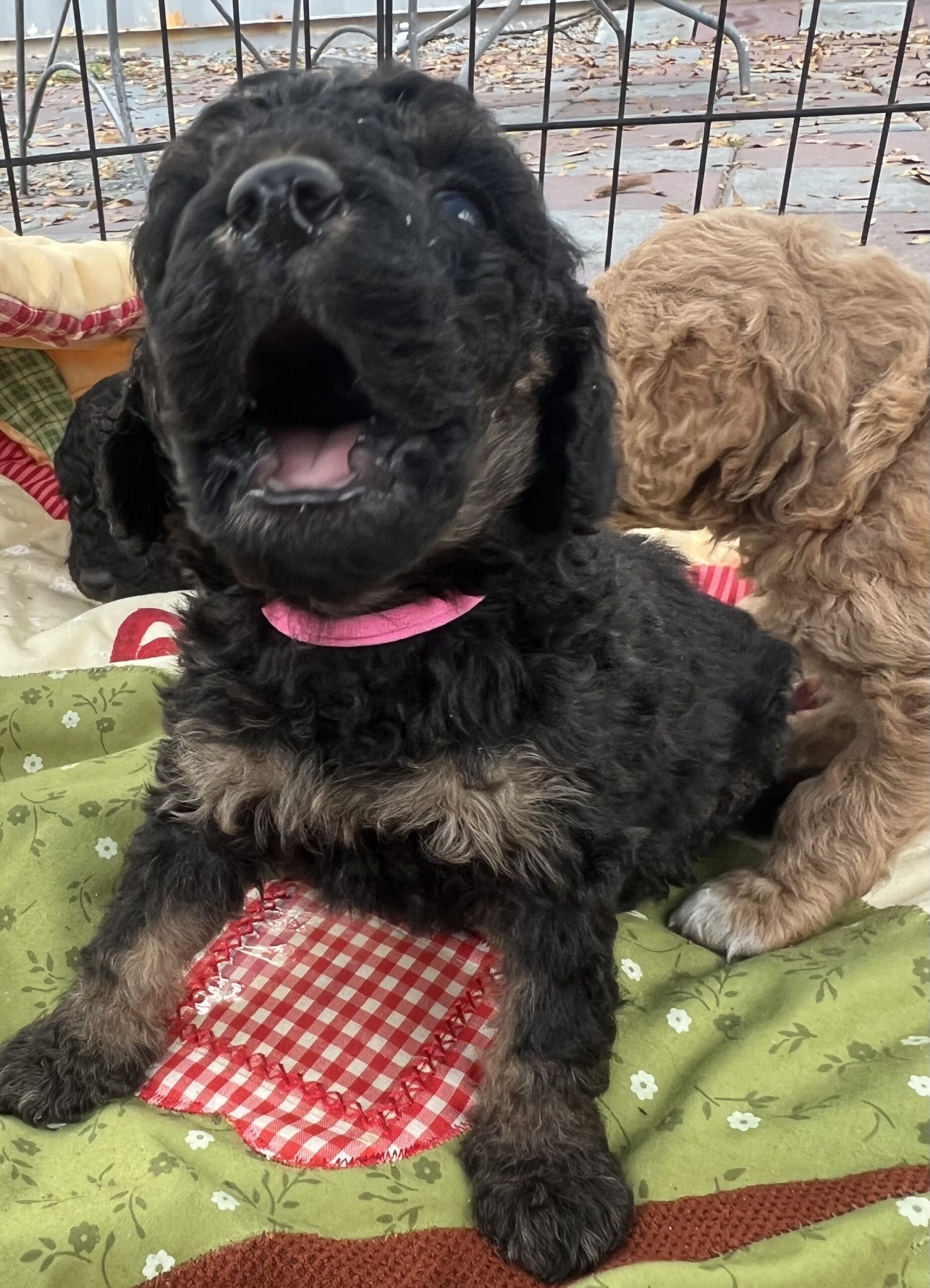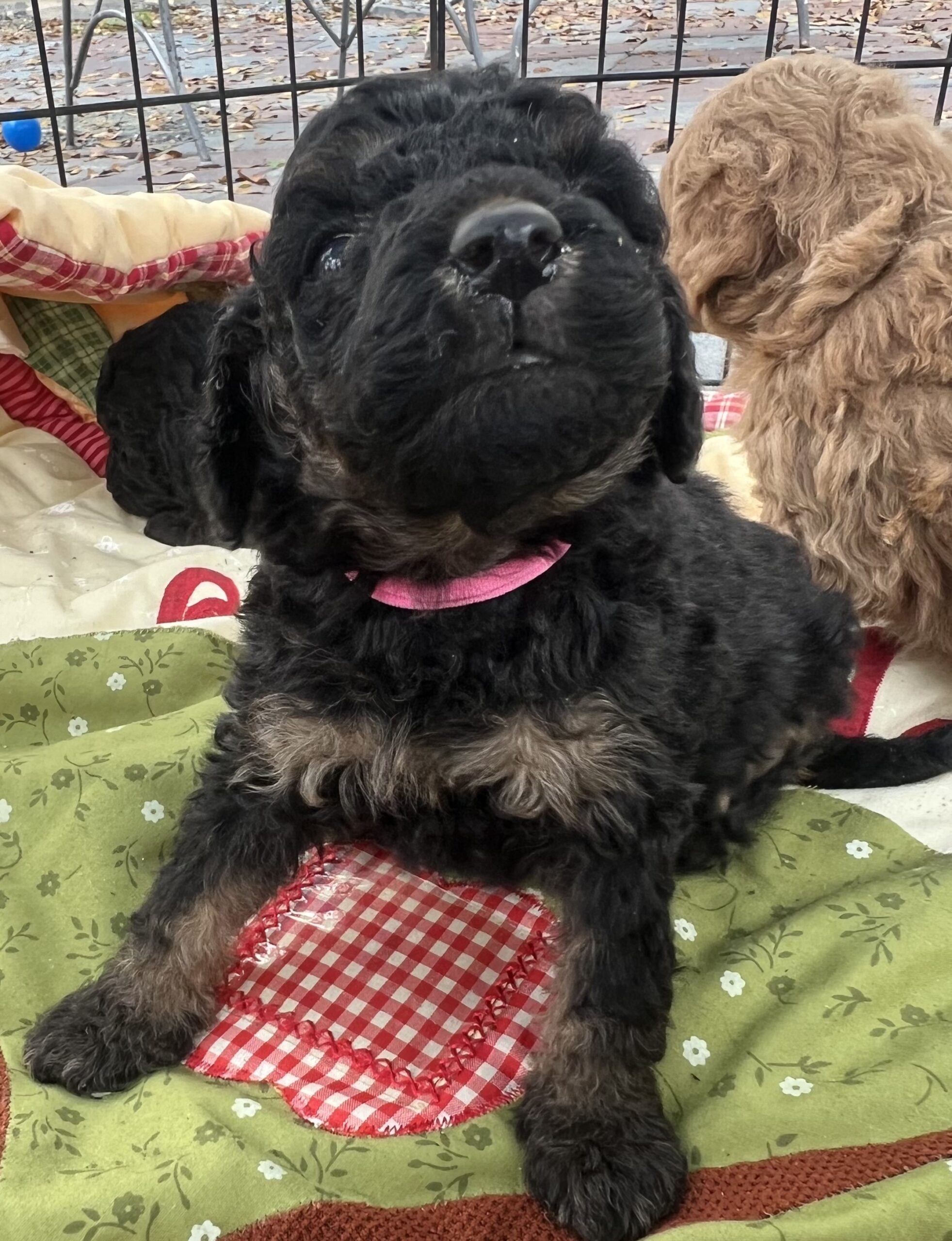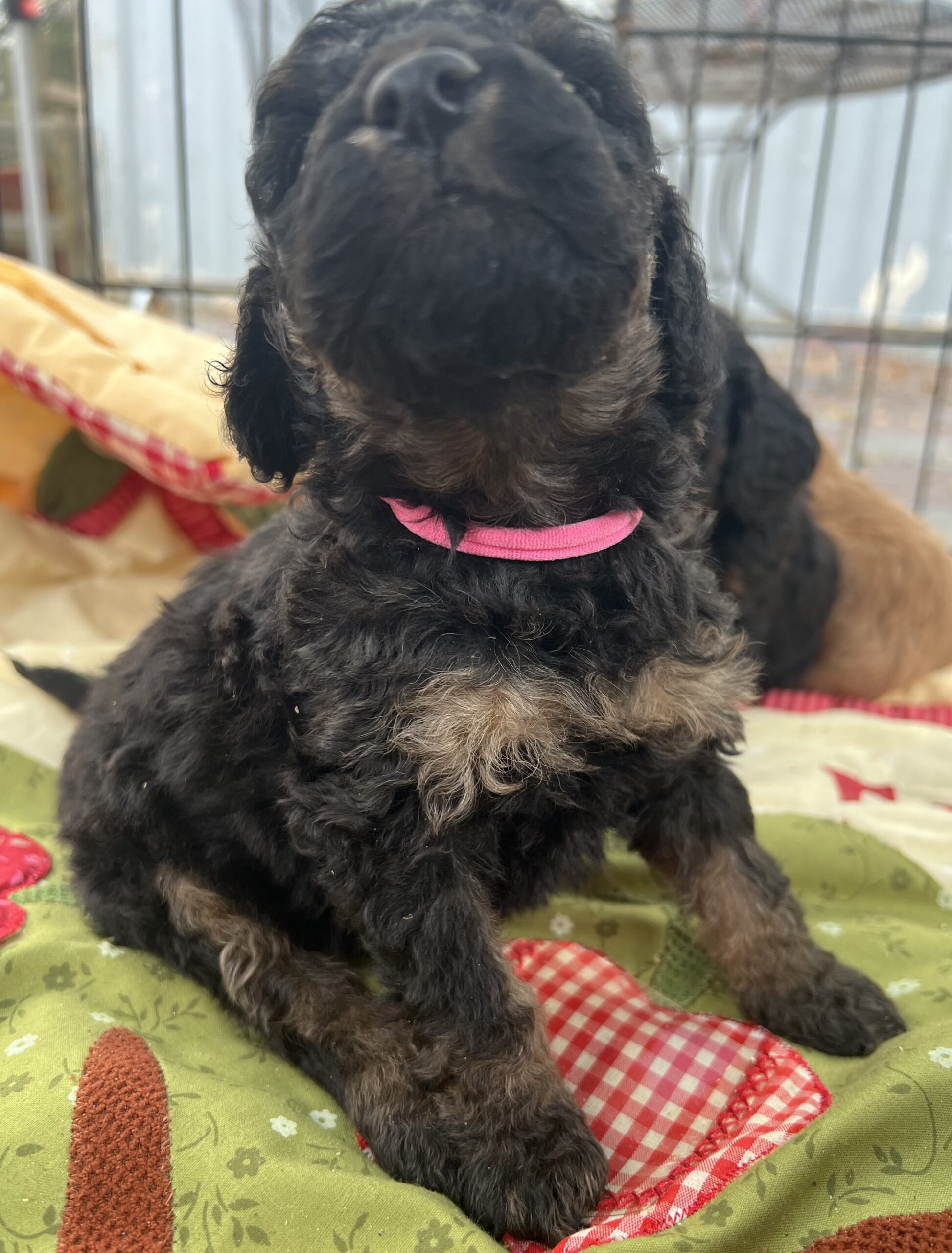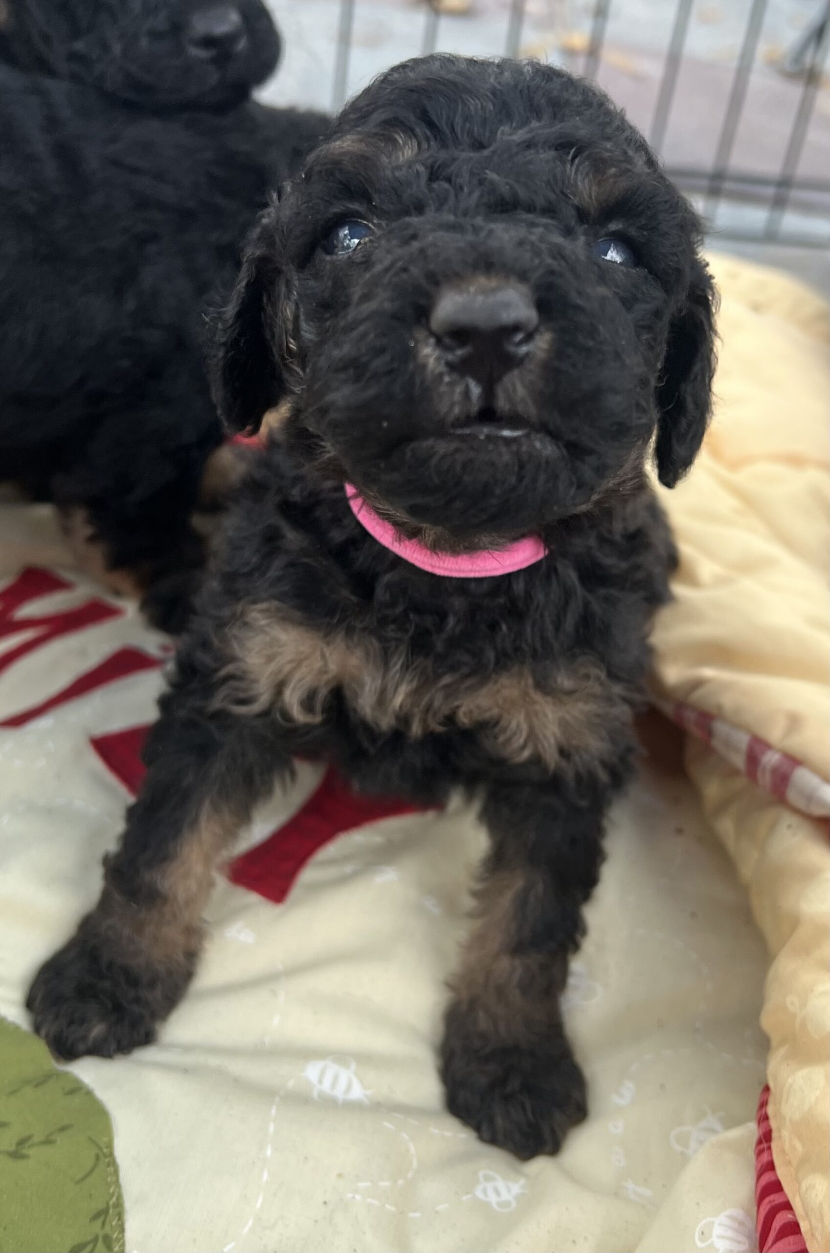 Gorgeous Black Phantom min/medium (28 to 30 pounds full grown) Goldendoodle with a wavy/curly non shedding coat.