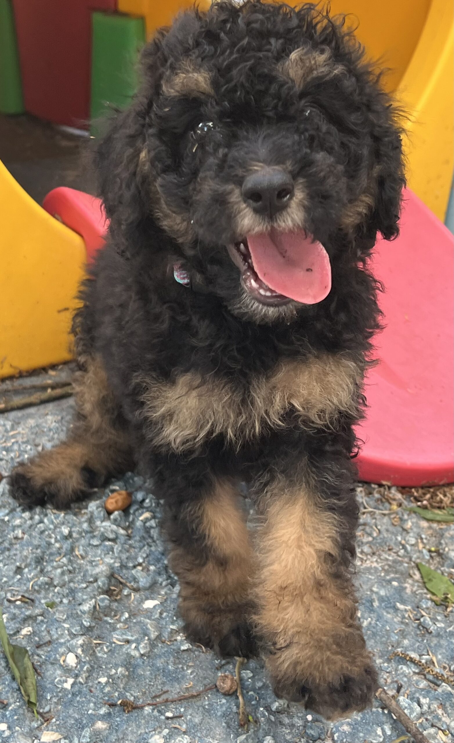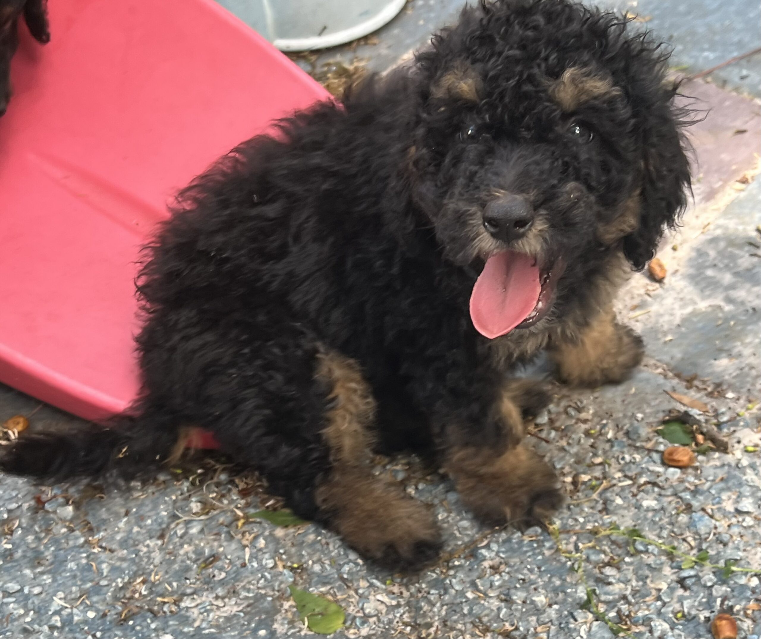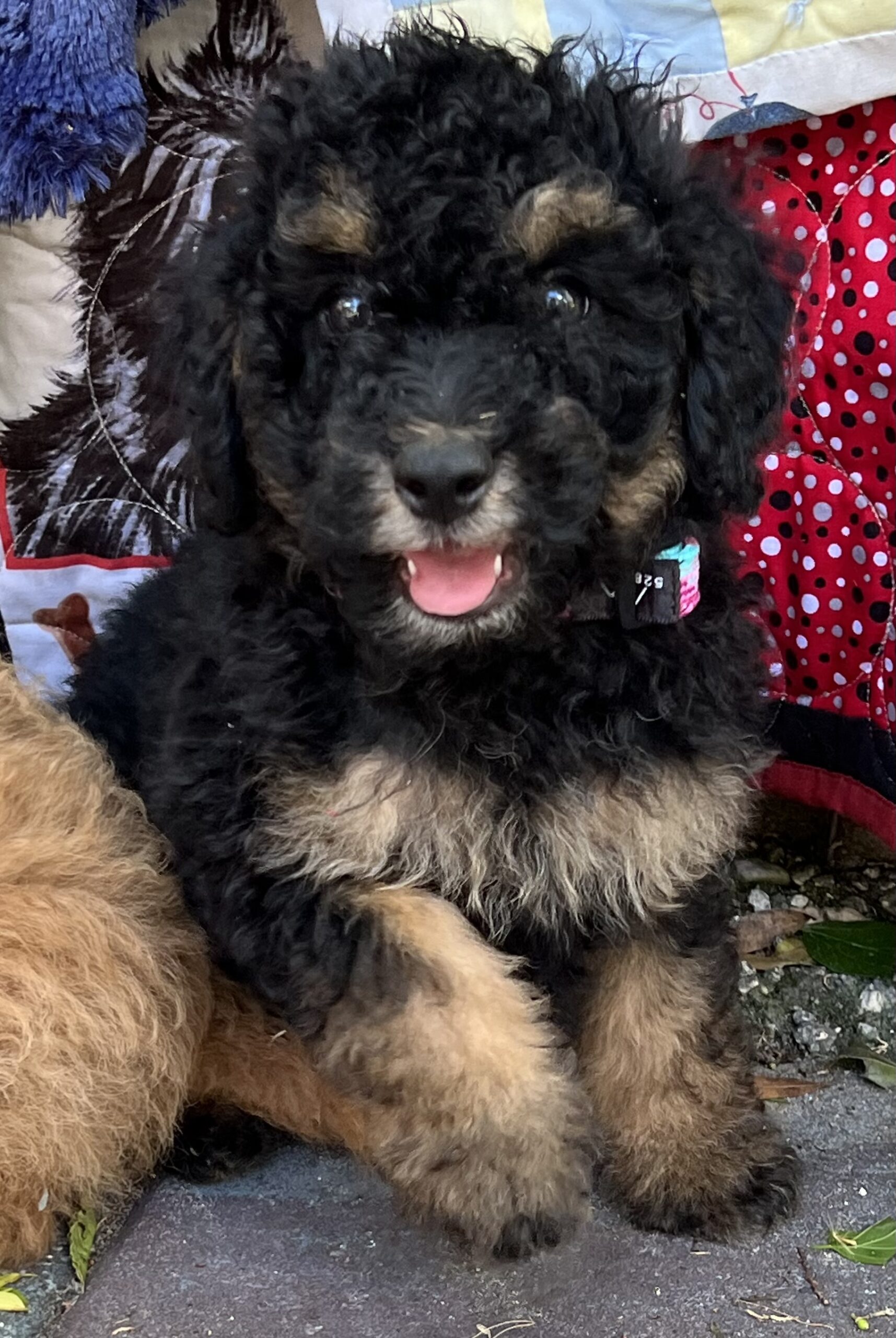 Pending for Mike and son until Friday. : Gorgeous Black Phantom min/medium (28 to 30 pounds full grown) Goldendoodle with a wavy/curly non shedding coat.