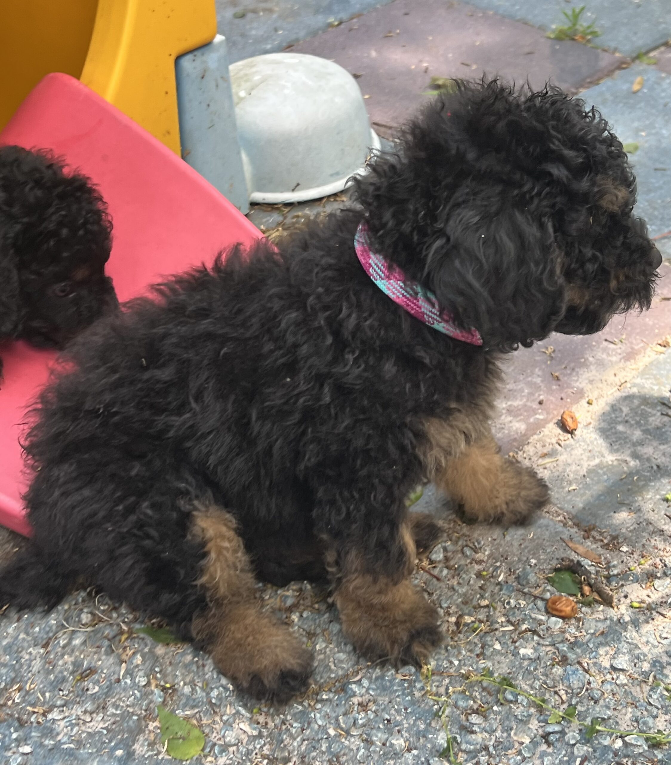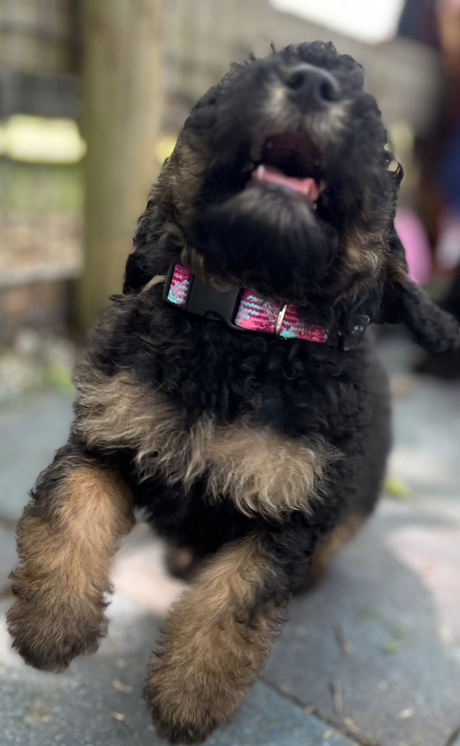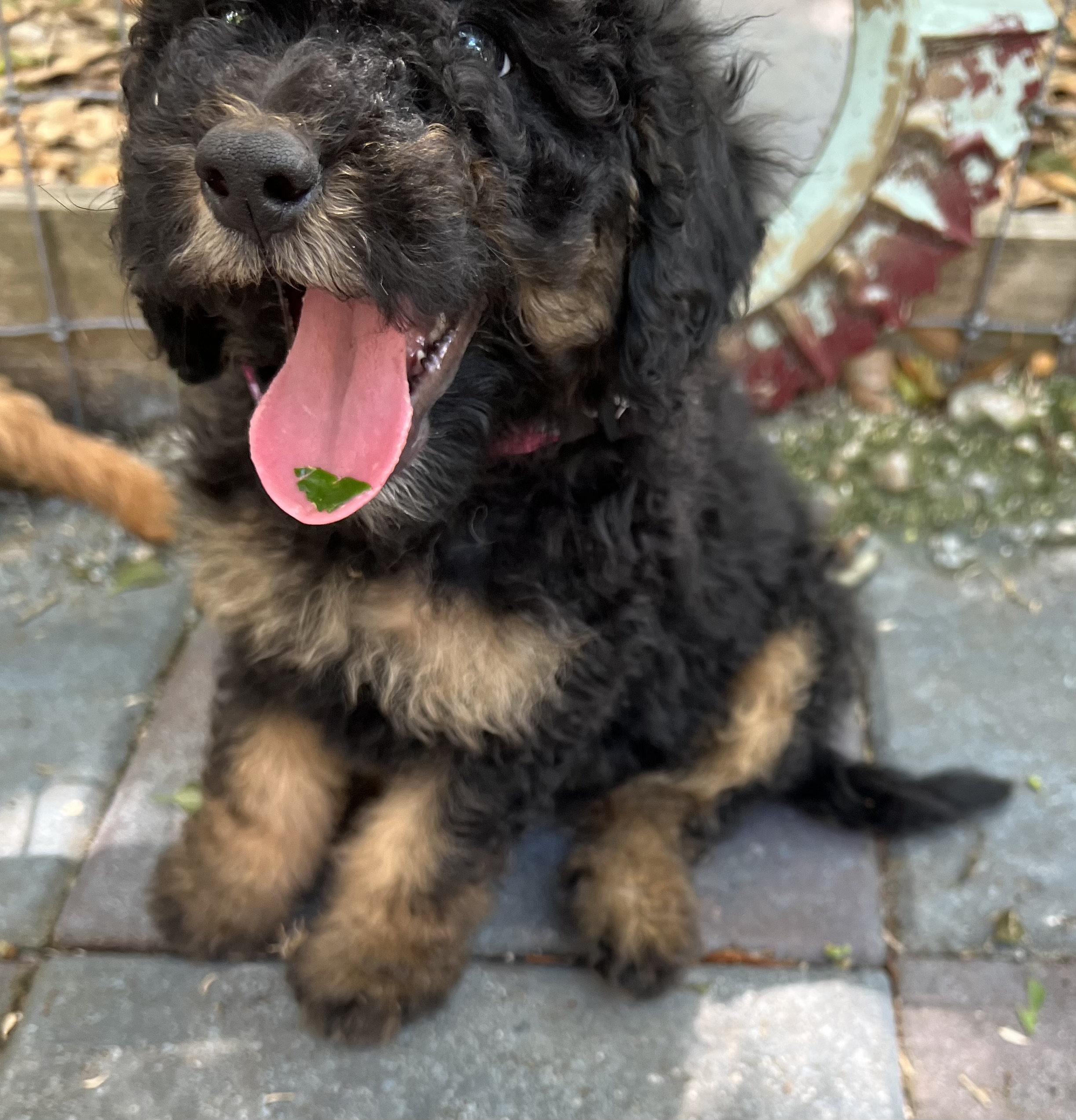 Pending for Mike and son until Friday. : Gorgeous Black Phantom min/medium (28 to 30 pounds full grown) Goldendoodle with a wavy/curly non shedding coat.