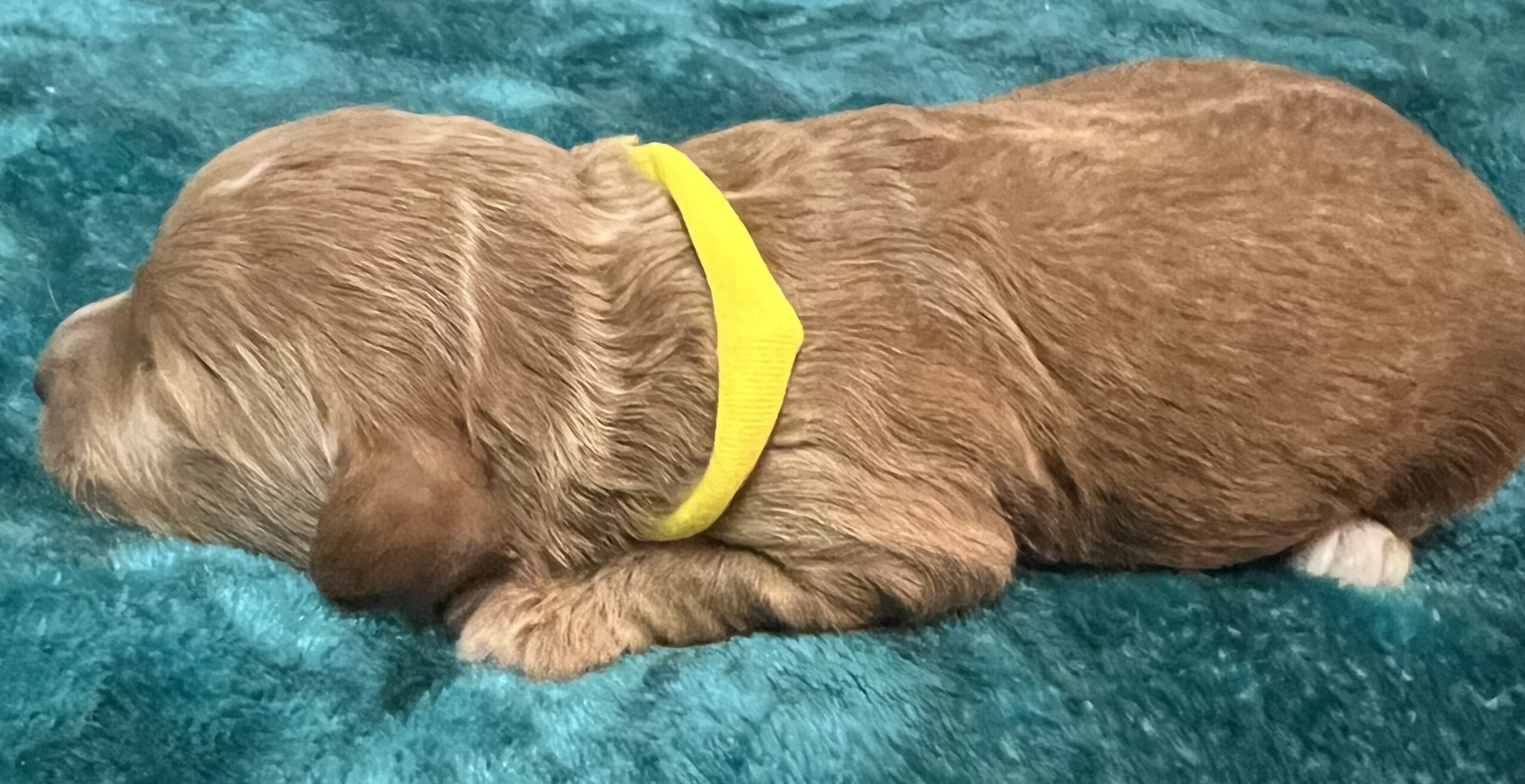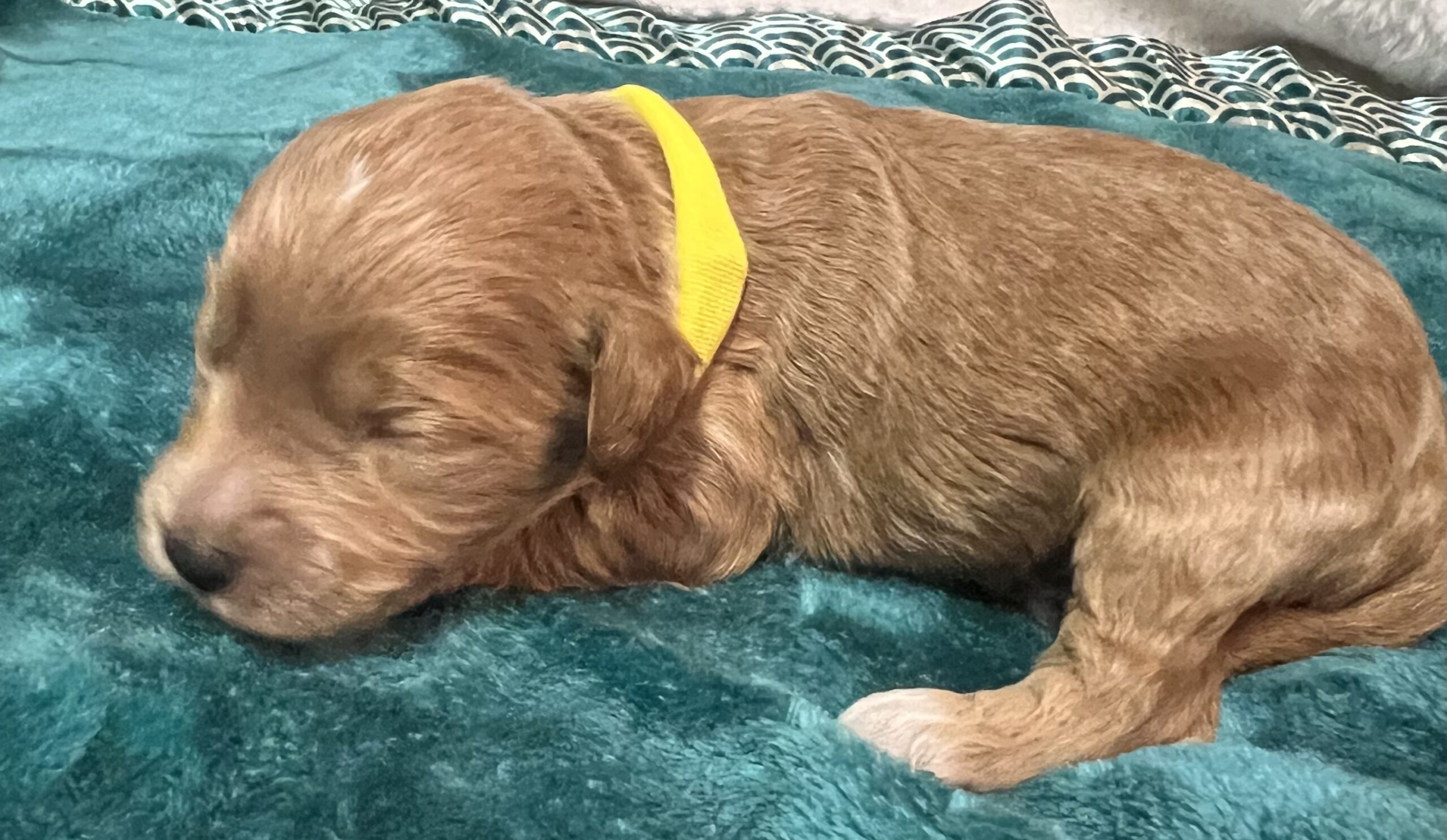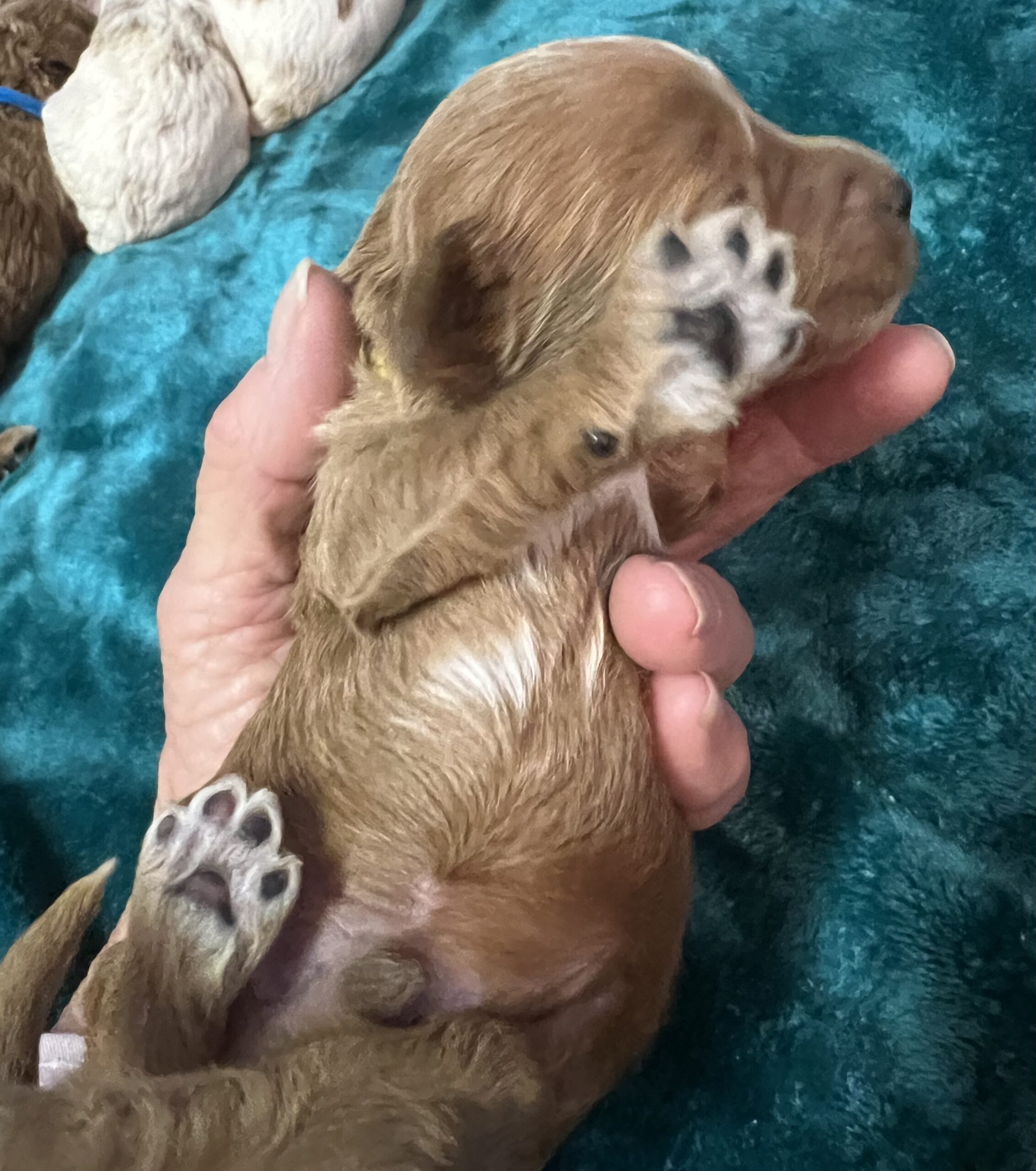 Gorgeous little mini Goldendoodle Boy with a apricot coat with white on toes and chest with very few waves on his non shedding coat! Will average 16 to 30 pounds full grown!
