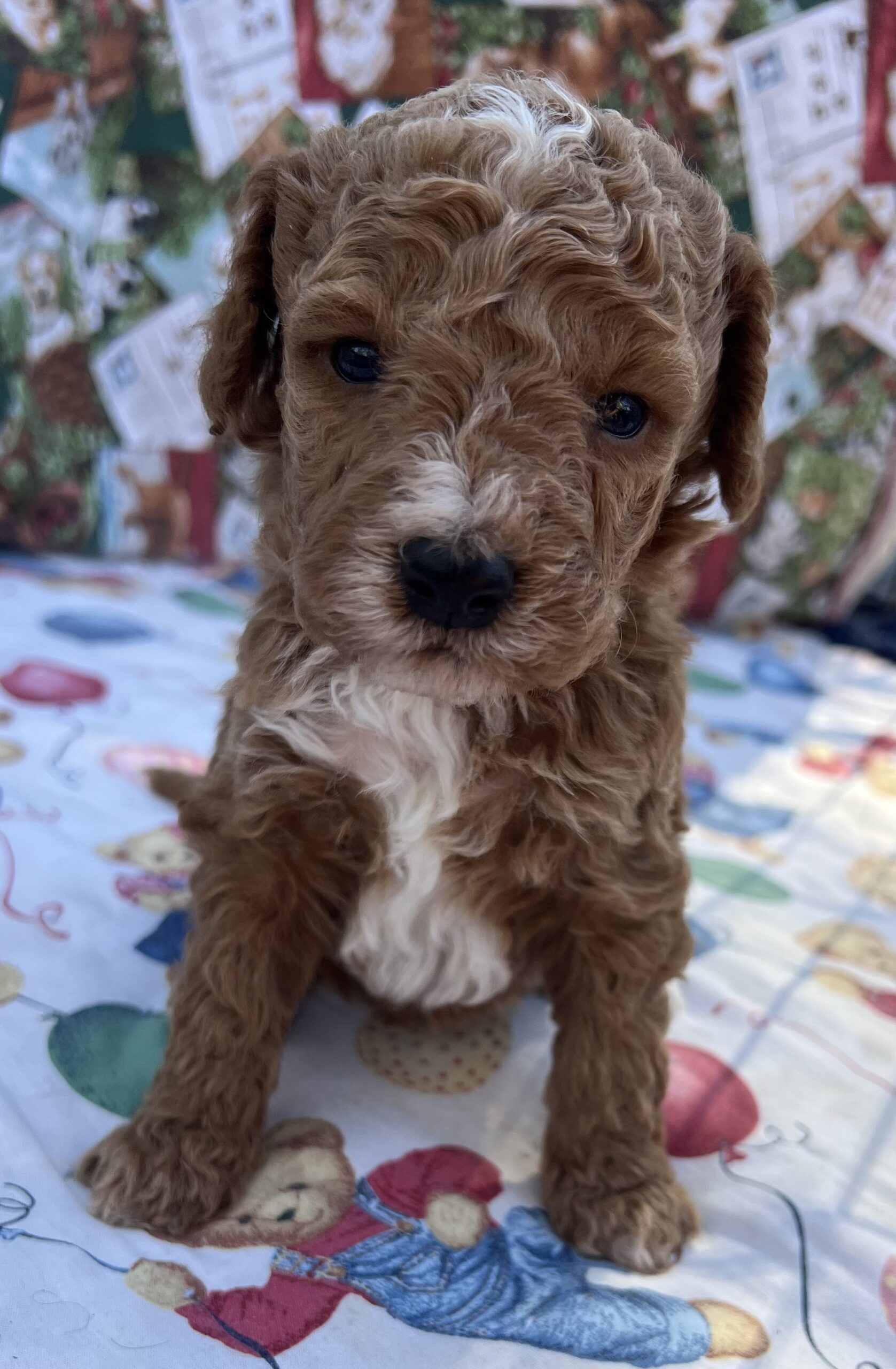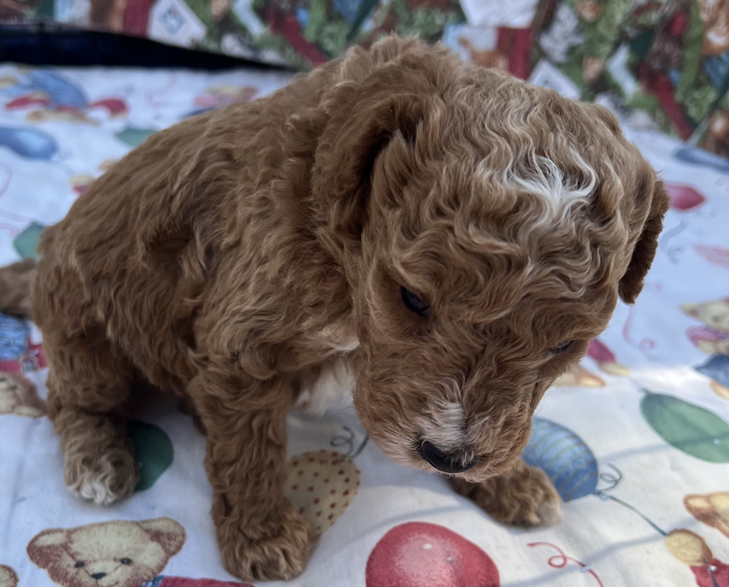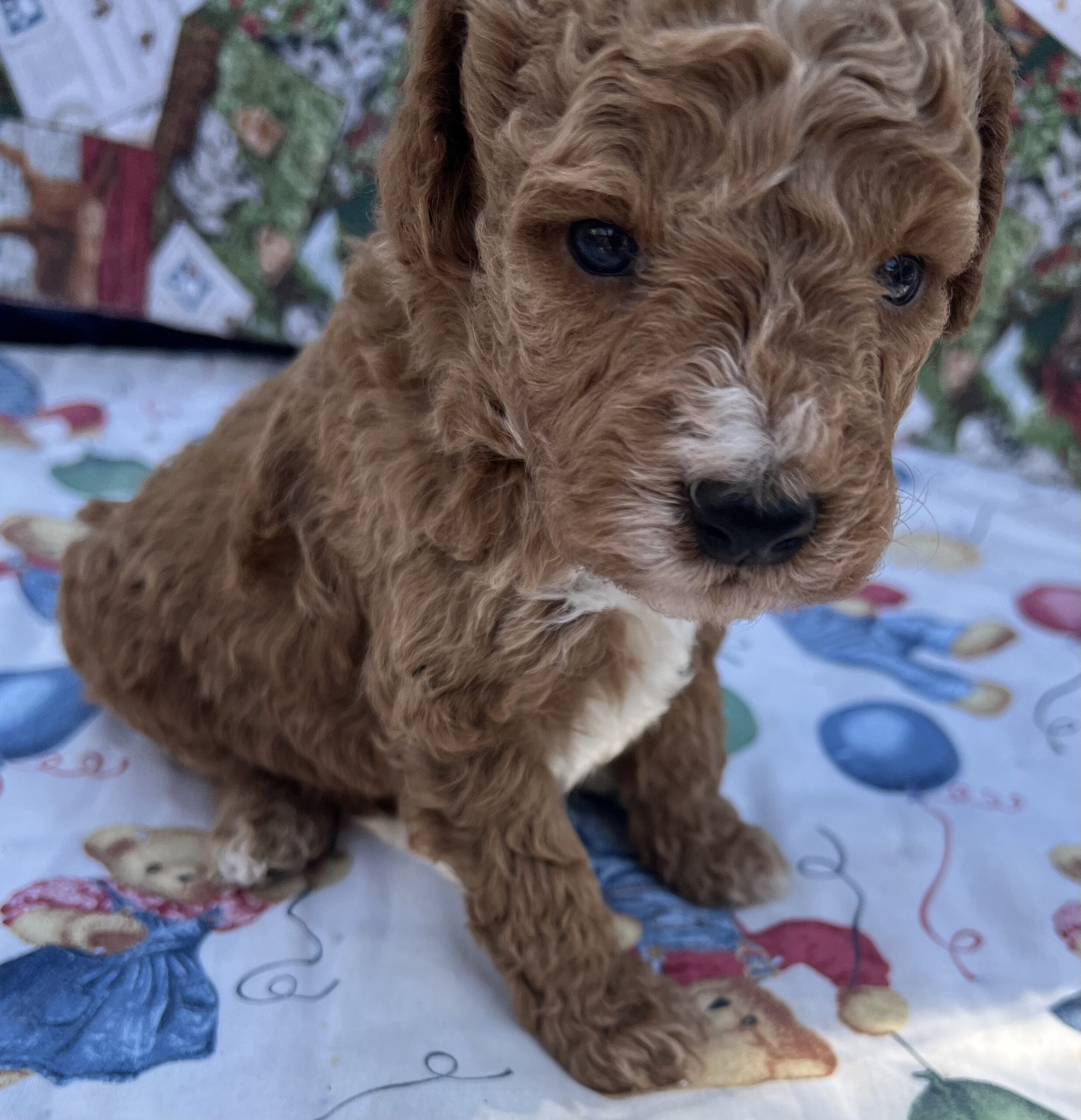 Gorgeous little mini Goldendoodle Boy with a apricot coat with white on toes and chest and a curly non shedding coat! Will average 16 to 30 pounds full grown!