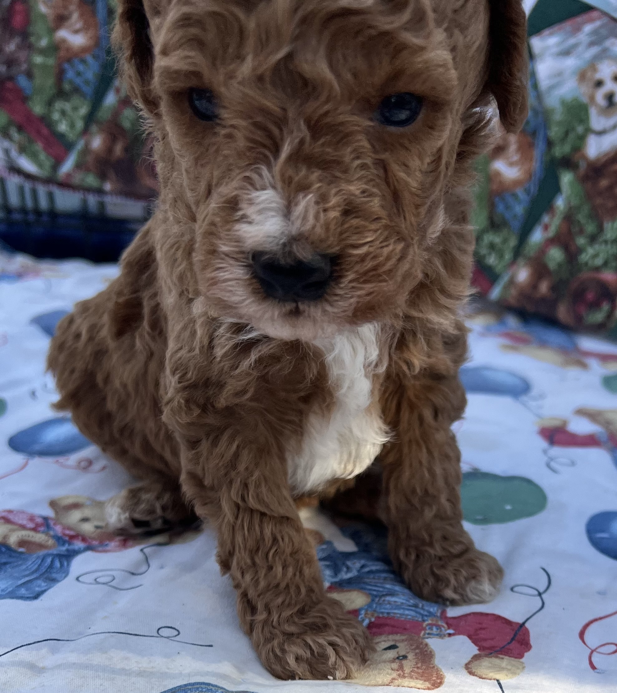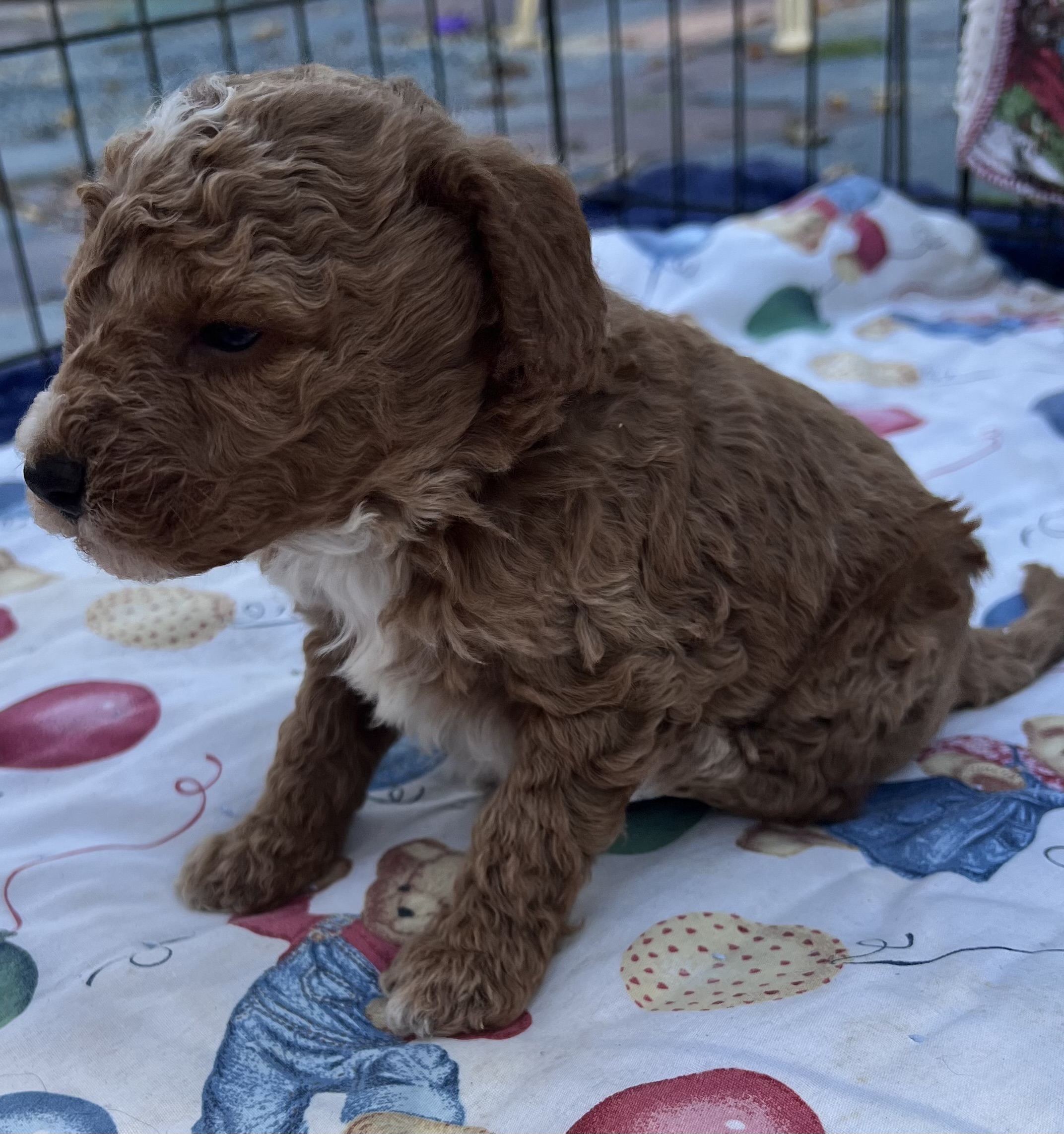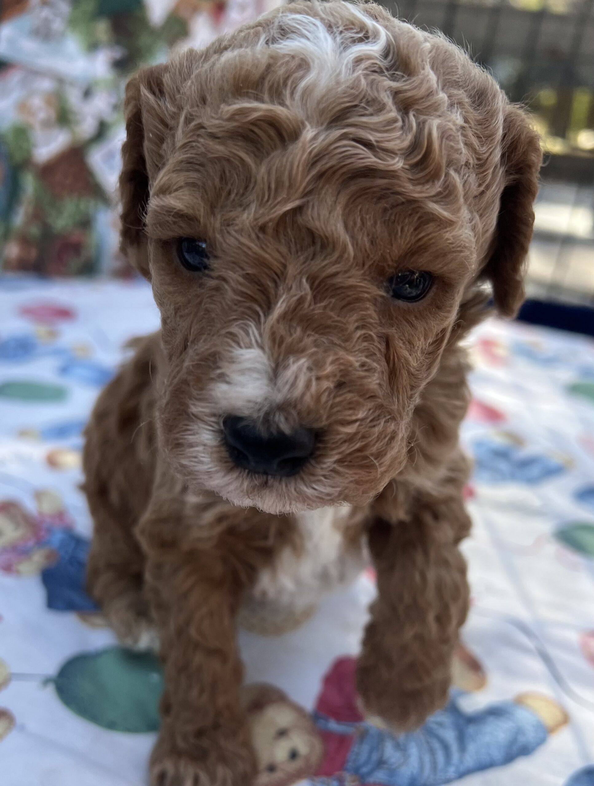 Gorgeous little mini Goldendoodle Boy with a apricot coat with white on toes and chest and a curly non shedding coat! Will average 16 to 30 pounds full grown!