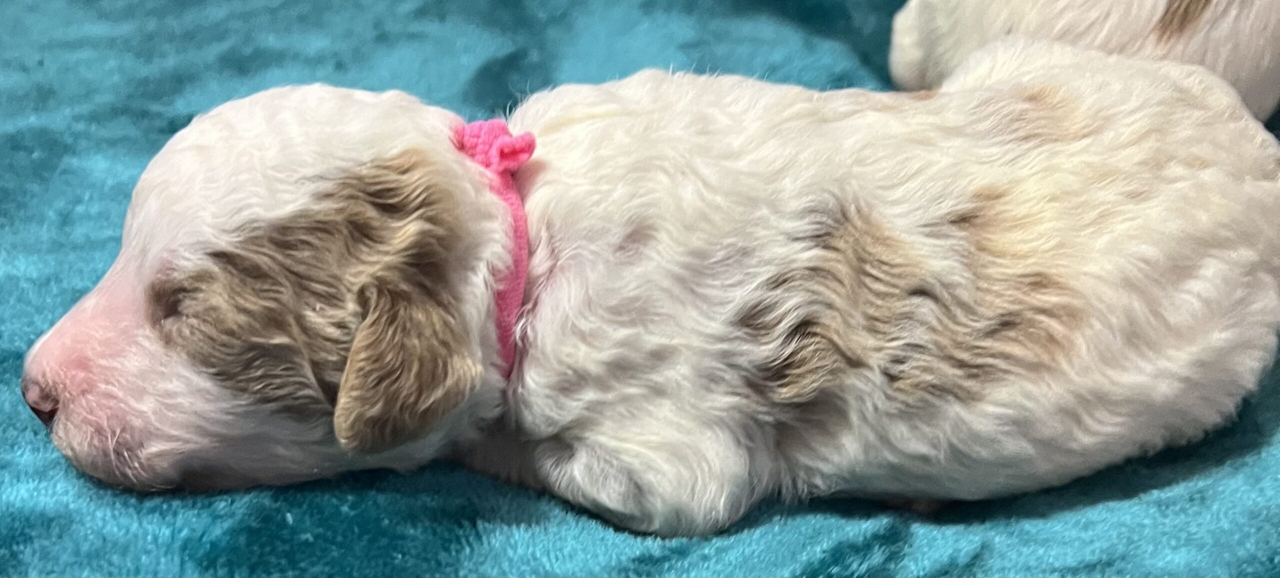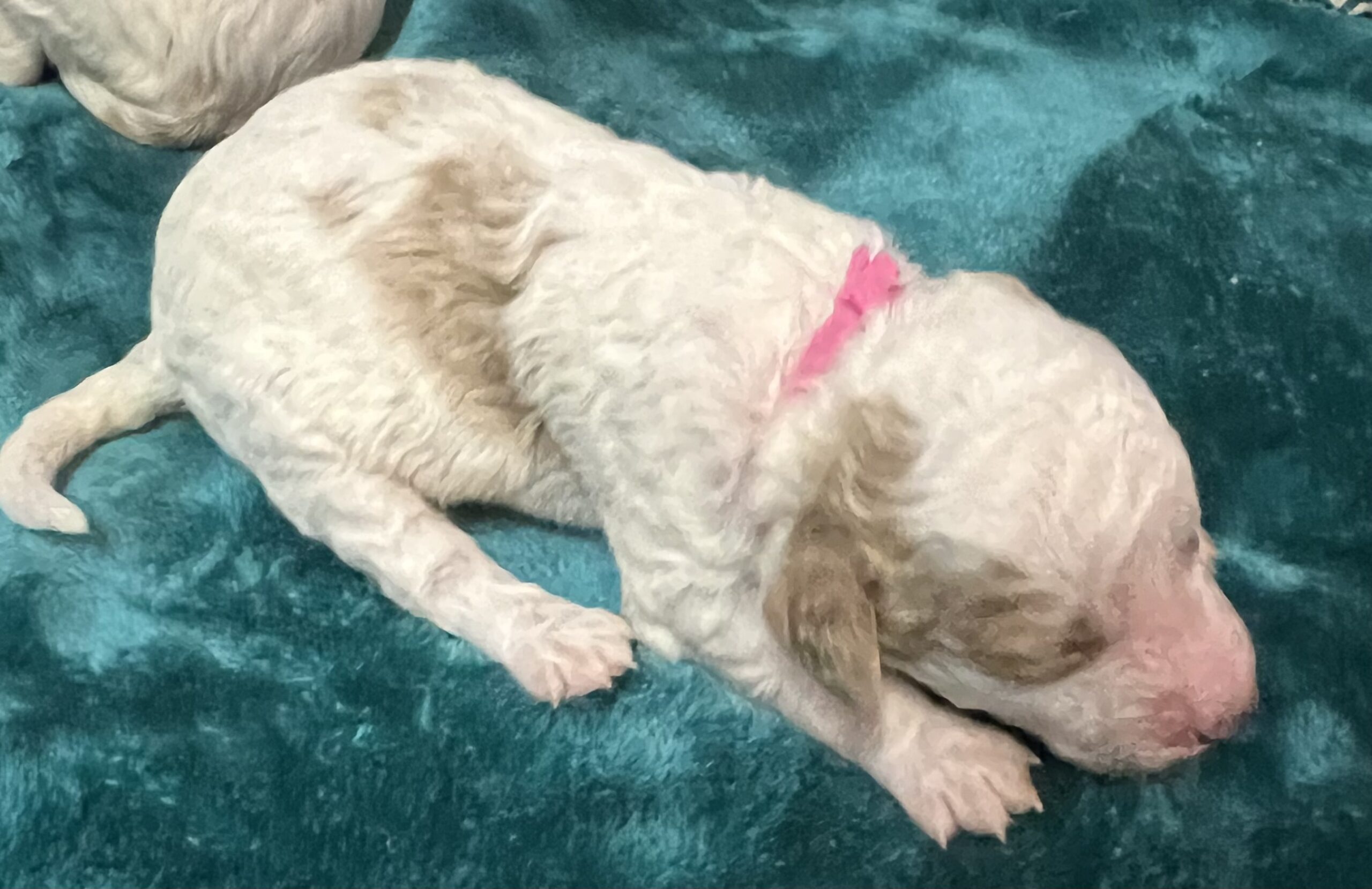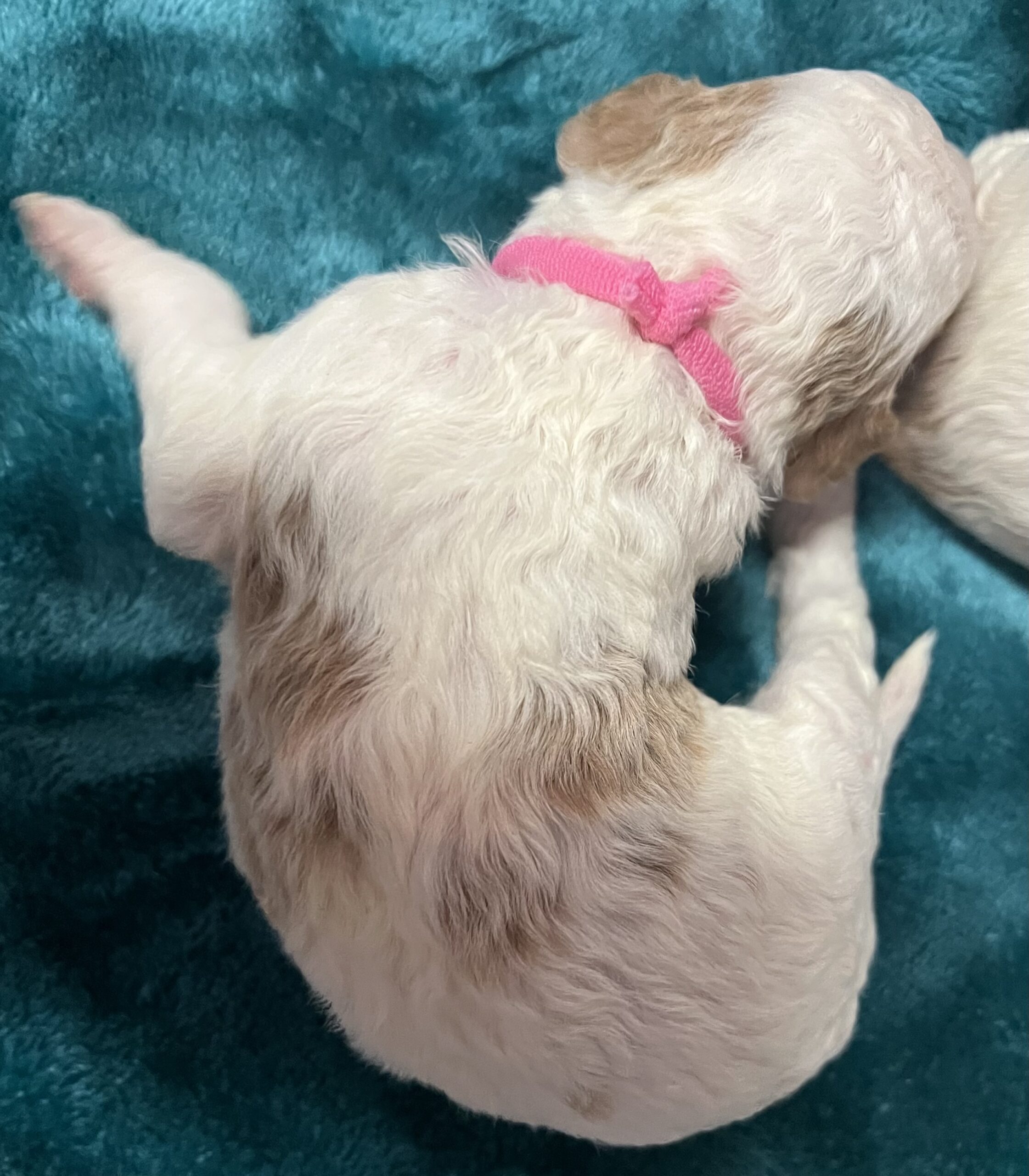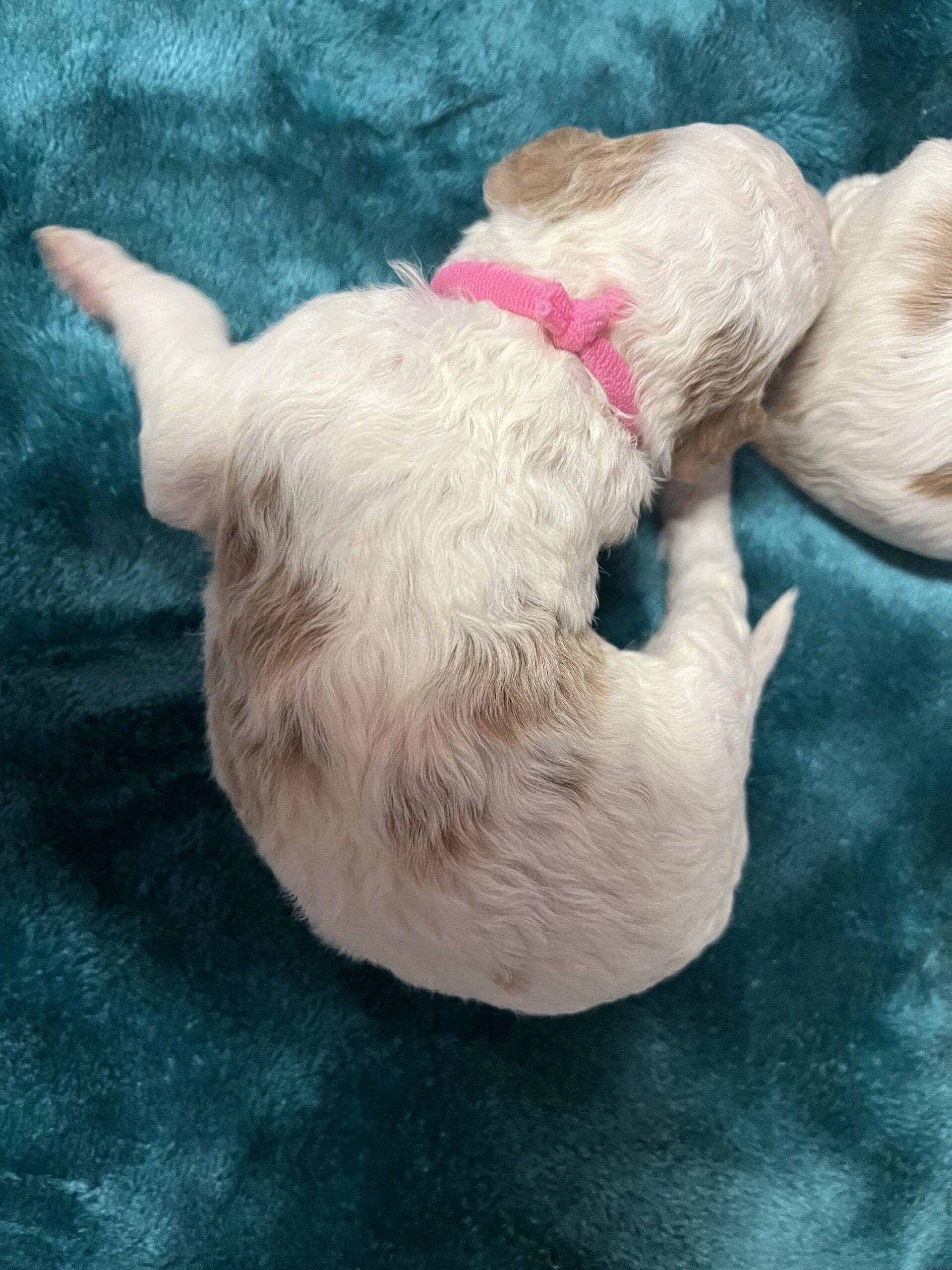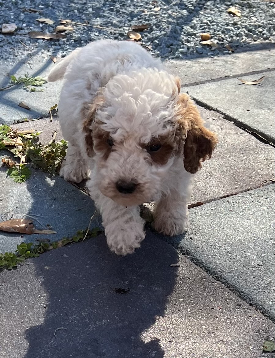 Gorgeous little mini Goldendoodle Girl with a apricot Parti (white with apricot markings) with a curly non shedding coat! Will average 16 to 30 pounds full grown!
