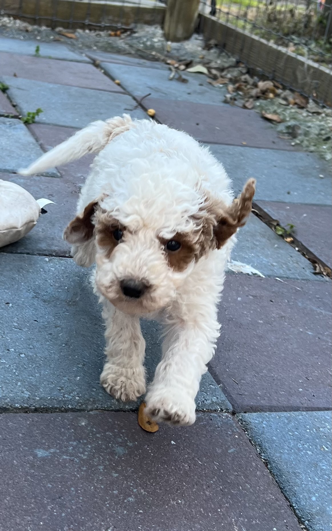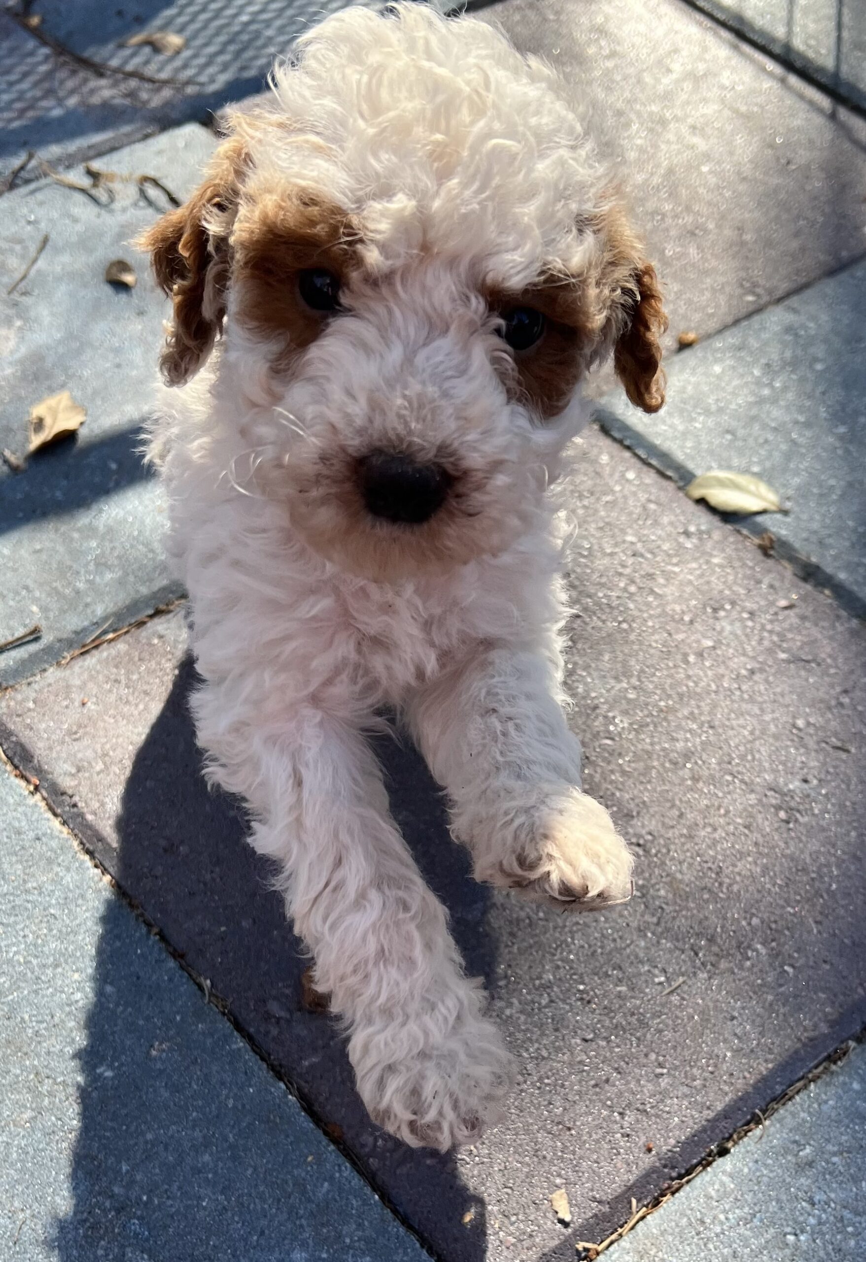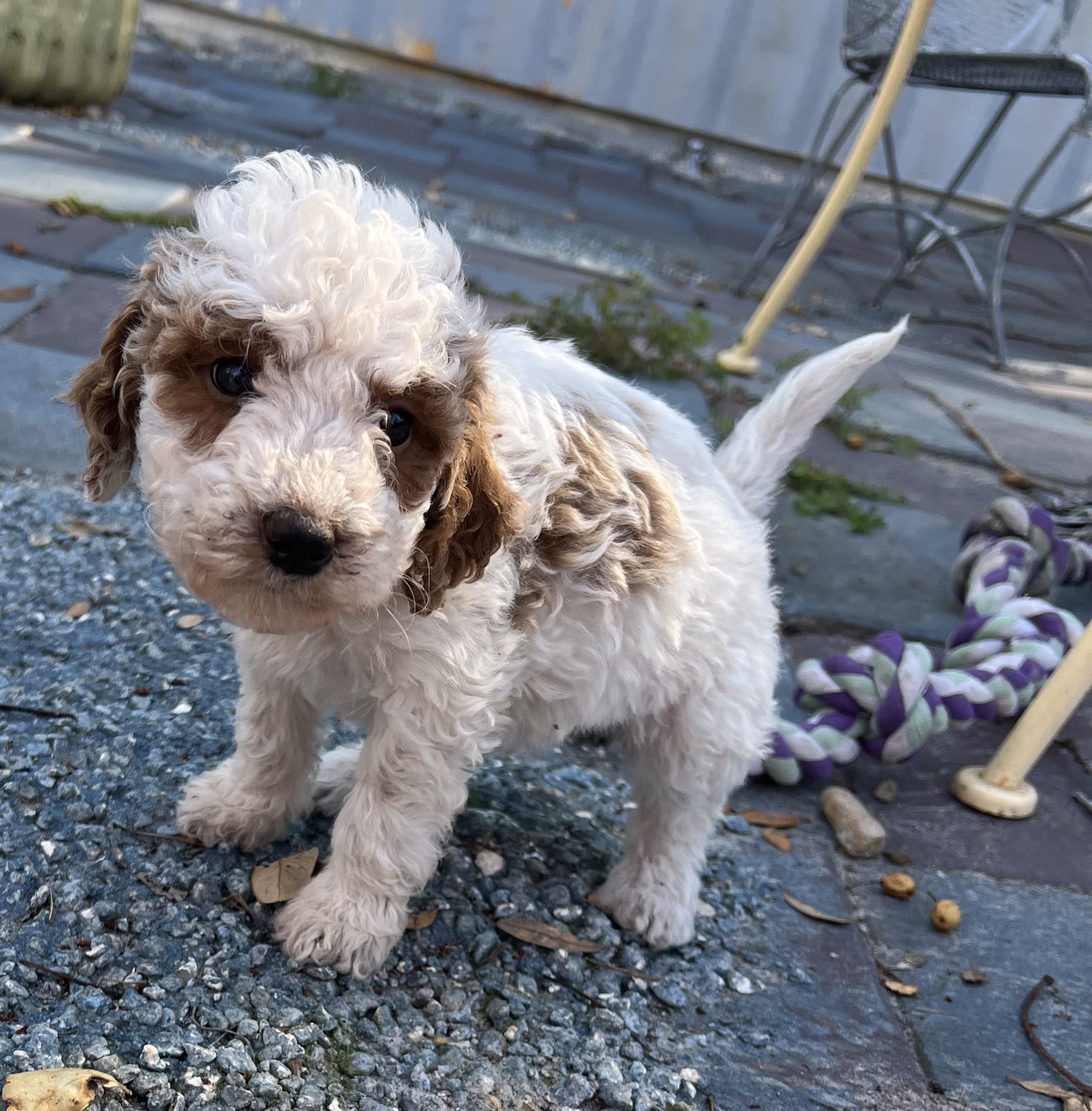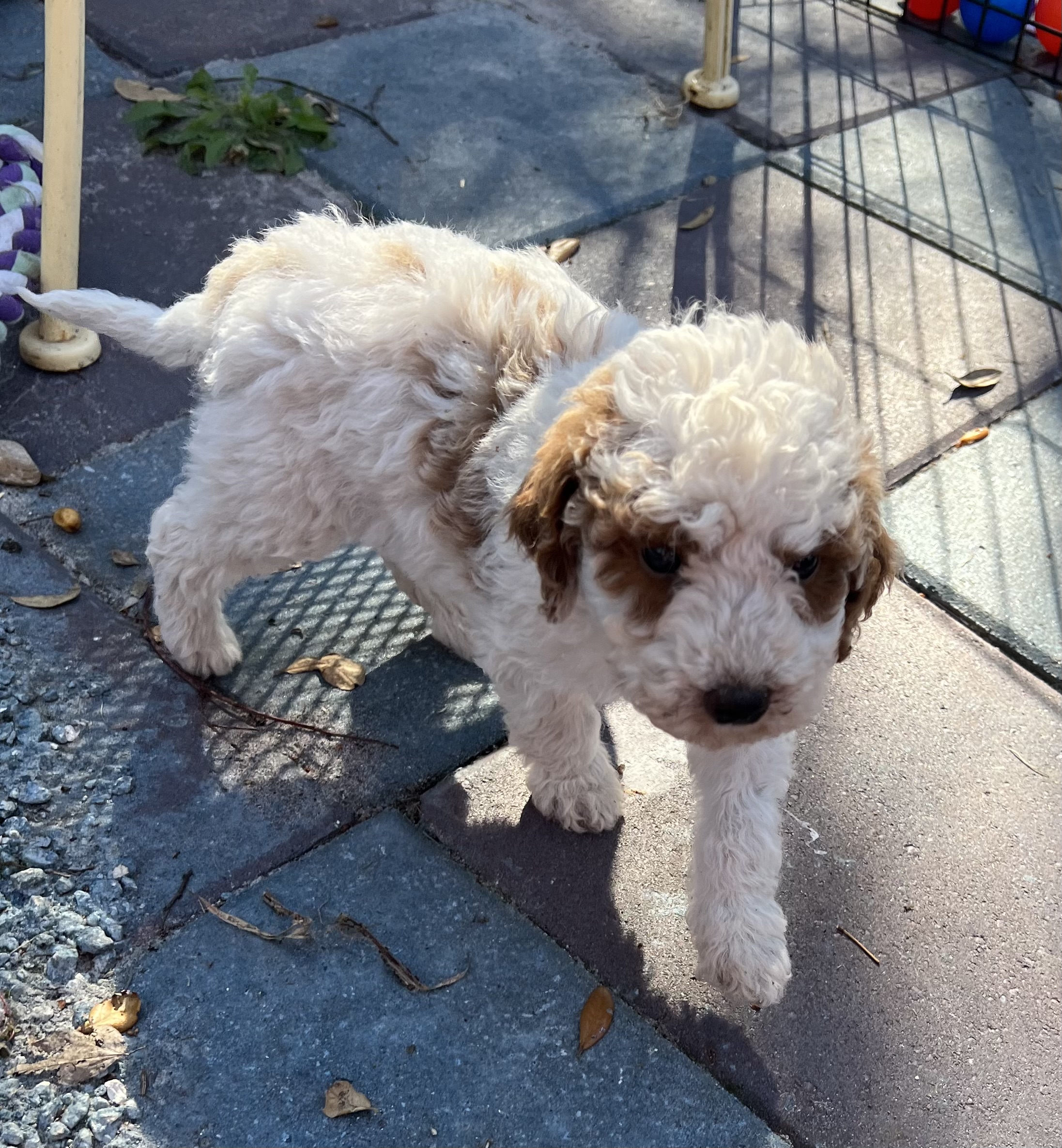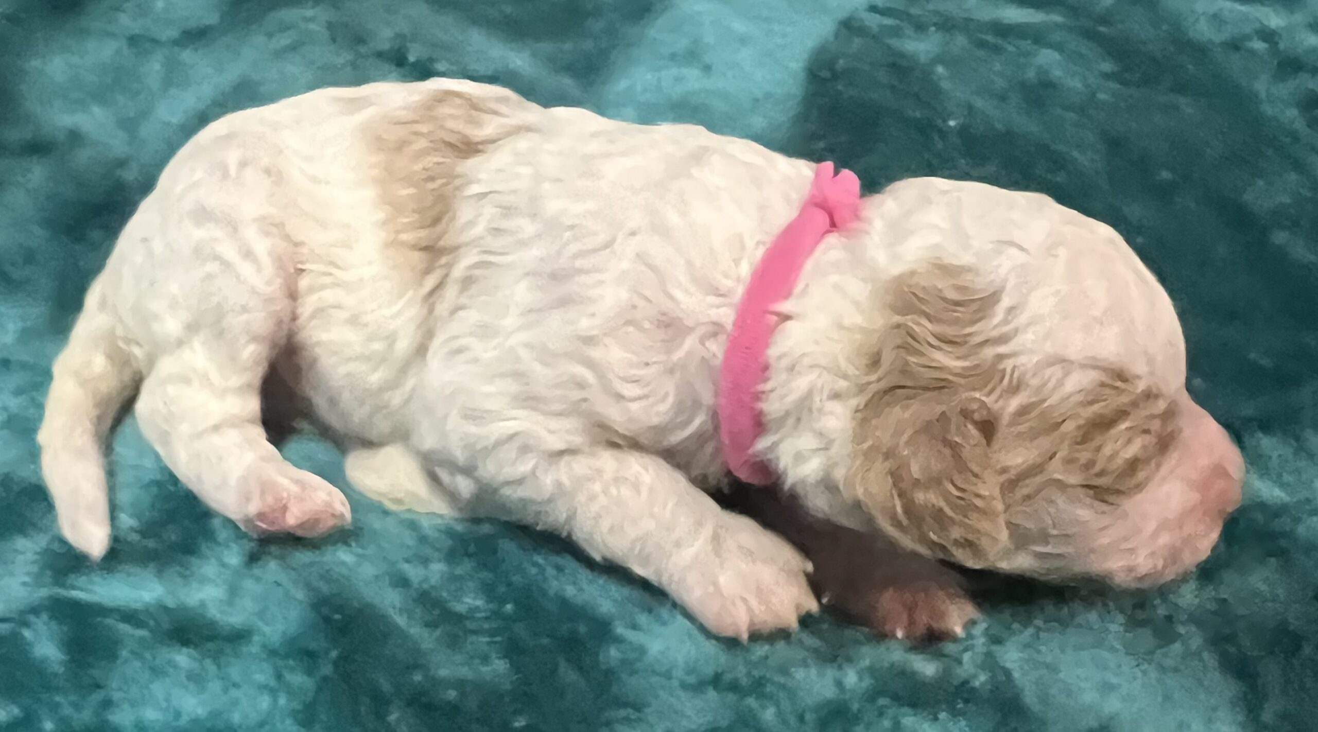 Gorgeous little mini Goldendoodle Girl with a apricot Parti (white with apricot markings) with a curly non shedding coat! Will average 16 to 30 pounds full grown!