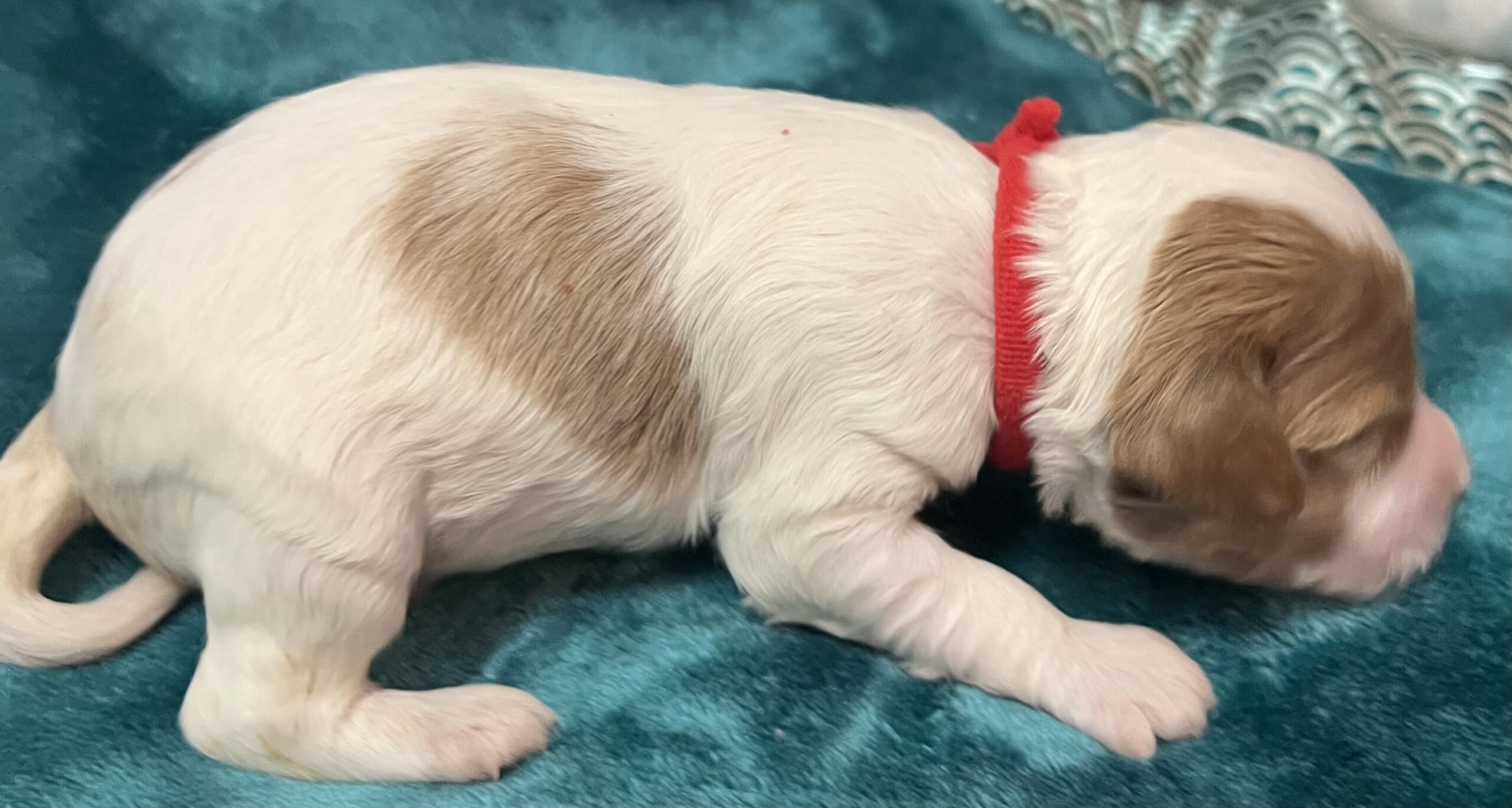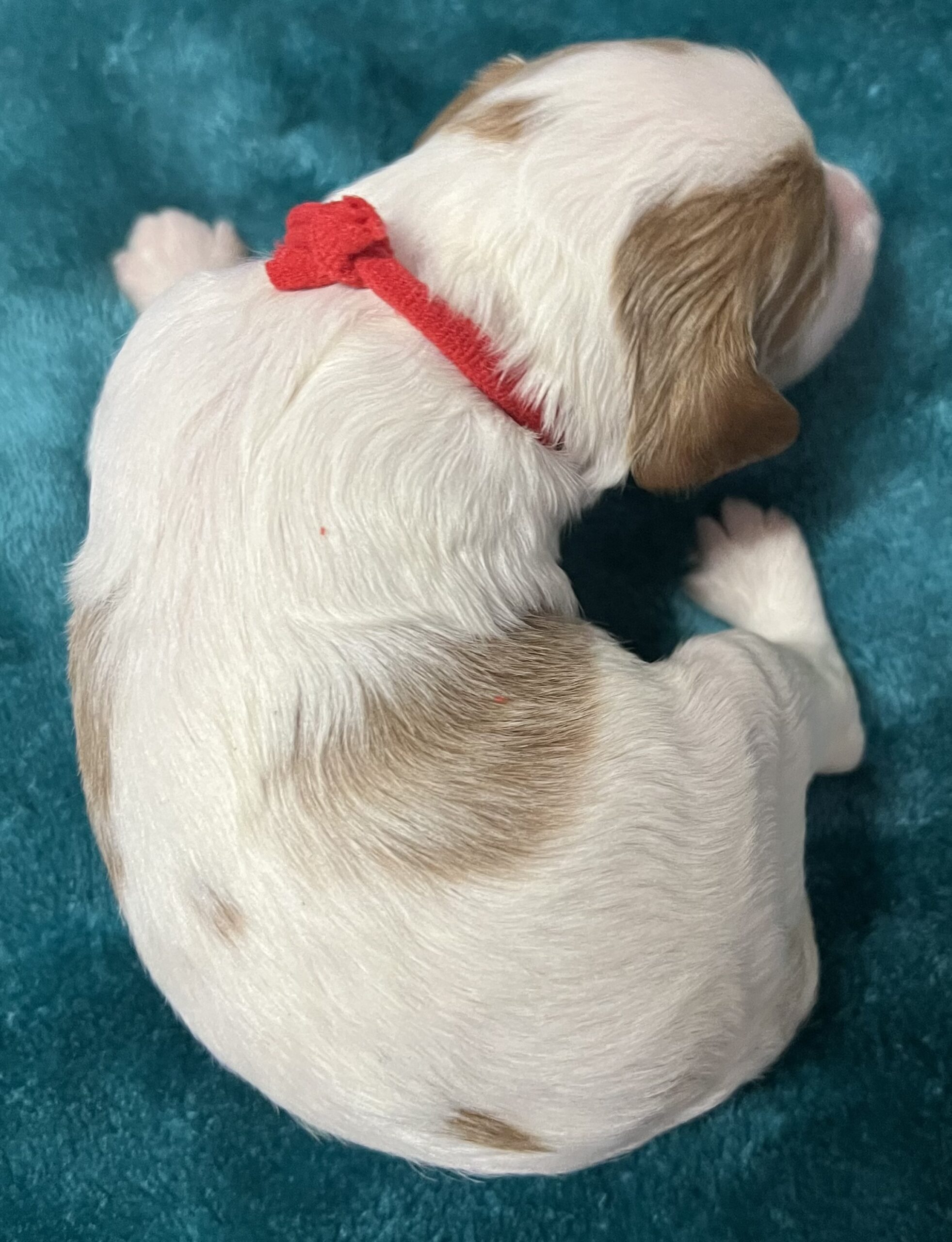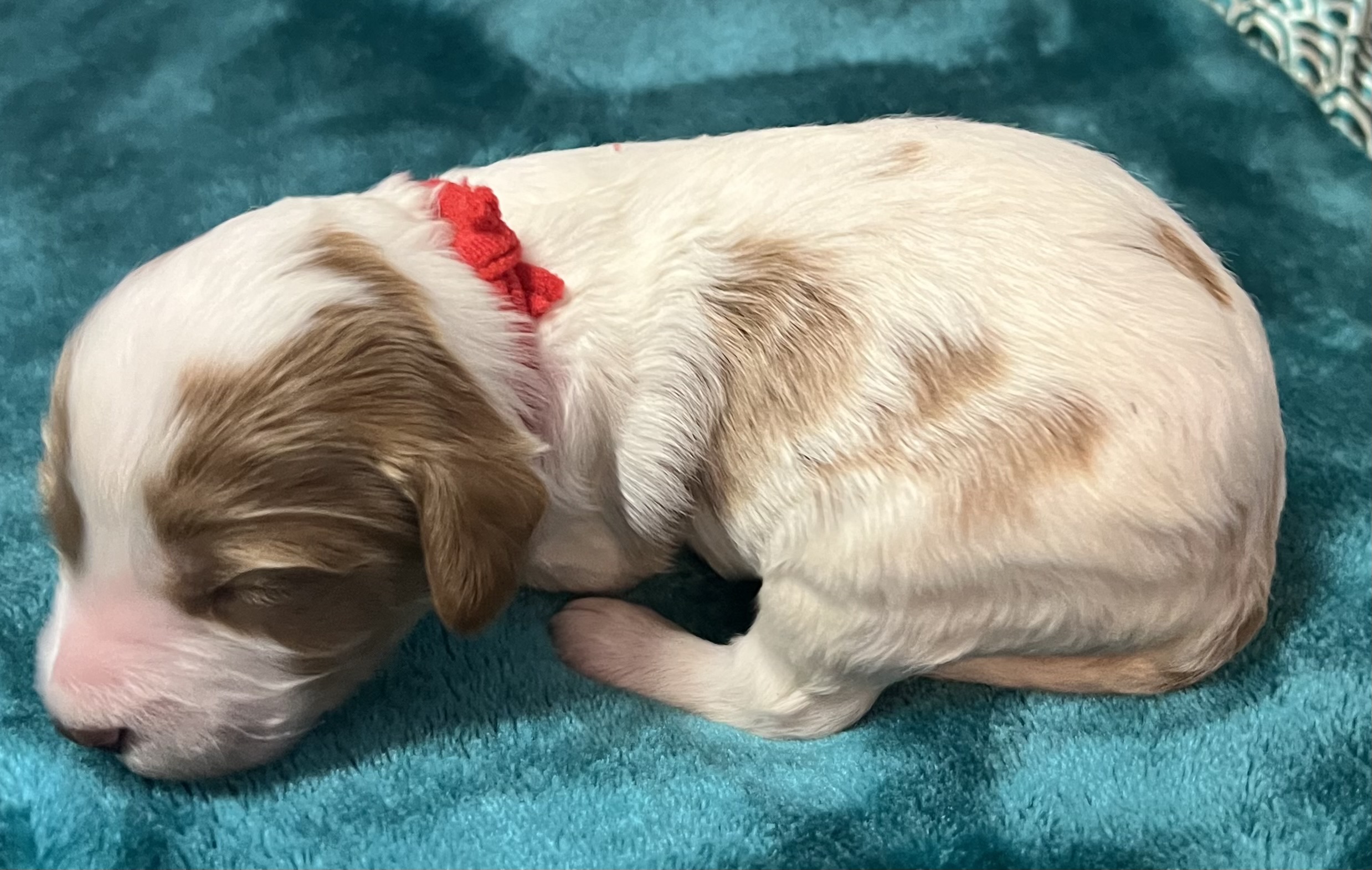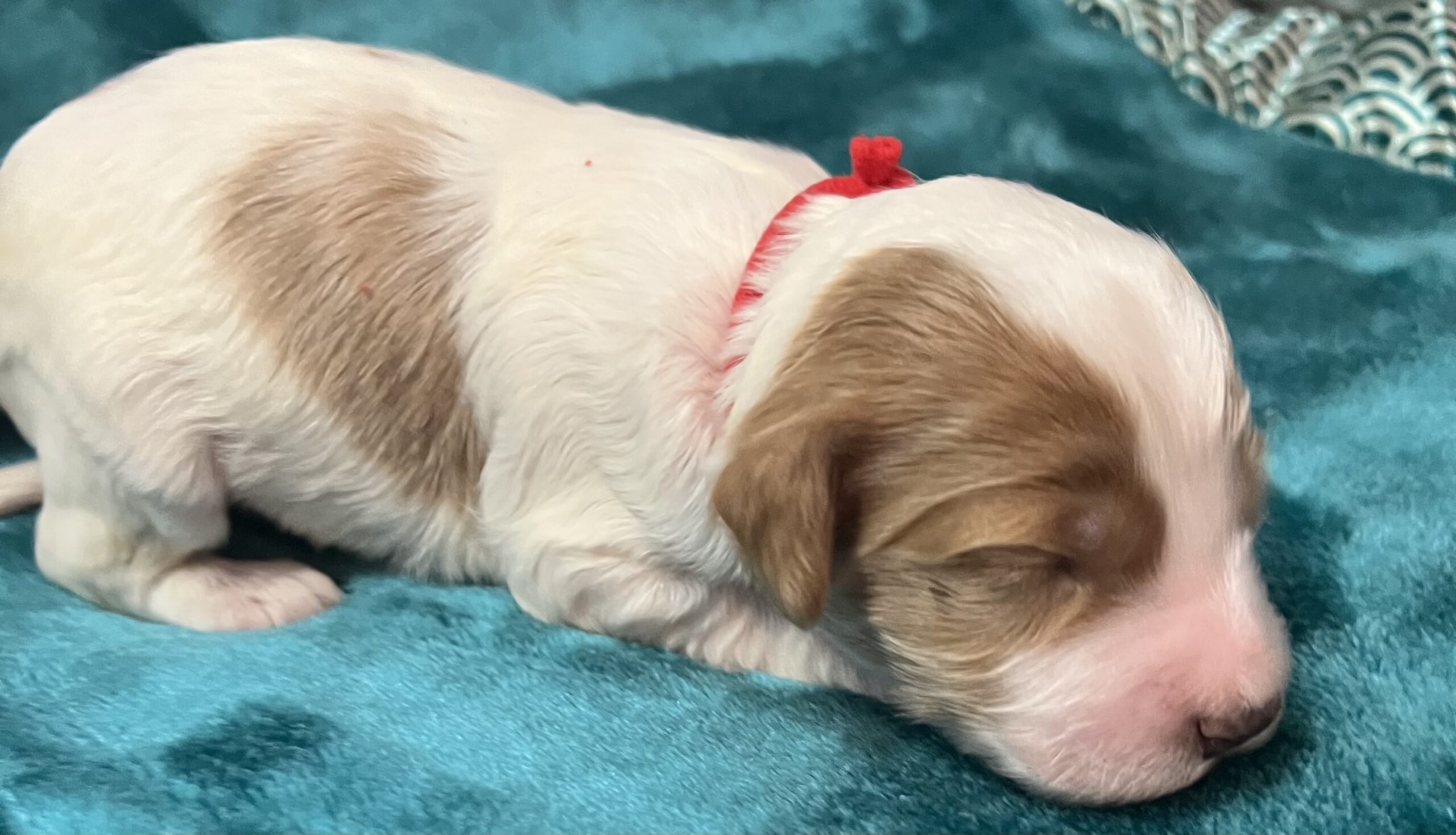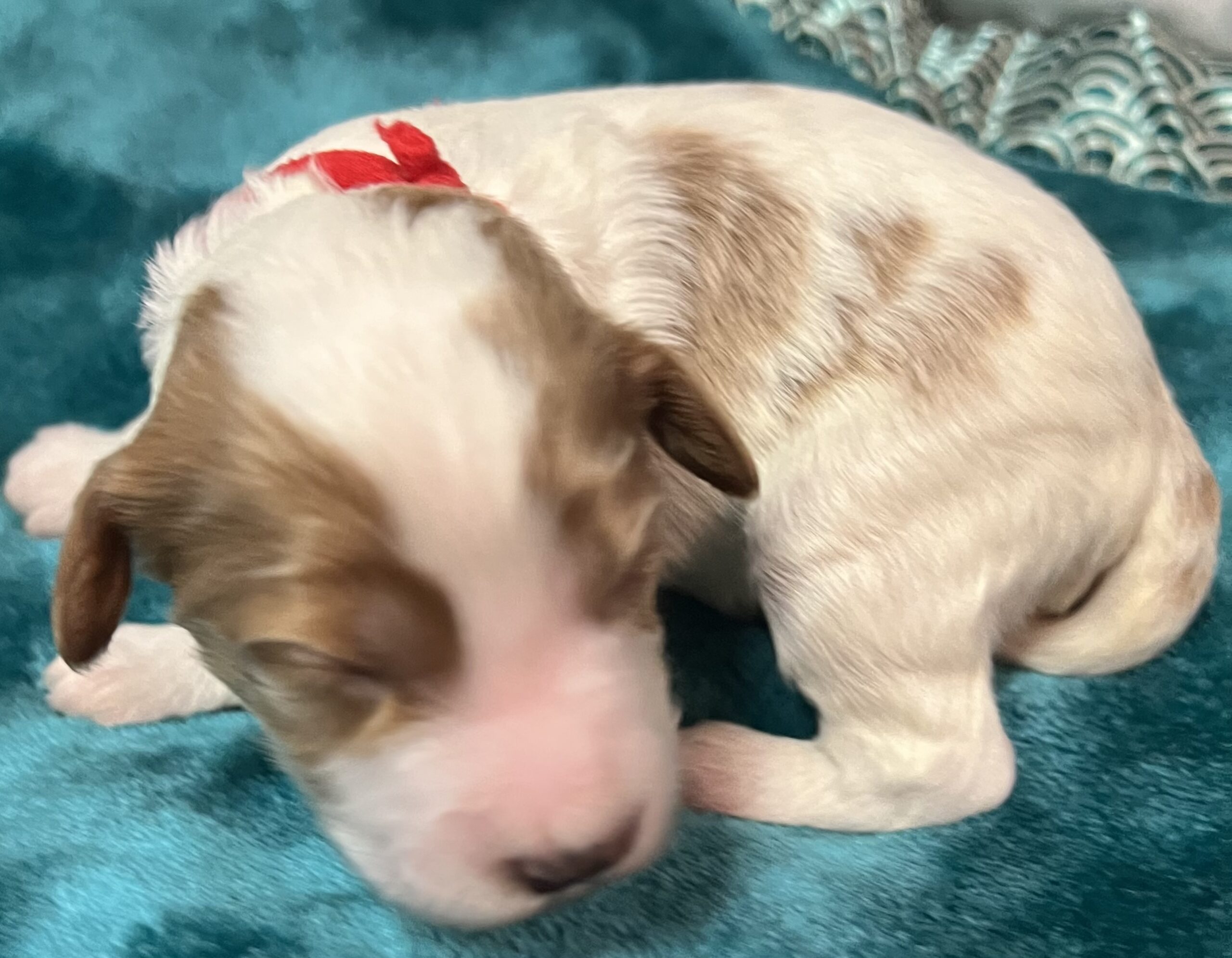 Gorgeous little mini Goldendoodle Boy with a apricot Parti (white with apricot markings) with few waves on his non shedding coat! Will average 16 to 30 pounds full grown!