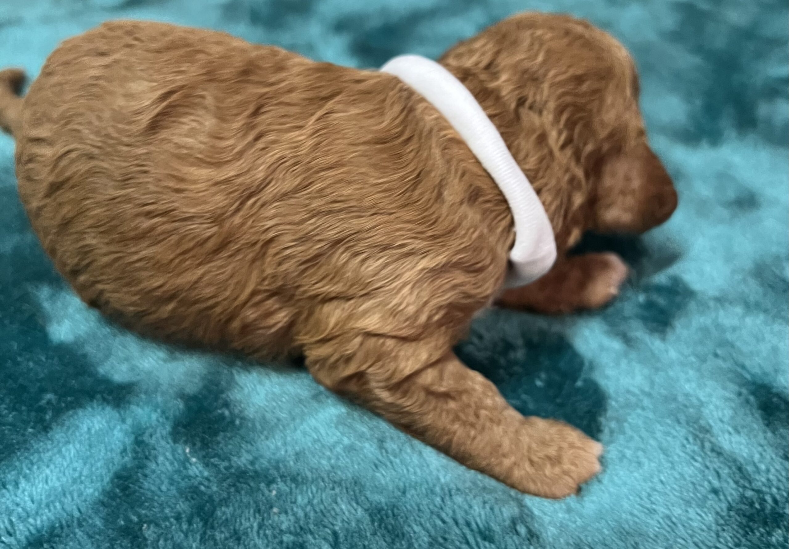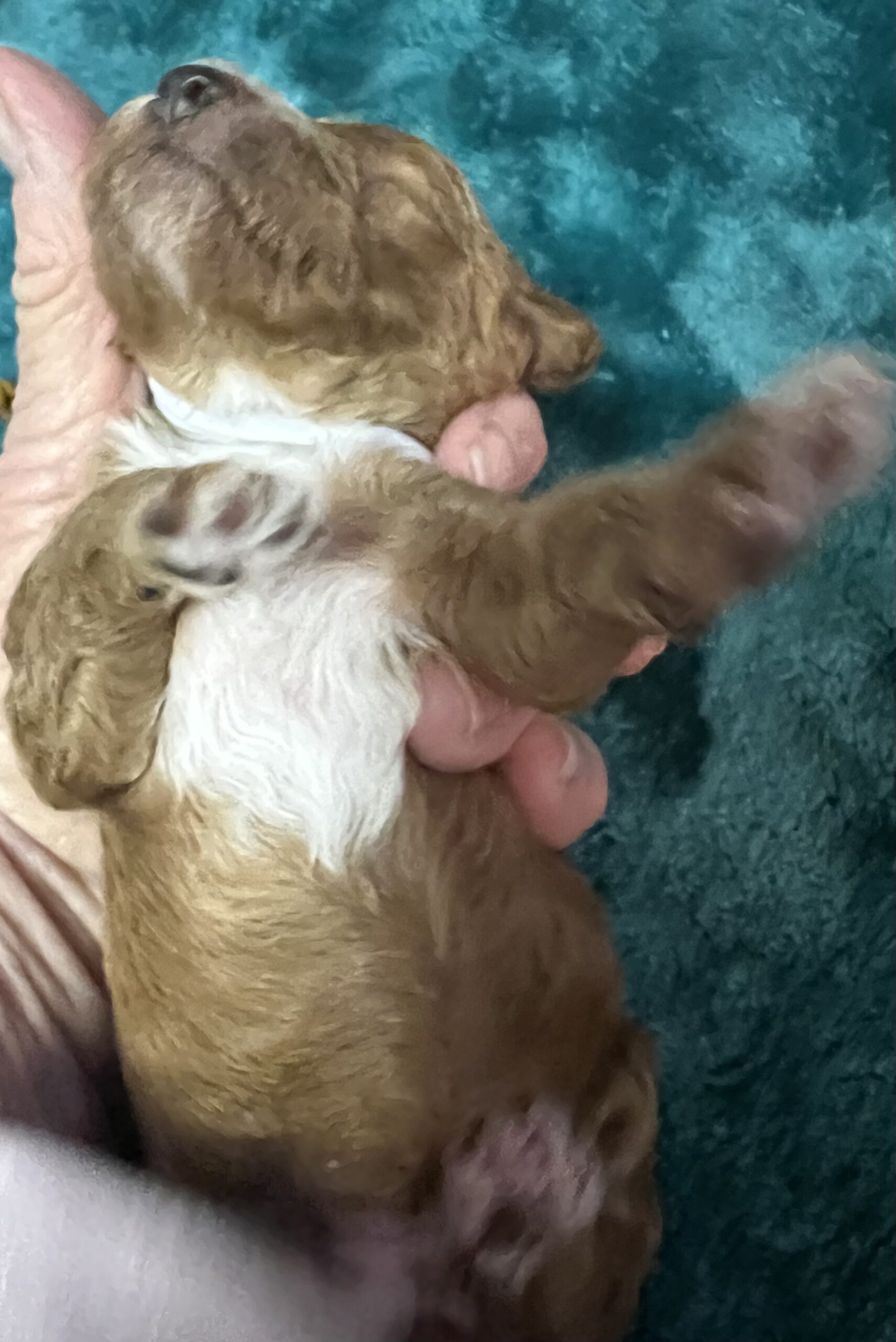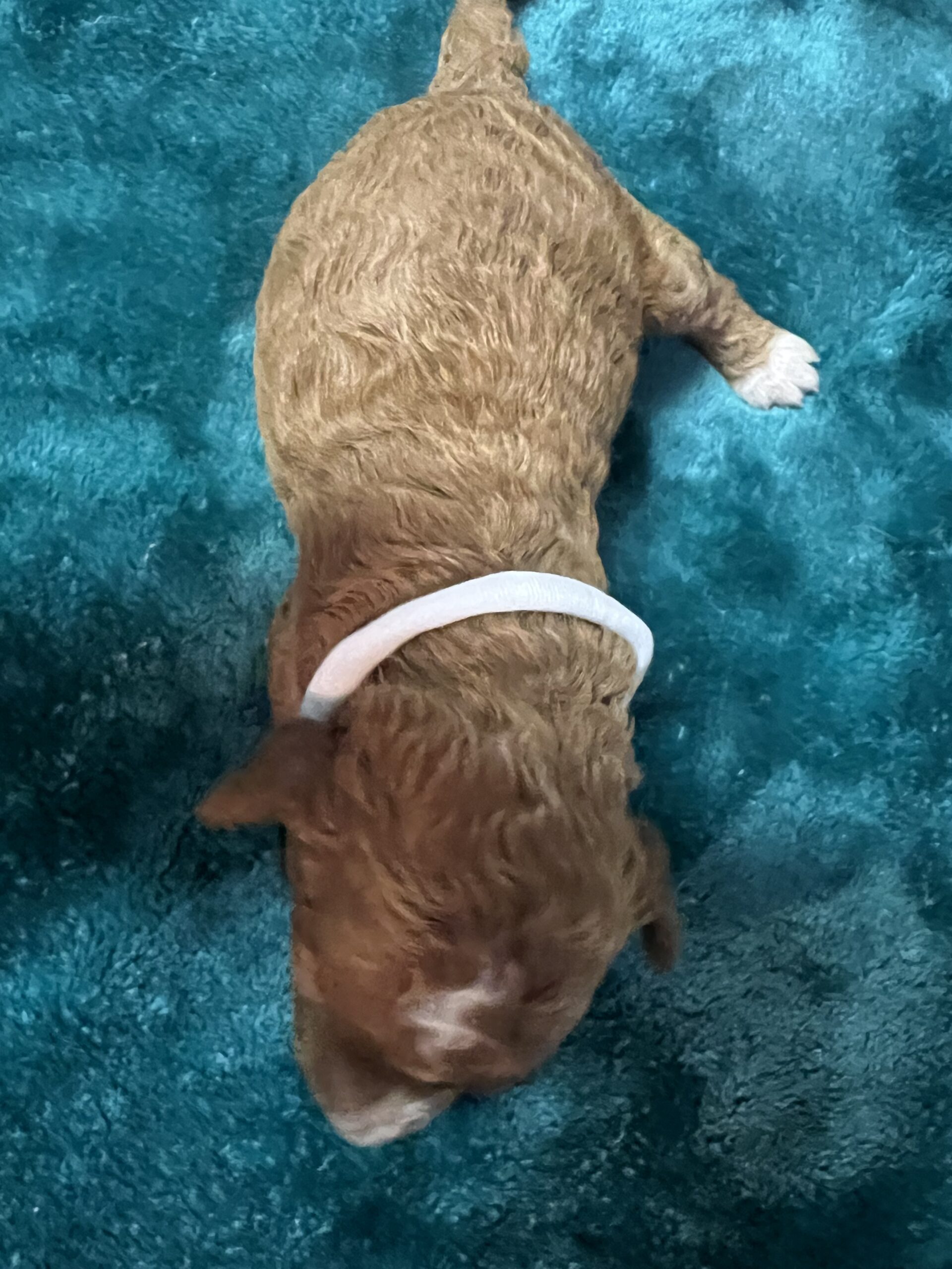 Gorgeous little mini Goldendoodle Girl with a apricot coat with white on toes and chest and a curly non shedding coat! Will average 16 to 30 pounds full grown!
