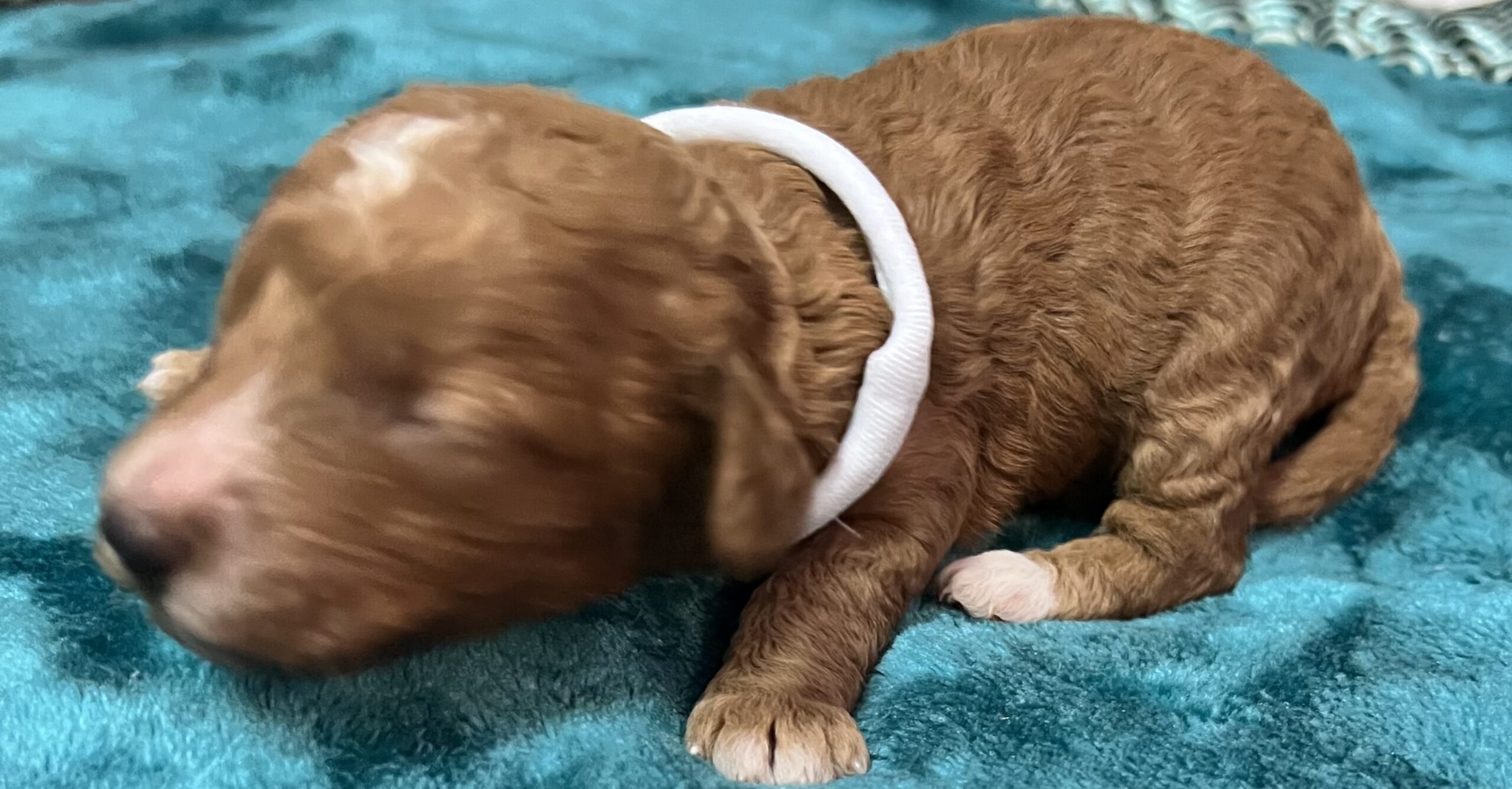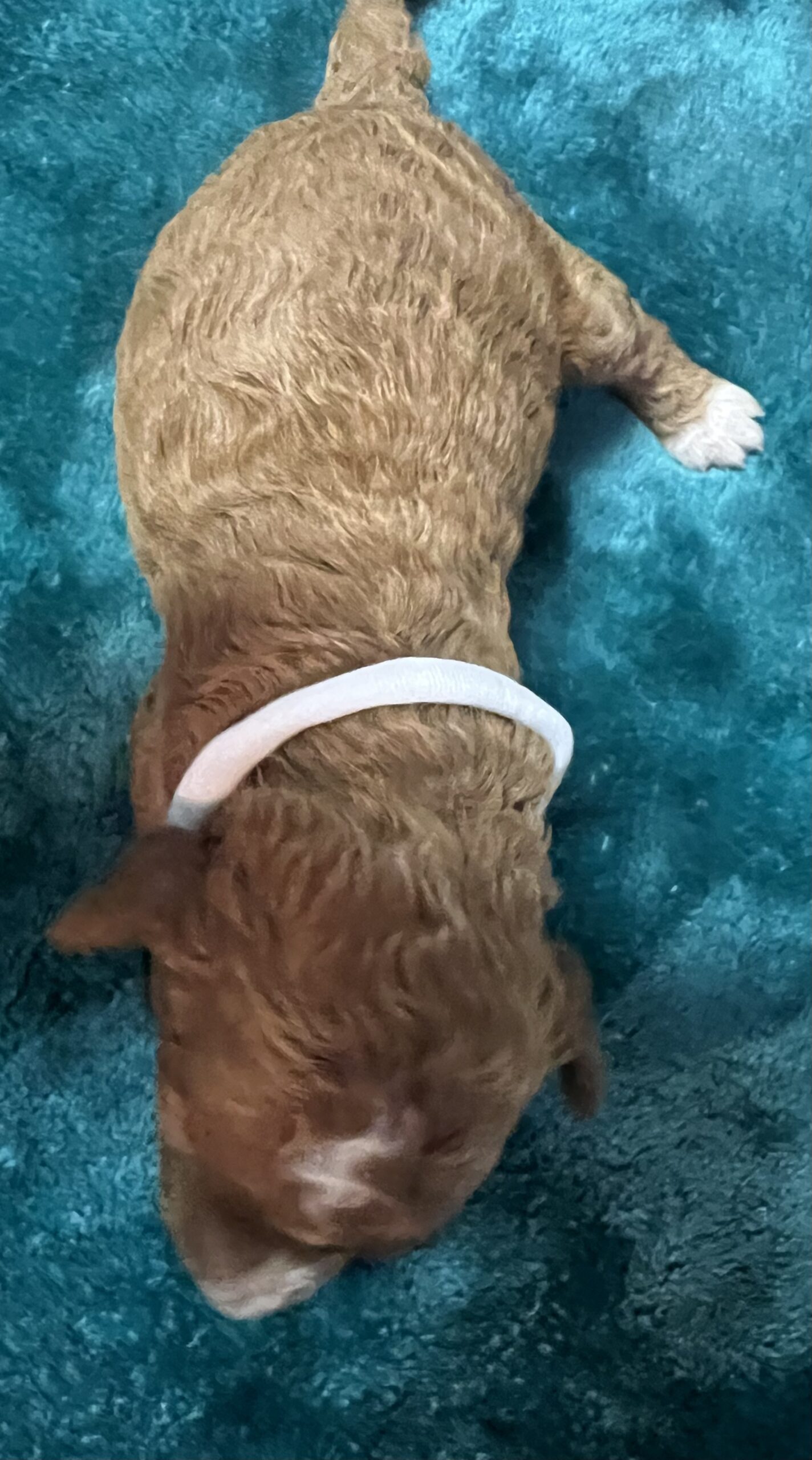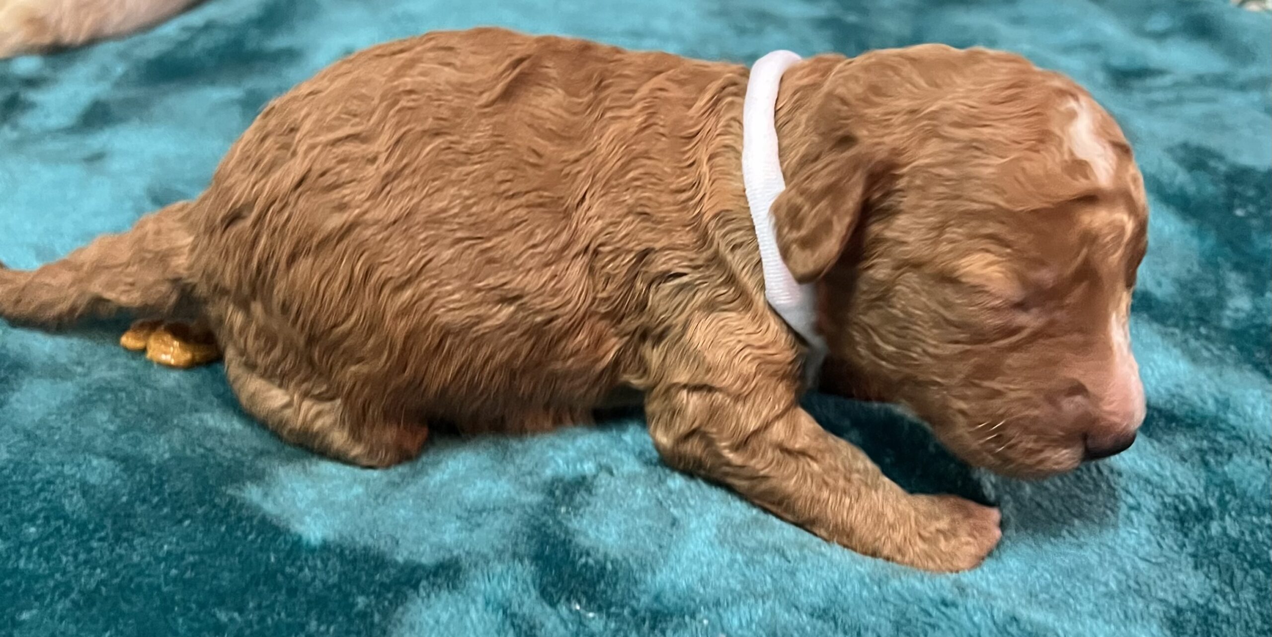 Gorgeous little mini Goldendoodle Girl with a apricot coat with white on toes and chest and a curly non shedding coat! Will average 16 to 30 pounds full grown!